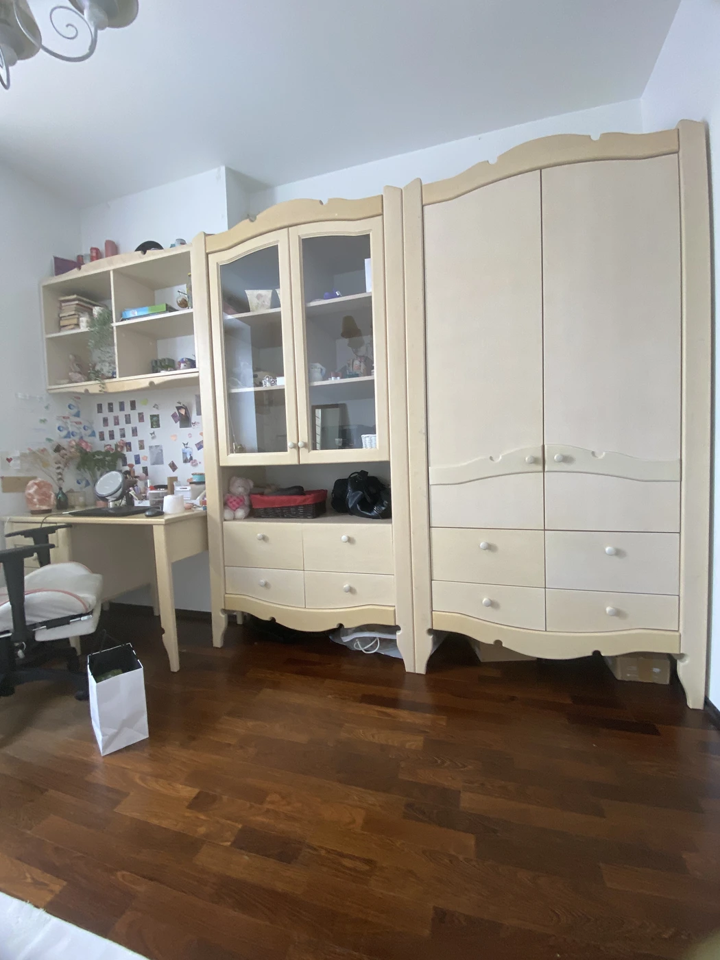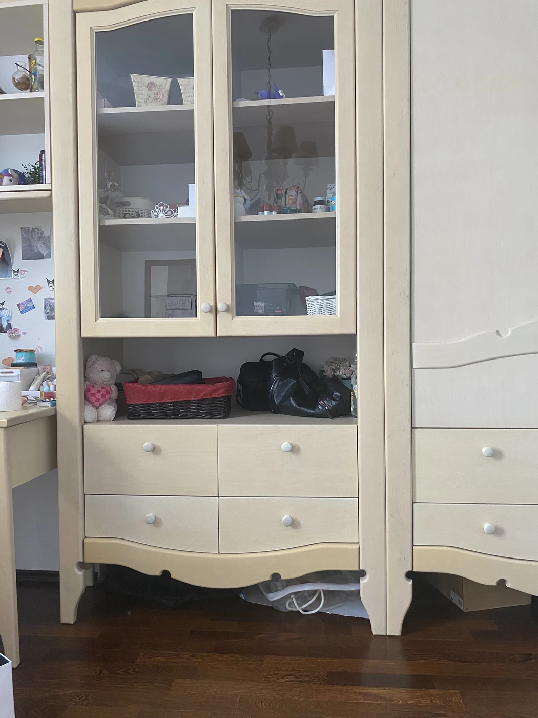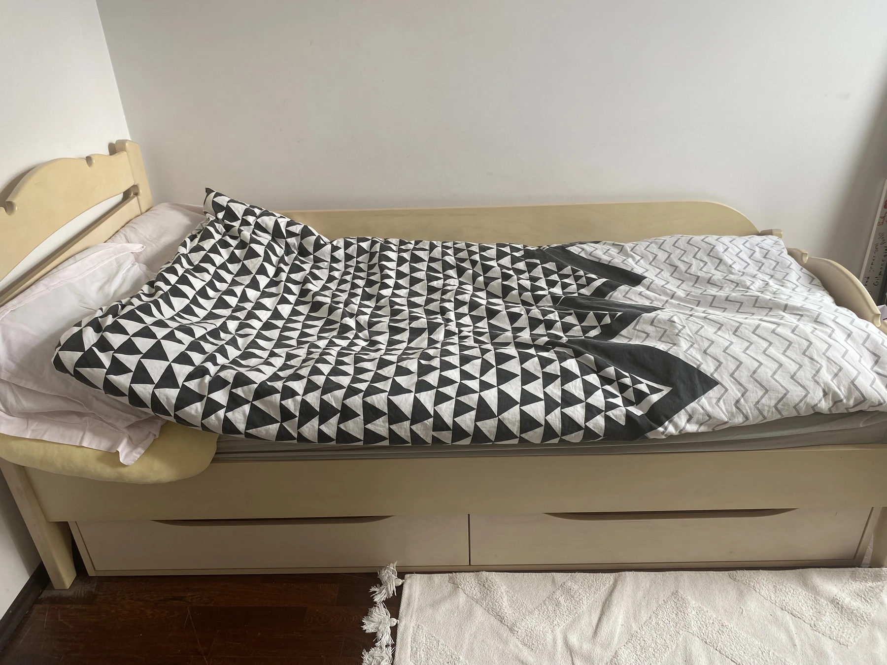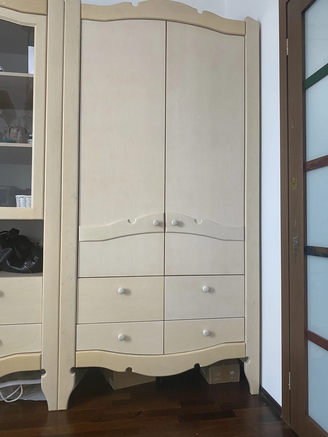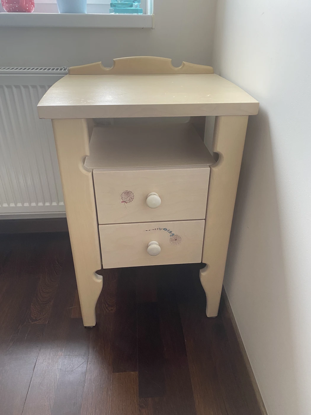Parduodamas vaikiškas baldų komplektas, kuris apima lovą, stalą ir dvi spintas (daiktų ir rūbų), komodą ir staliuką prie lovos. Komplektas yra pagamintas iš maišytos medienos, todėl pasižymi tvirtumu ir ilgaamžiškumu. Stalas turi švelnių įbrėžimų ir mažų nagų lako dėmelių (manau su pastangom ir laiku nusivalytu:). Kiekvienas baldas buvo kruopščiai sukurtas, kad atitiktų vaiko kambario poreikius, tuo pačiu išlaikant natūralaus medžio grožį. Šis komplektas idealiai tinka tiek berniuko, tiek mergaitės kambariui, užtikrinant ne tik stilingą, bet ir funkcionalų interjerą.