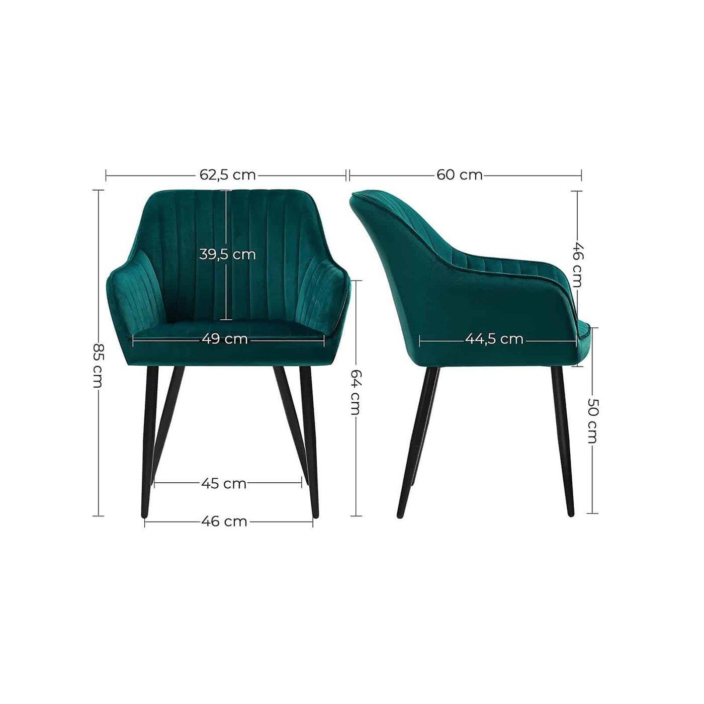 Aprašymas buvo automatiškai išverstas, gali pasitaikyti klaidų.Išbandykite patogiai: Ergonomiškas dizainas, 7 cm storio putplasčio paminkštinimas, aukštos kokybės aksominis užvalkalas ir patvarios metalinės kojelės, kurių apkrova iki 110 kg – šie elementai sukuria tvirtas ir patogias kėdes. Dar geriau, kad kėdės yra gražios išvaizdos, kuri suteikia malonią atmosferą bet kokiam kambariui.Visada šalia jūsų: kad ir kur norėtumėte sėdėti ir atsipalaiduoti, šios minkštos kėdės jums paruoštos. Nesvarbu, ar valgomajame, svetainėje, miegamajame, darbo kambaryje ar deginantis balkone, šios kėdės visada tiks poilsio akimirkoms Išsami informacija apie gaminį: Spalva: Melsva Medžiaga: Milteliniu būdu dengtos metalinės kojelės, medinis viršus, aksomas, putplasčio paminkštinimas Bendras matmenys: 62,5 x 60 x 85 cm (P x P x A) Sėdynės aukštis: 50 cm Sėdynės Plotis cm: 49 cm Sėdynės gylis: 44,5 cm Atlošo aukštis: 39,5 cm Porankių aukštis (nuo grindų): 64 cm Sėdynės pagalvėlės storis: 7 cm Vienos kėdės svoris: 6,5 kg Maks. statinė vienos kėdės apkrova: 110 kgPakuotės turinys: 2 x kėdė 2 x priedų paketas 2 x instrukcijos SONGMICS Pastabos: Saugokite gaminį nuo tiesioginių saulės spindulių. Saugokite gaminį nuo smailių ar aštrių daiktų, kad nesugadintumėte. Nestokite ant kėdžių ir nenaudokite jomis kaip laipiojimo priemonė arba kopėčios. Jei kėdes sušlapo, nedelsdami nuvalykite jas sausa šluoste. Padėkite kėdes ant lygaus paviršiaus. Grindų kilimėlis po kėdėmis gali apsaugoti jūsų parketo grindis.