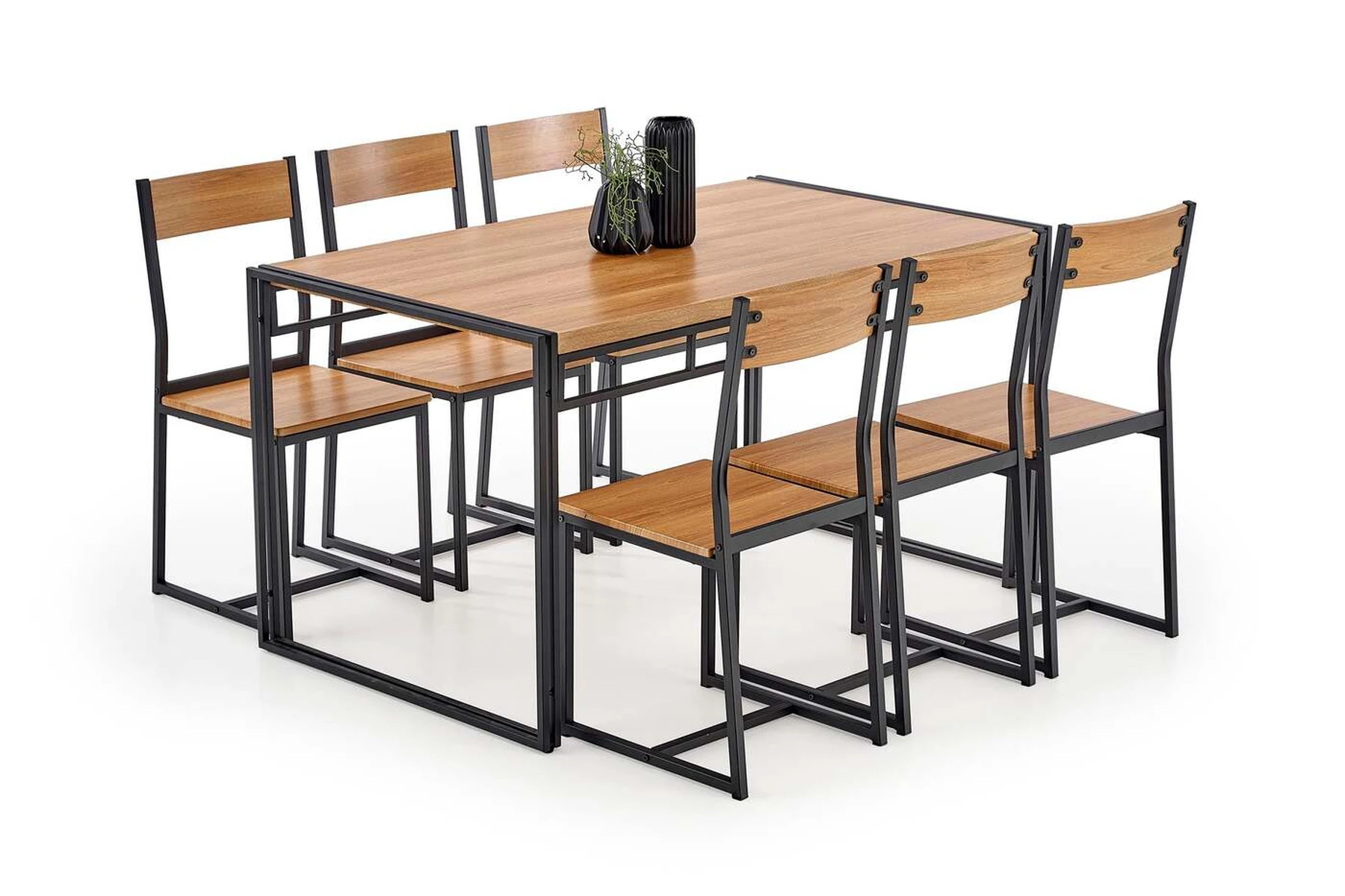 matmenys: 140/80/75 cm, stalas + 6 kėdės, medžiaga: laminuotas MDF / milteliniu būdu dažytas plienas, spalva: auksinis ąžuolas / juoda