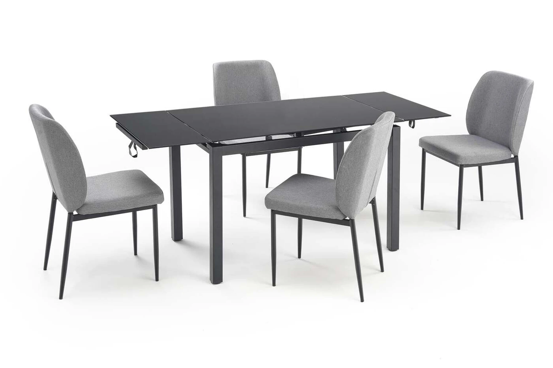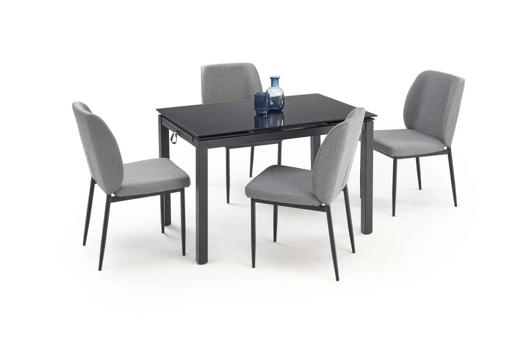 JASPER komplektinis stalas + 4 kėdės, matmenys: stalas 110-170/70/76 cm, kėdė 44/58/89/47 cm, medžiaga: stiklas / milteliniu būdu dažytas plienas, spalva: juoda / pilka