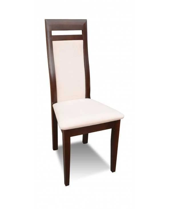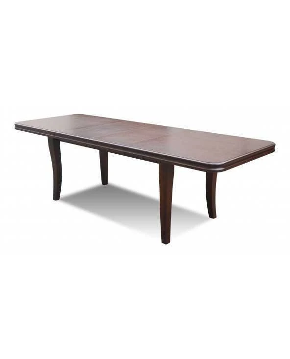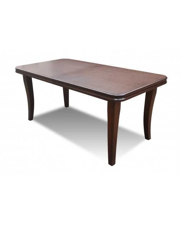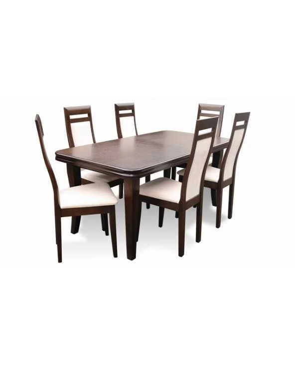 Stalas faneruotas, stalviršio kampai užapvalinti, prailginamas. Kėdės natūralios medienos. Nuotraukoje mediena riešuto spalvos, o kėdės aptrauktos gobelenu. Spalvas ir audinius galite rinktis iš pateiktos galerijos.