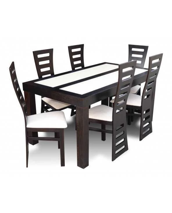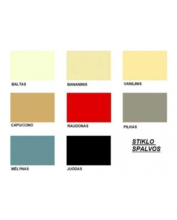 Stalas faneruotas, prailginamas, su stiklo intarpais. Kojos iš natūralios medienos.