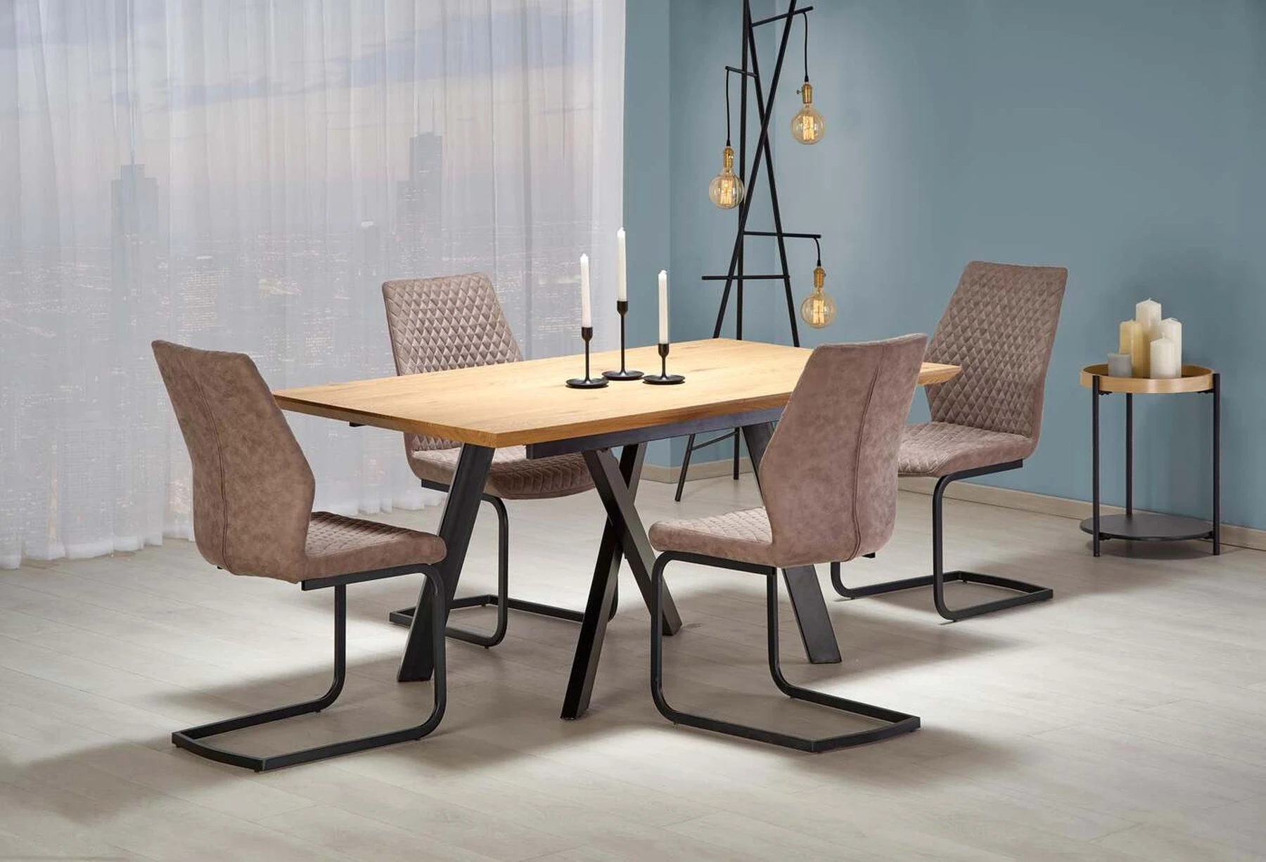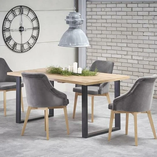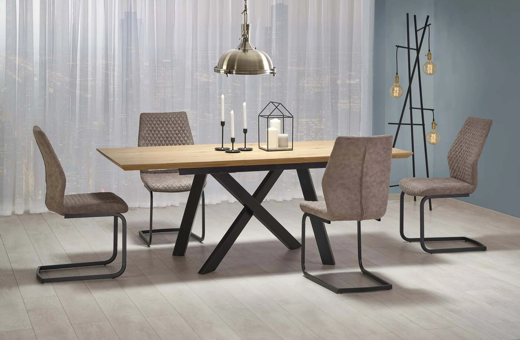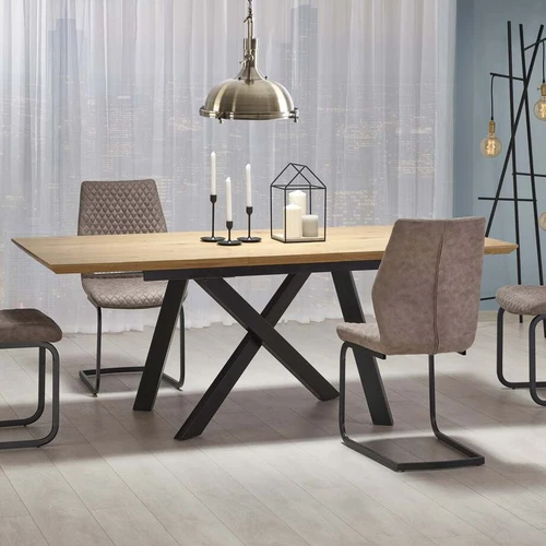 prailginamasis stalas, matmenys: 180-240/90/76 cm, medžiaga: laminuotas MDF / milteliniu būdu dažytas plienas, spalva: auksinis ąžuolas / juoda Išpylus skysčius ant stalviršio, nedelsdami nušluostykite, kad jis nesugertų vandens. stalviršio medžiaga.
