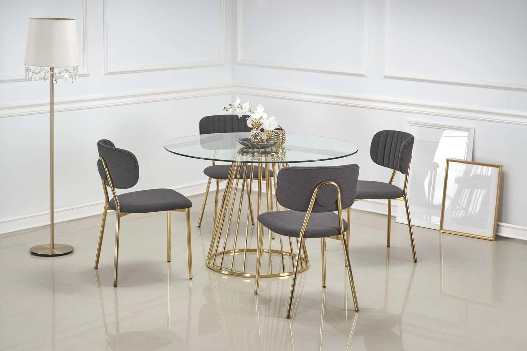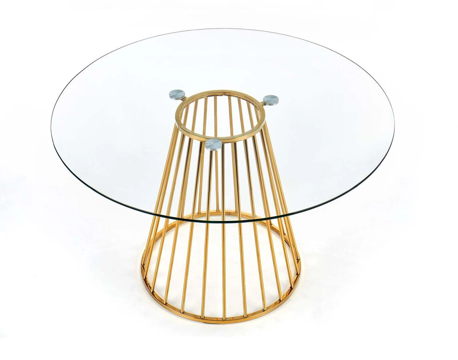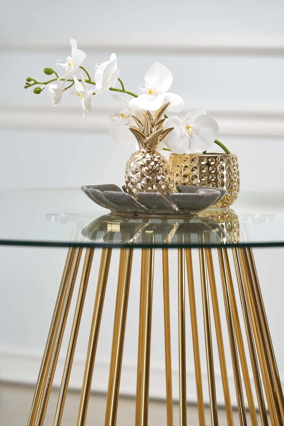 matmenys: o120/75 cm, medžiaga: stiklas / chromuotas plienas, spalva: viršus - skaidrus, kojos - auksas