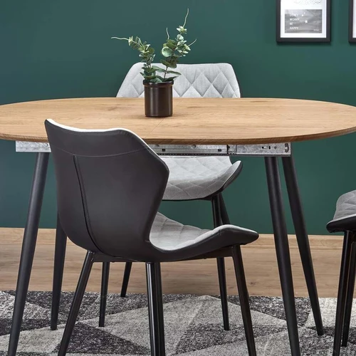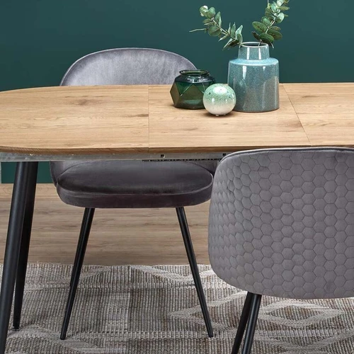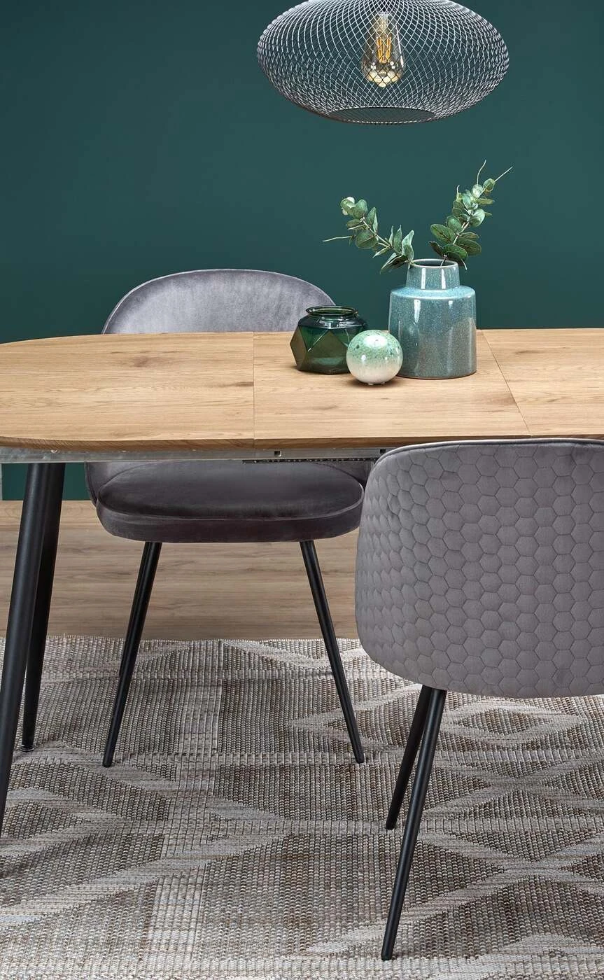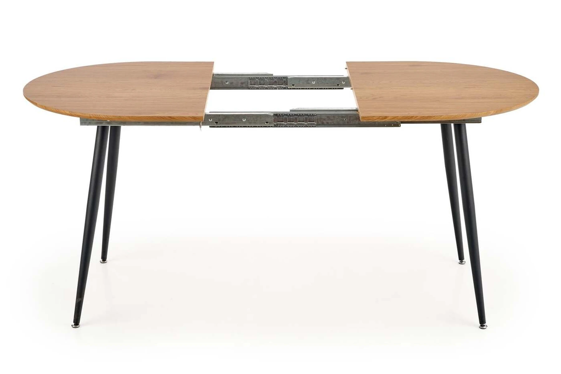 matmenys: 120-160/80/74 cm, prailginamas stalas, medžiaga: laminuotas MDF / milteliniu būdu dažytas plienas, spalva: viršus - auksinis ąžuolas, kojos - juodos