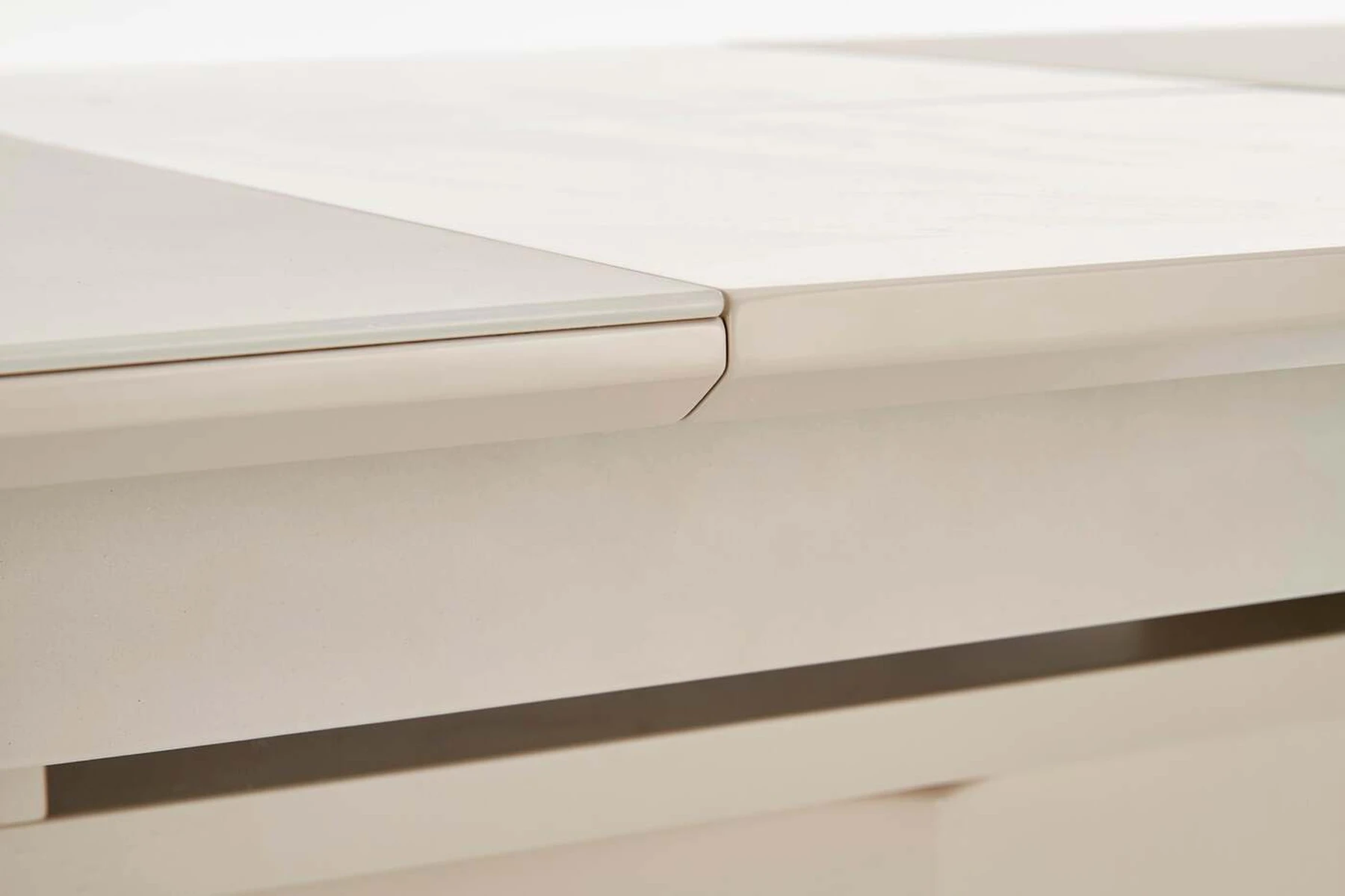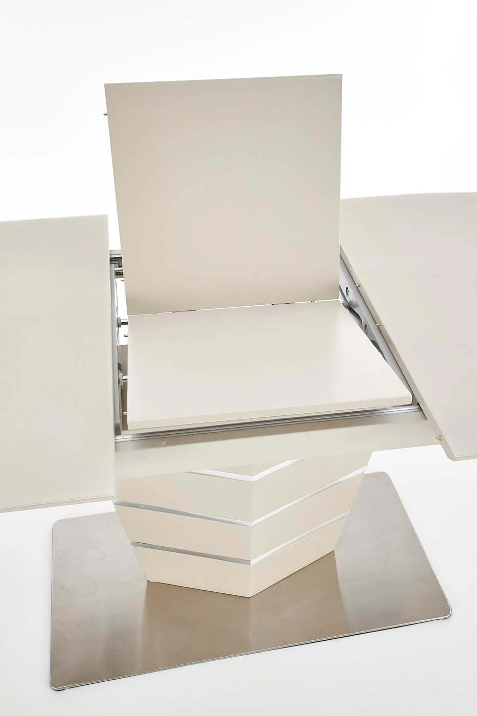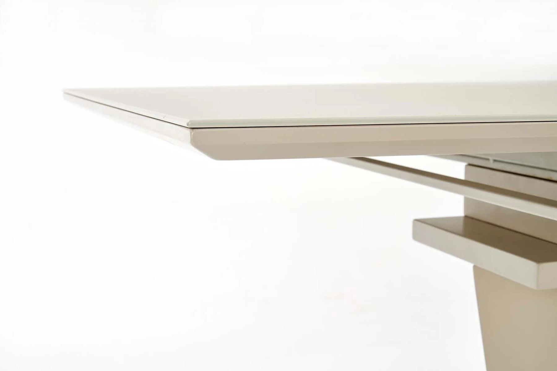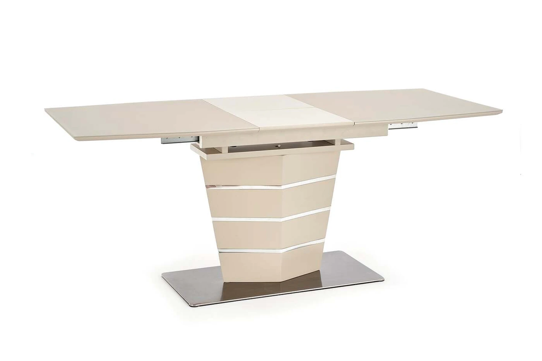 matmenys: 140÷180/80/76 cm, prailginamasis stalas, medžiaga: stiklas / lakuotas MDF / nerūdijantis plienas, spalva: šampano matinė