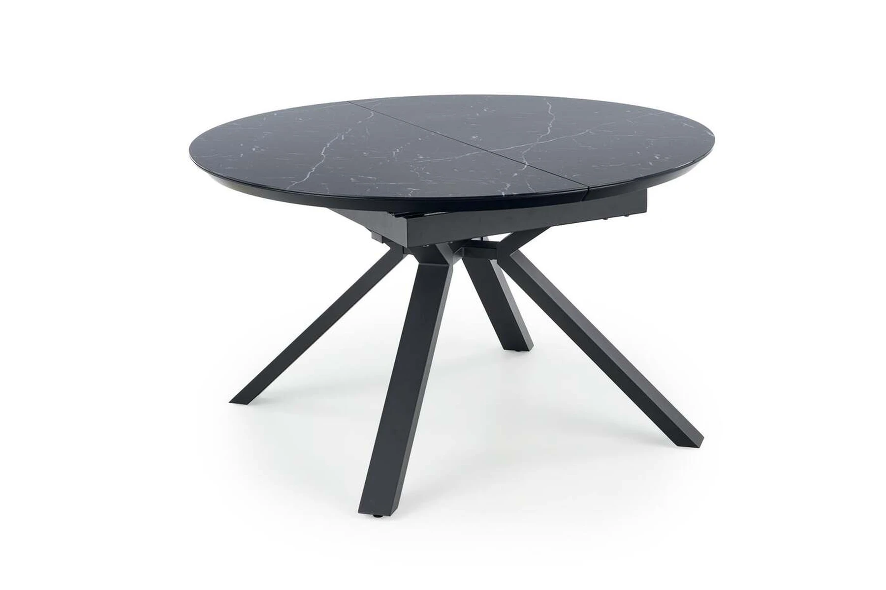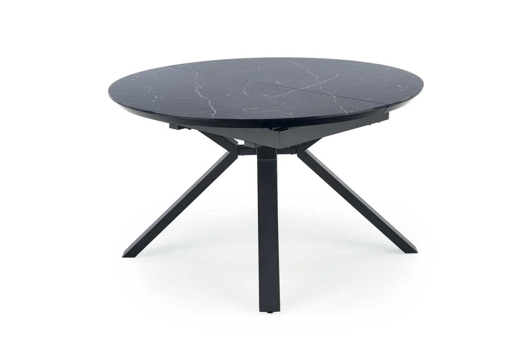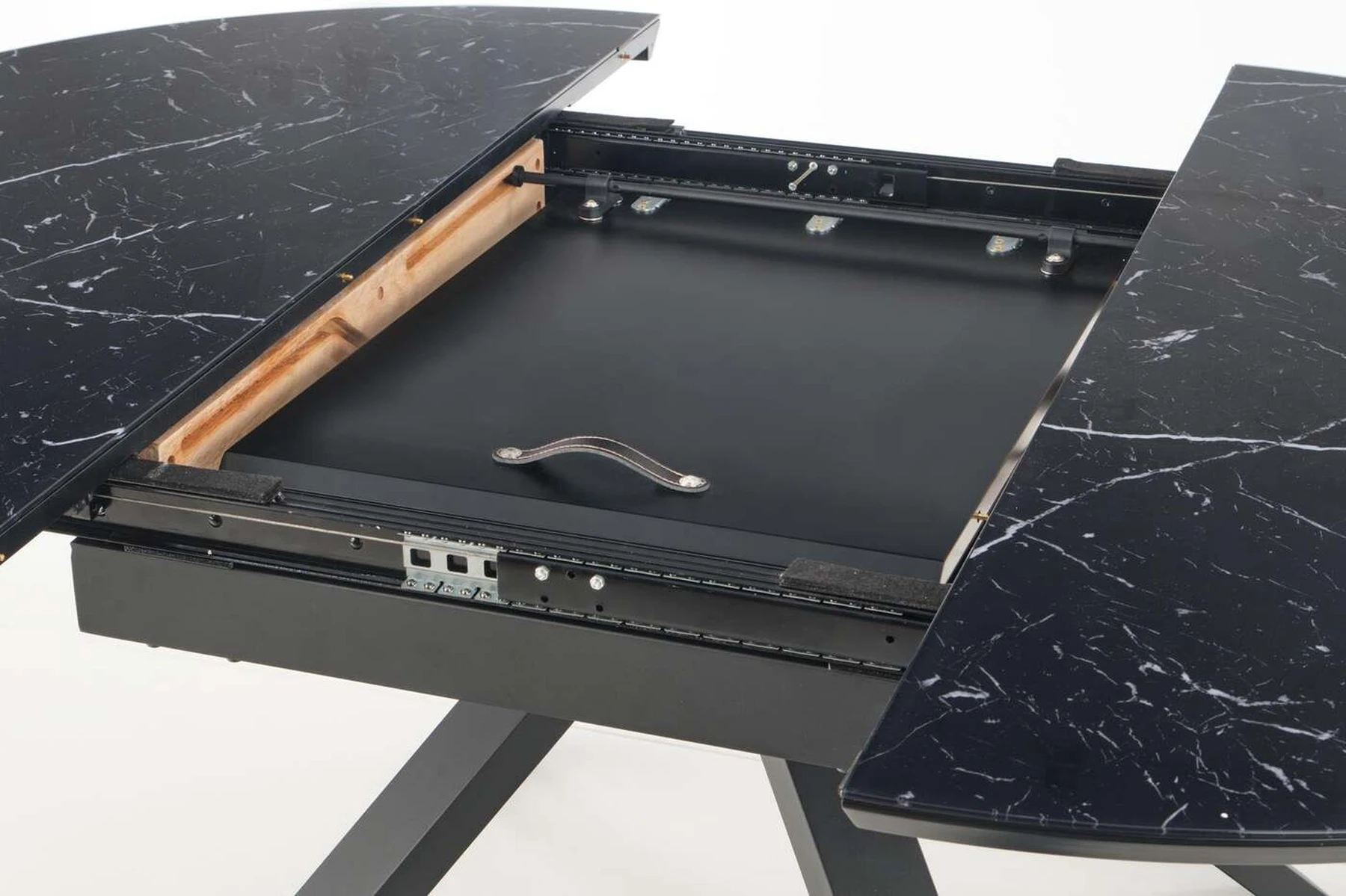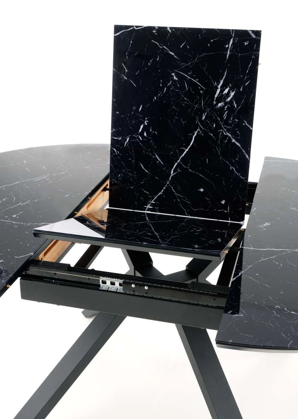 prailginamasis stalas, matmenys: 130-180/130/76 cm, medžiaga: stiklas / lakuotas MDF / milteliniu būdu dažytas plienas, spalva: viršus - juodas marmuras, kojos - juodos