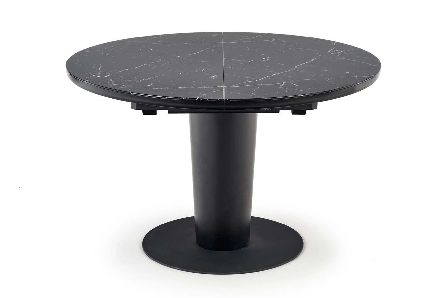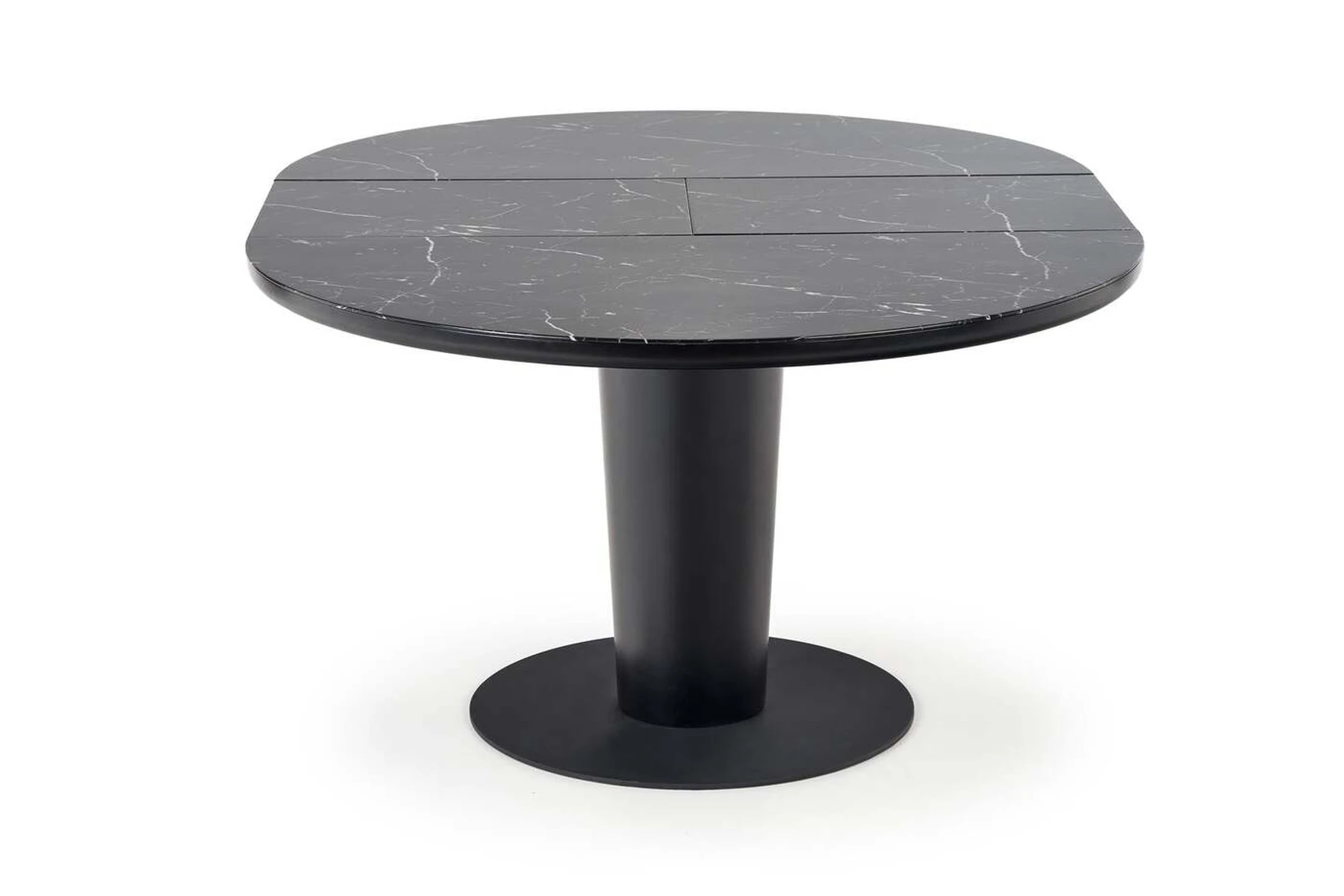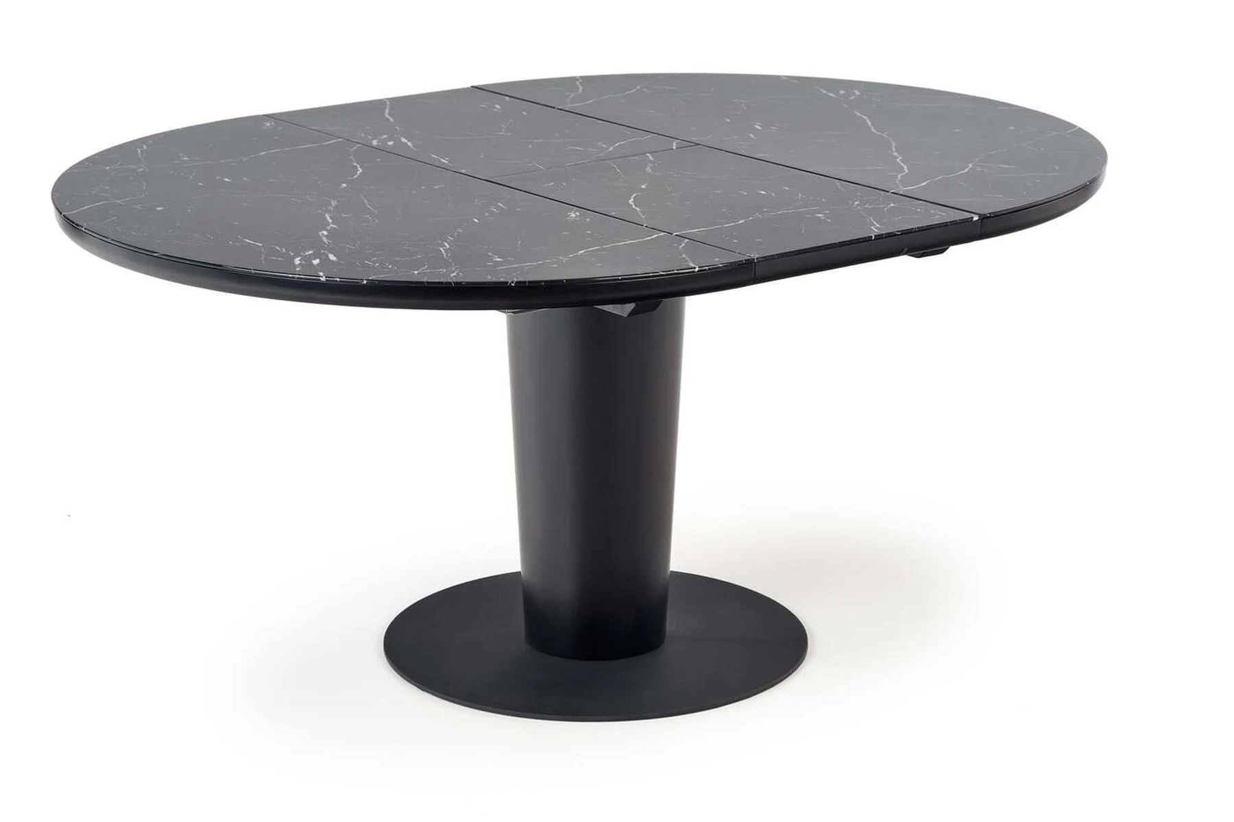 matmenys: 120-160/120/75 cm, prailginamas stalas, medžiaga: stiklas / lakuotas MDF / milteliniu būdu dažytas plienas, spalva: viršus - juodas marmuras, kojos - juodos