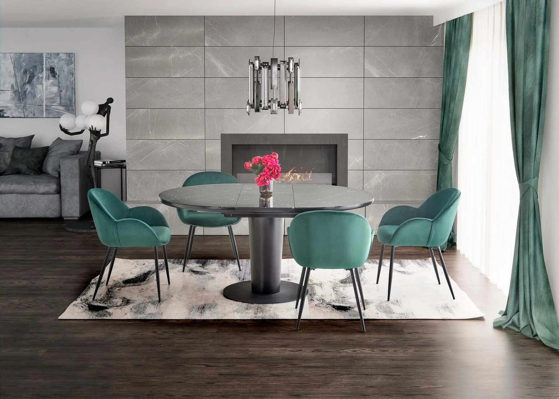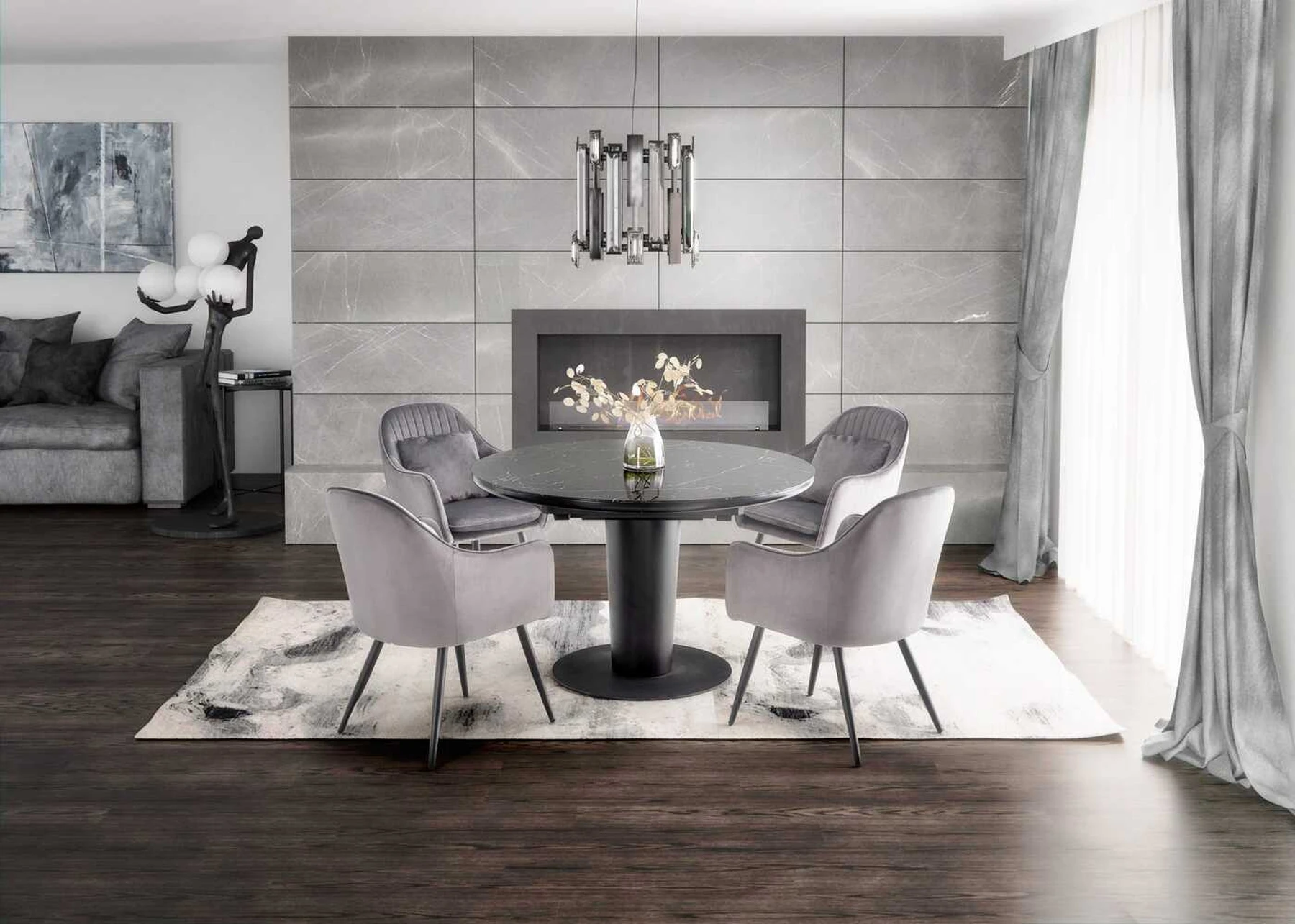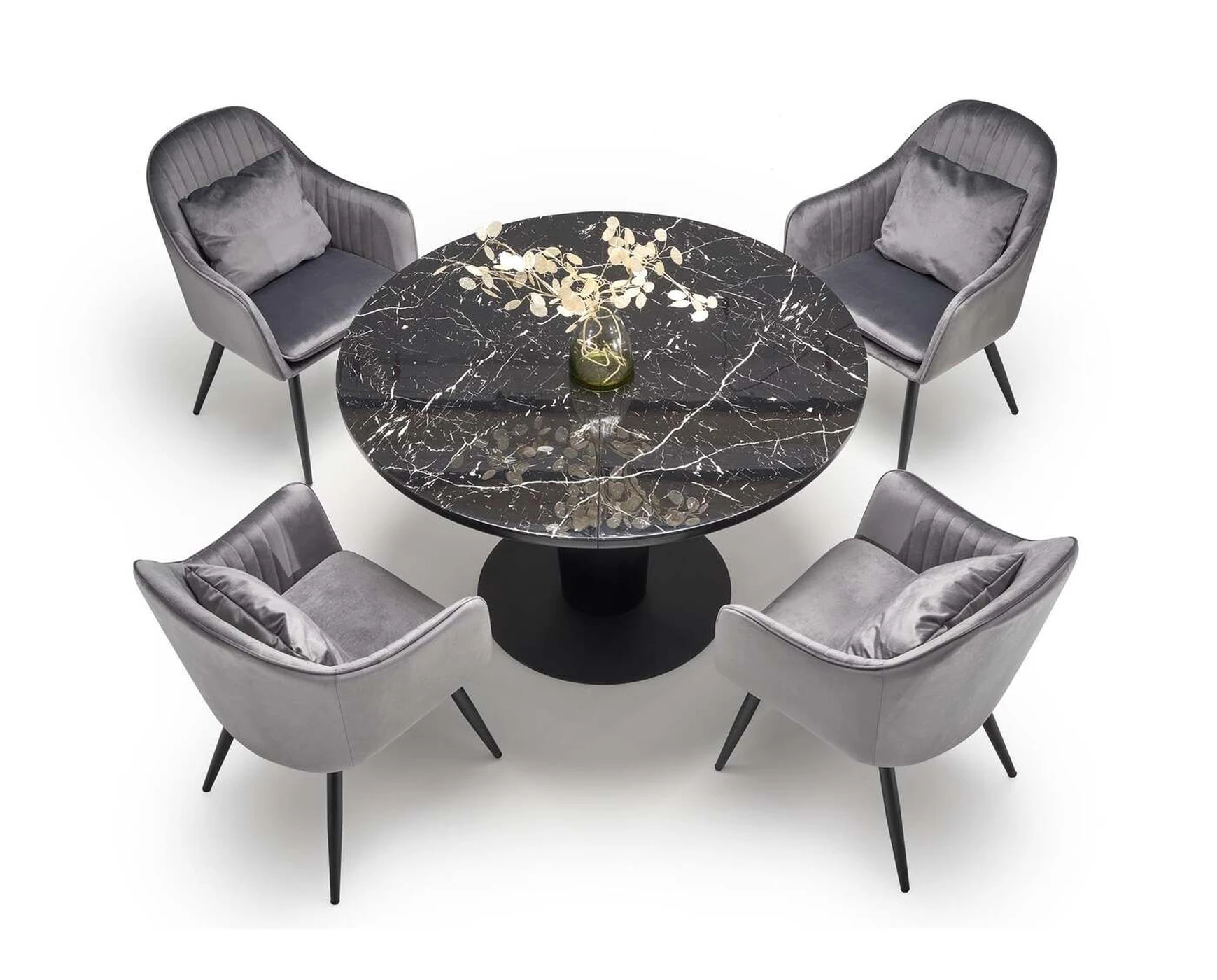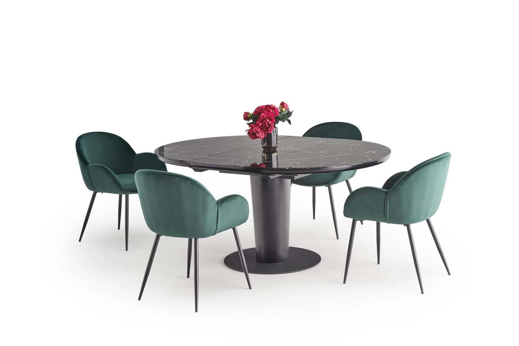 matmenys: 120-160/120/75 cm, prailginamas stalas, medžiaga: stiklas / lakuotas MDF / milteliniu būdu dažytas plienas, spalva: viršus - juodas marmuras, kojos - juodos