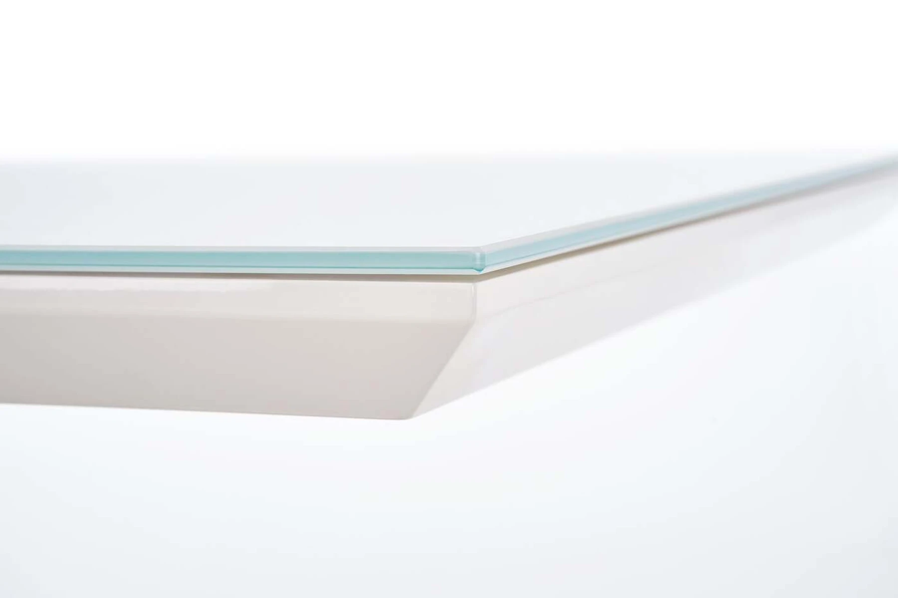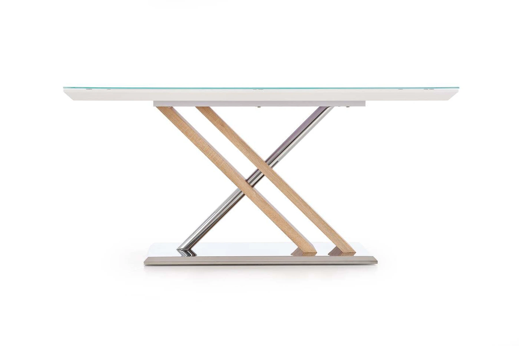 matmenys: 160/90/76 cm, medžiaga: stiklas / lakuotas MDF / laminuotas MDF / chromuotas plienas / nerūdijantis plienas, spalva: stiklas - ypač baltas, rėmas - sonoma ąžuolas