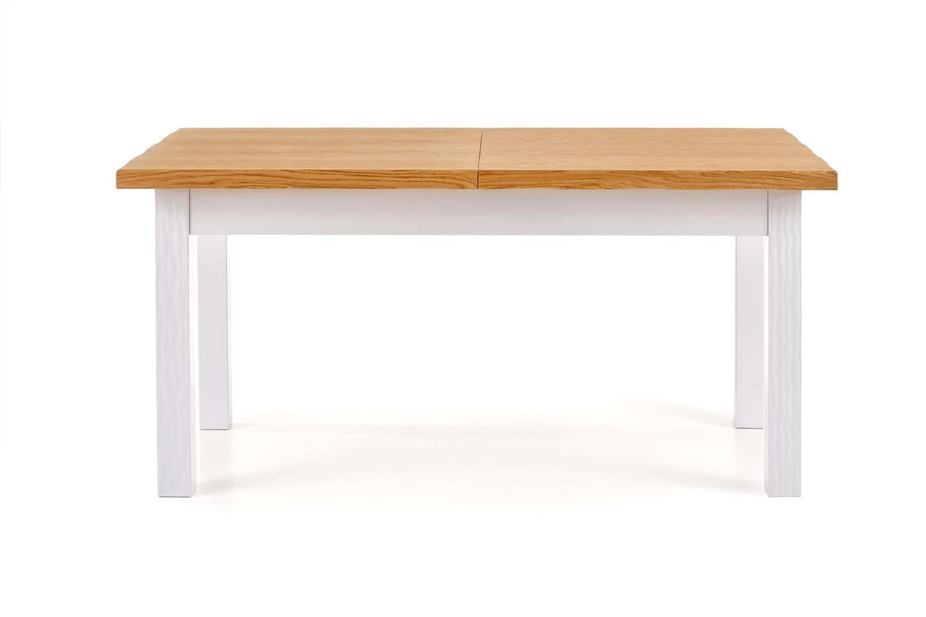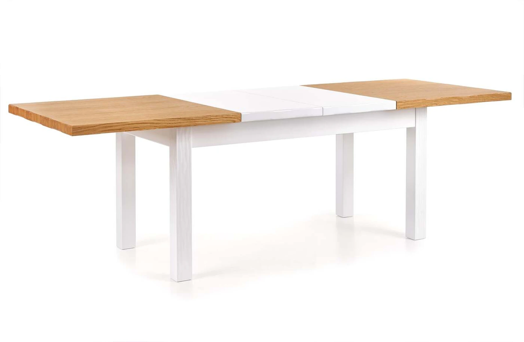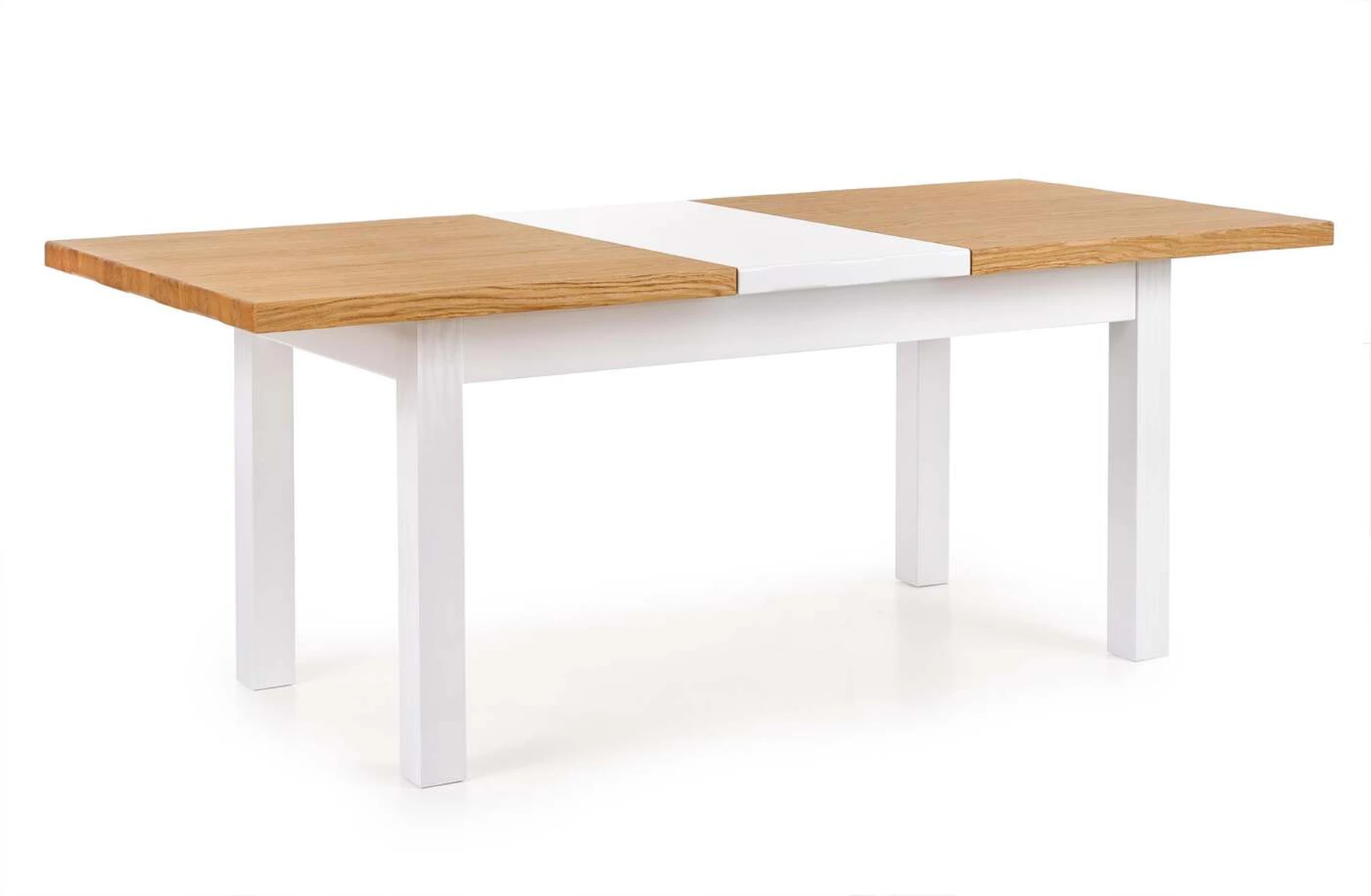 prailginamasis stalas, matmenys: 160-250/90/77 cm, medžiaga: viršus - baldų lenta + natūralaus ąžuolo vanera, kojos - lakuotas MDF, spalva: viršus - medus ąžuolas, kojos - balta