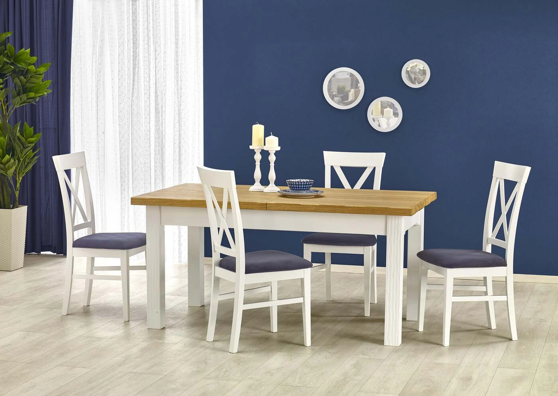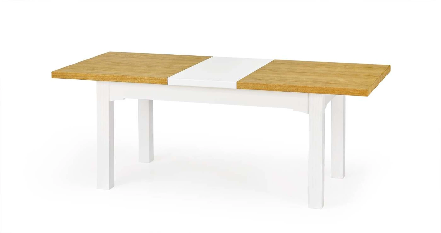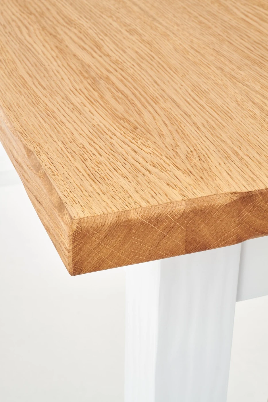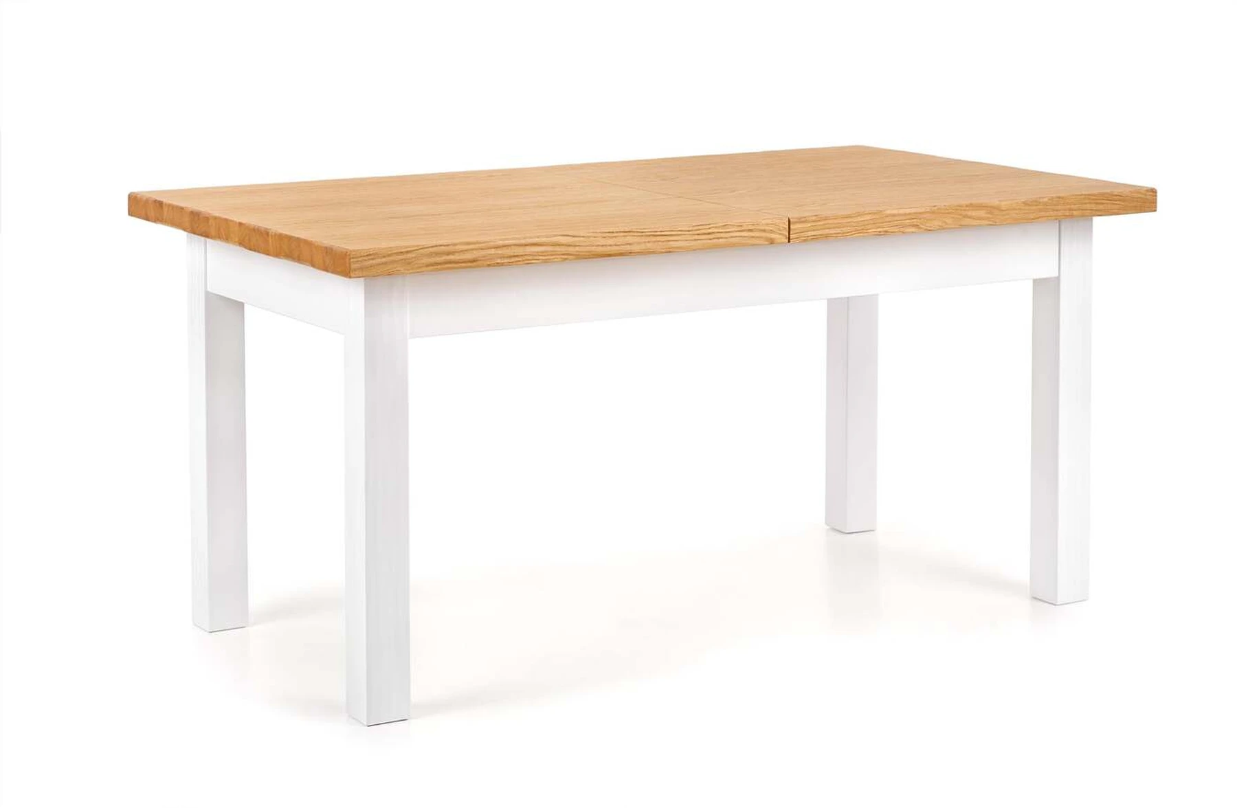 prailginamasis stalas, matmenys: 160-250/90/77 cm, medžiaga: viršus - baldų lenta + natūralaus ąžuolo vanera, kojos - lakuotas MDF, spalva: viršus - medus ąžuolas, kojos - balta