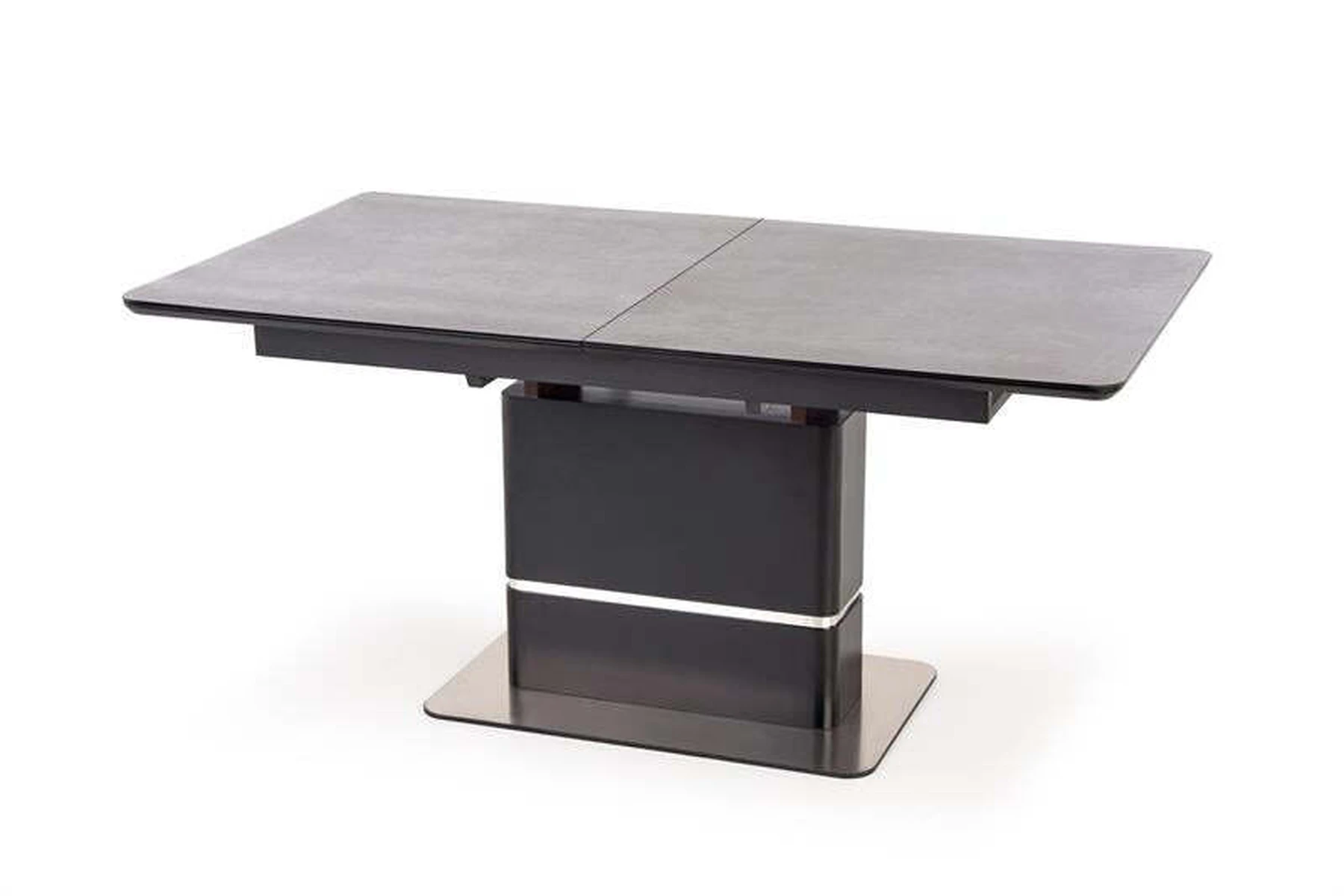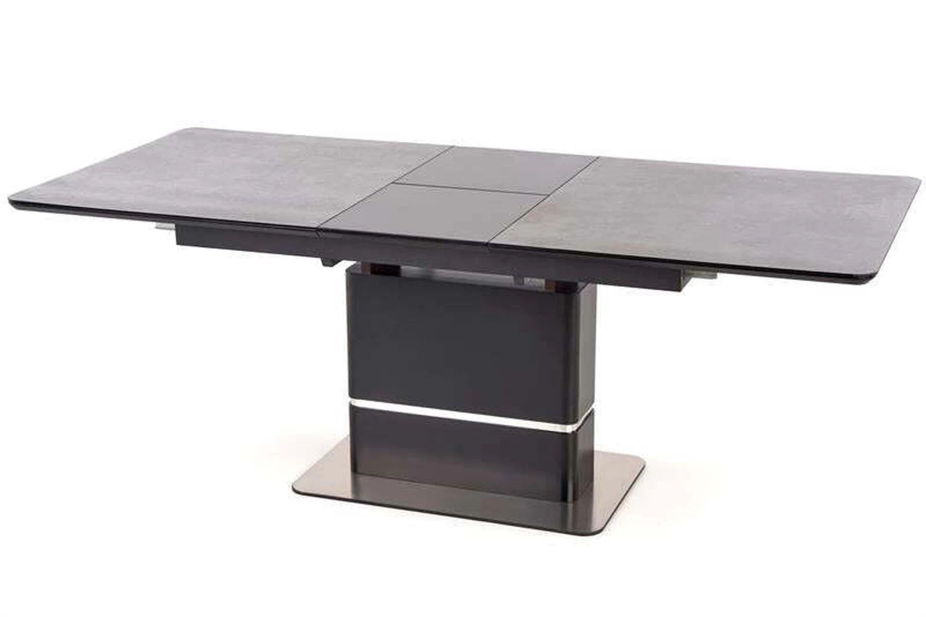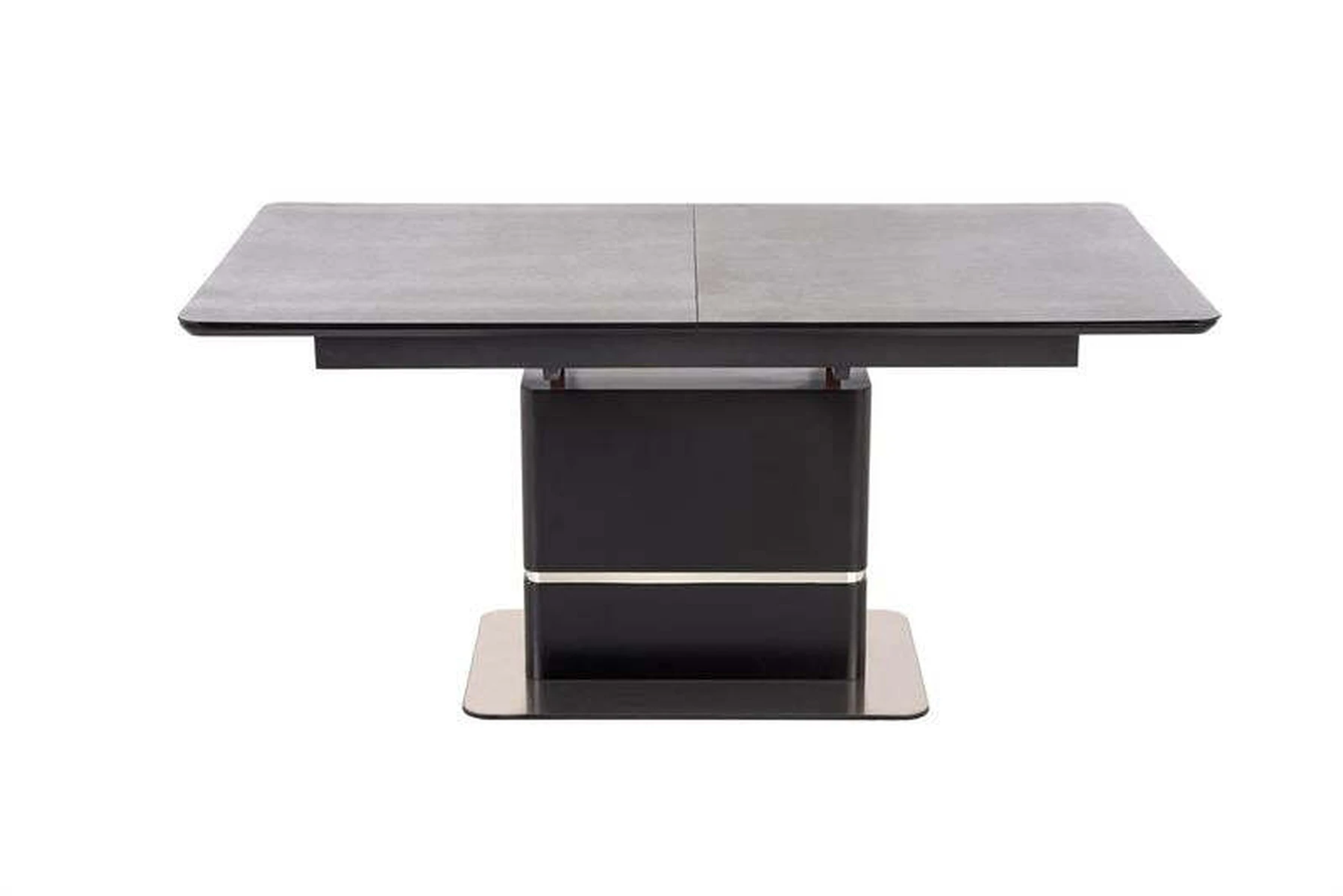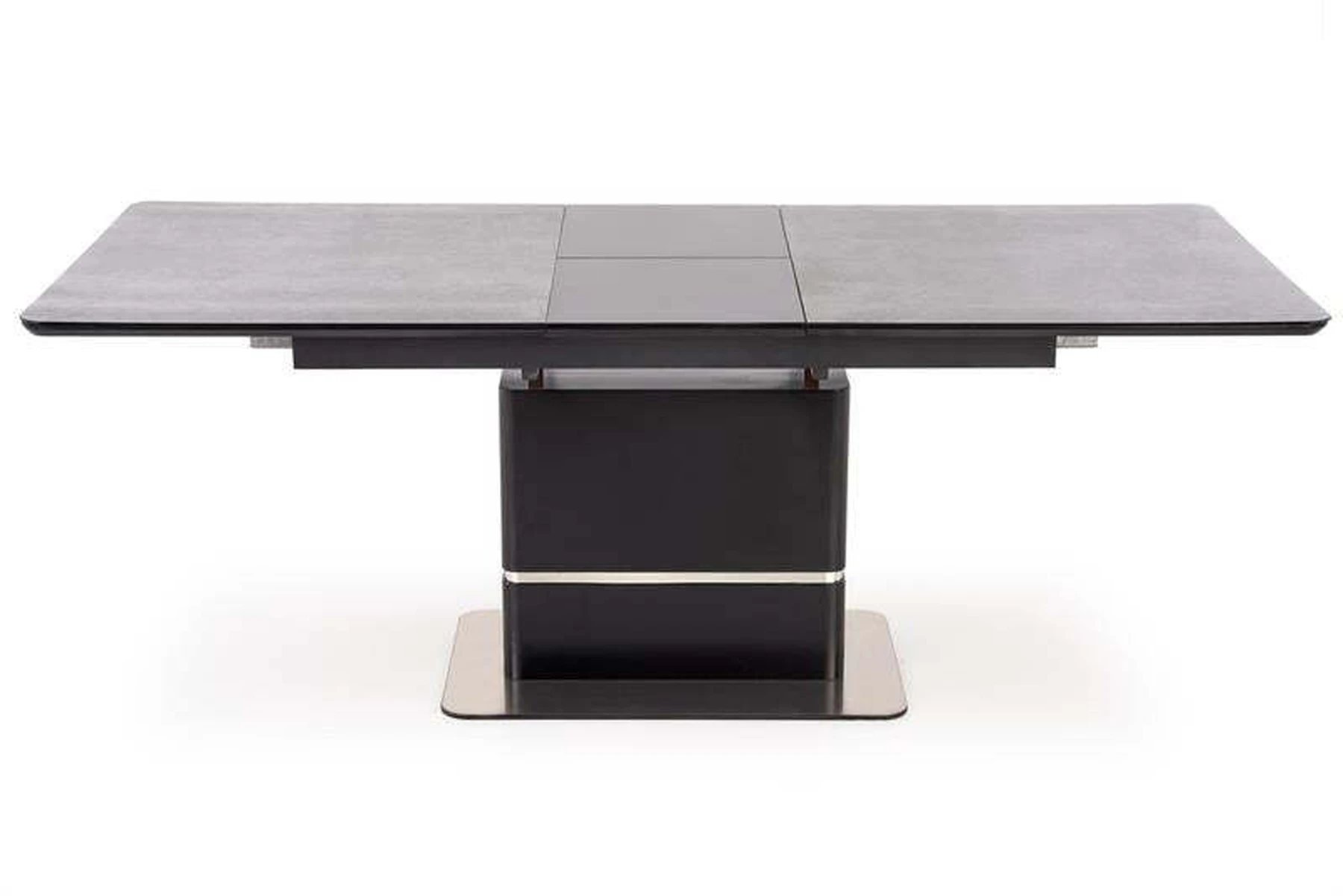 matmenys: 160-200/90/75 cm, prailginamasis stalas, medžiaga: stiklas / lakuotas MDF / nerūdijantis plienas, spalva: viršus - tamsiai pilka / juoda, kojos - juodos