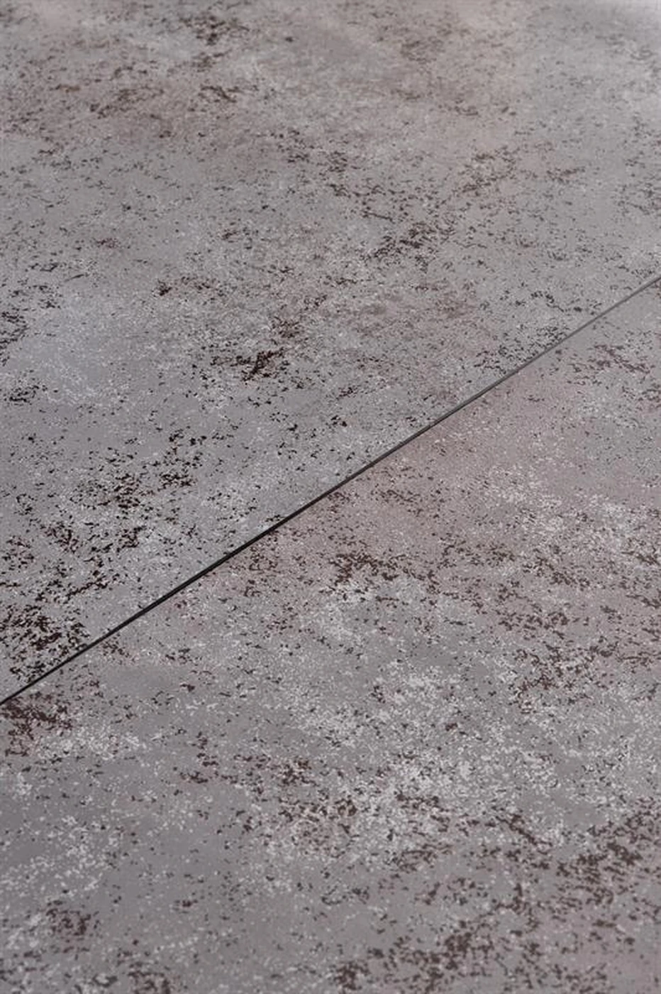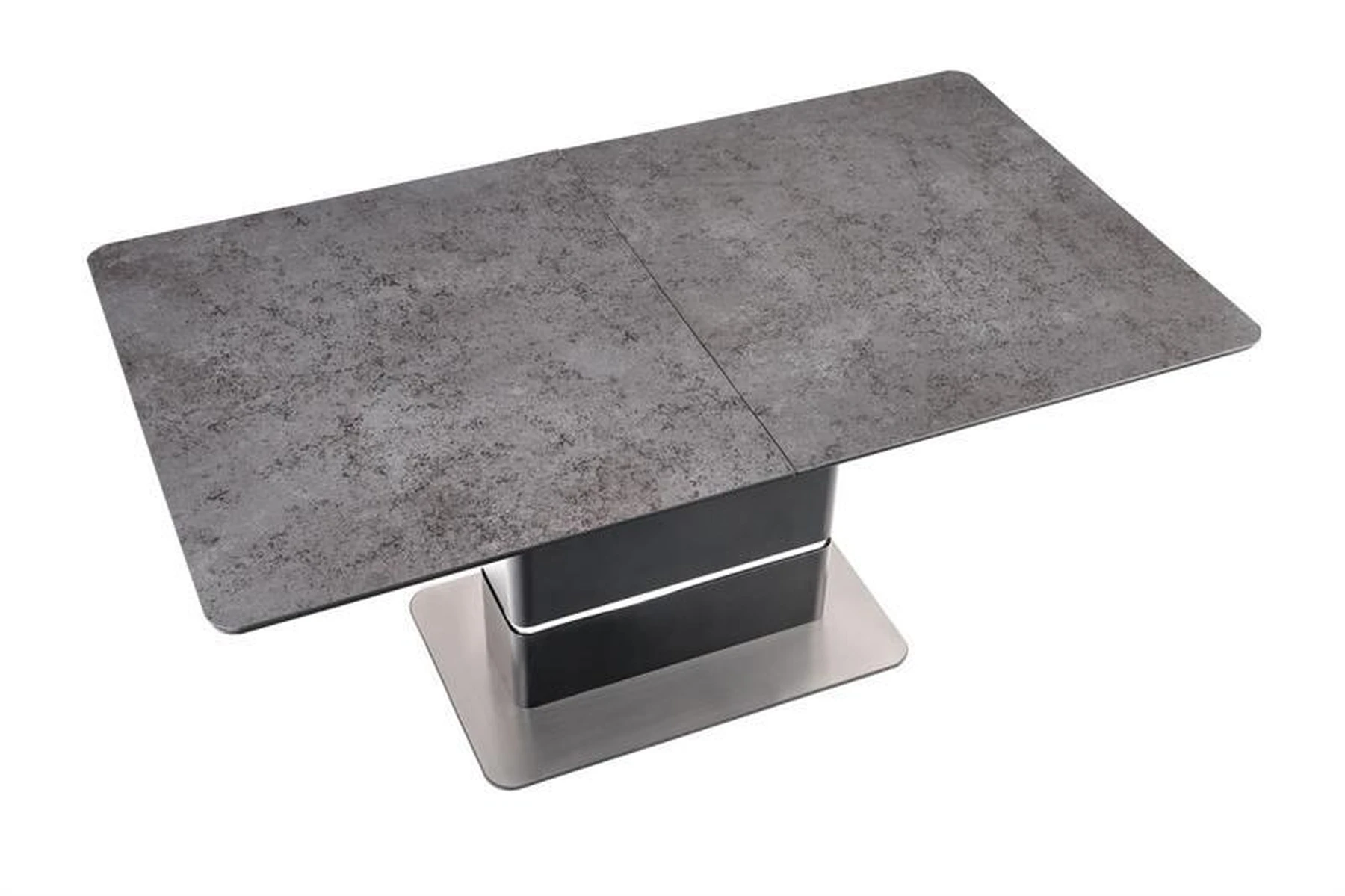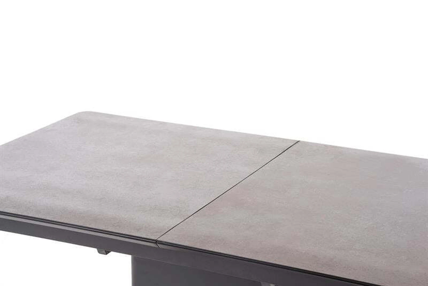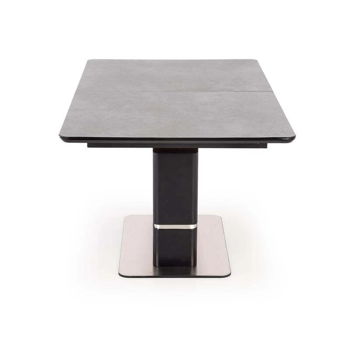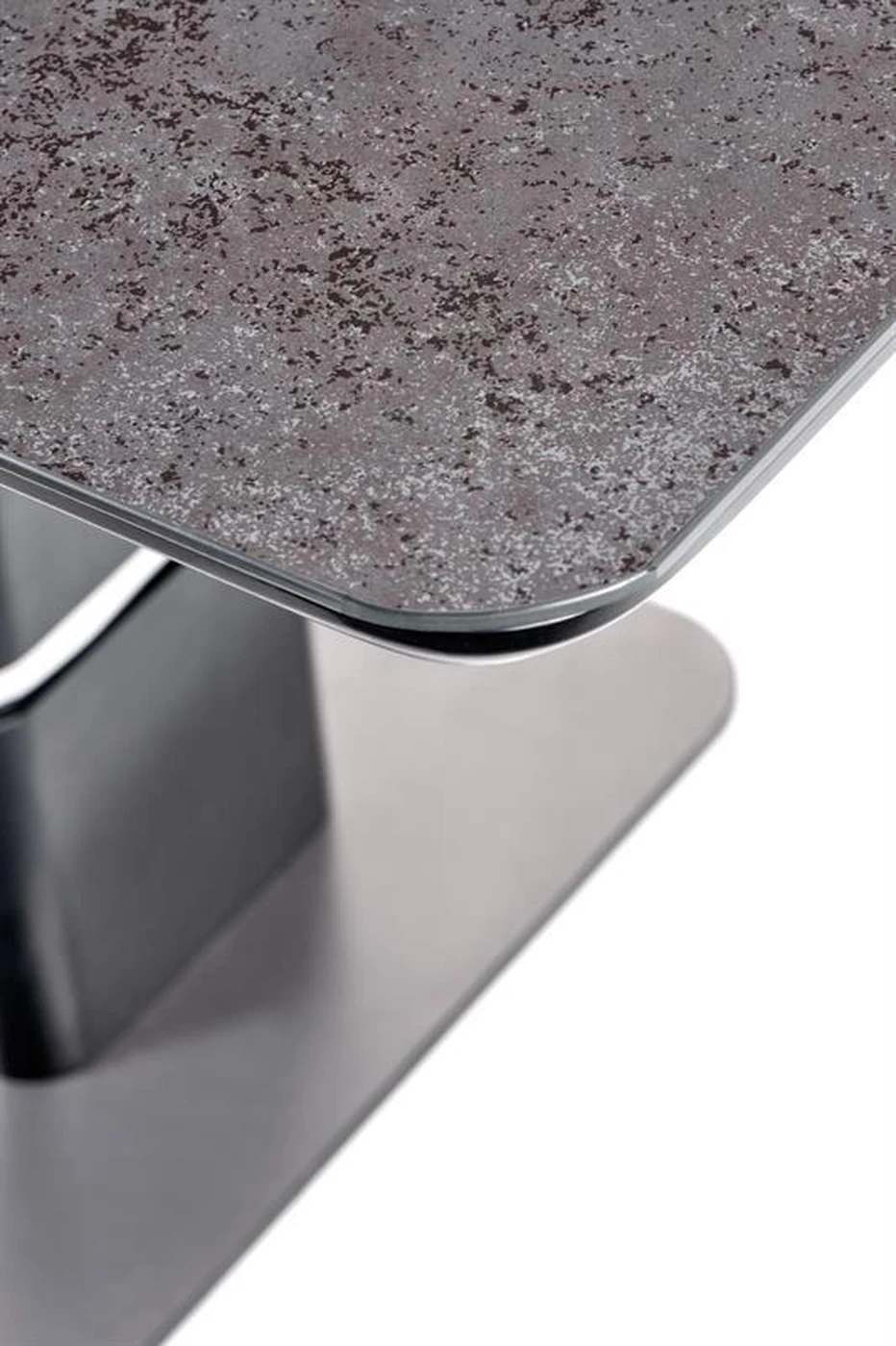 matmenys: 160-200/90/75 cm, prailginamasis stalas, medžiaga: stiklas / lakuotas MDF / nerūdijantis plienas, spalva: viršus - tamsiai pilka / juoda, kojos - juodos