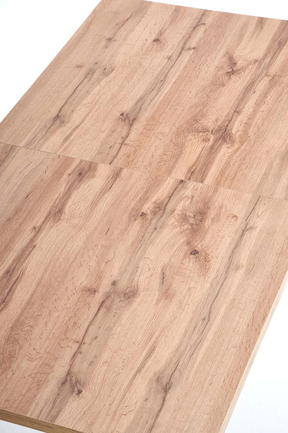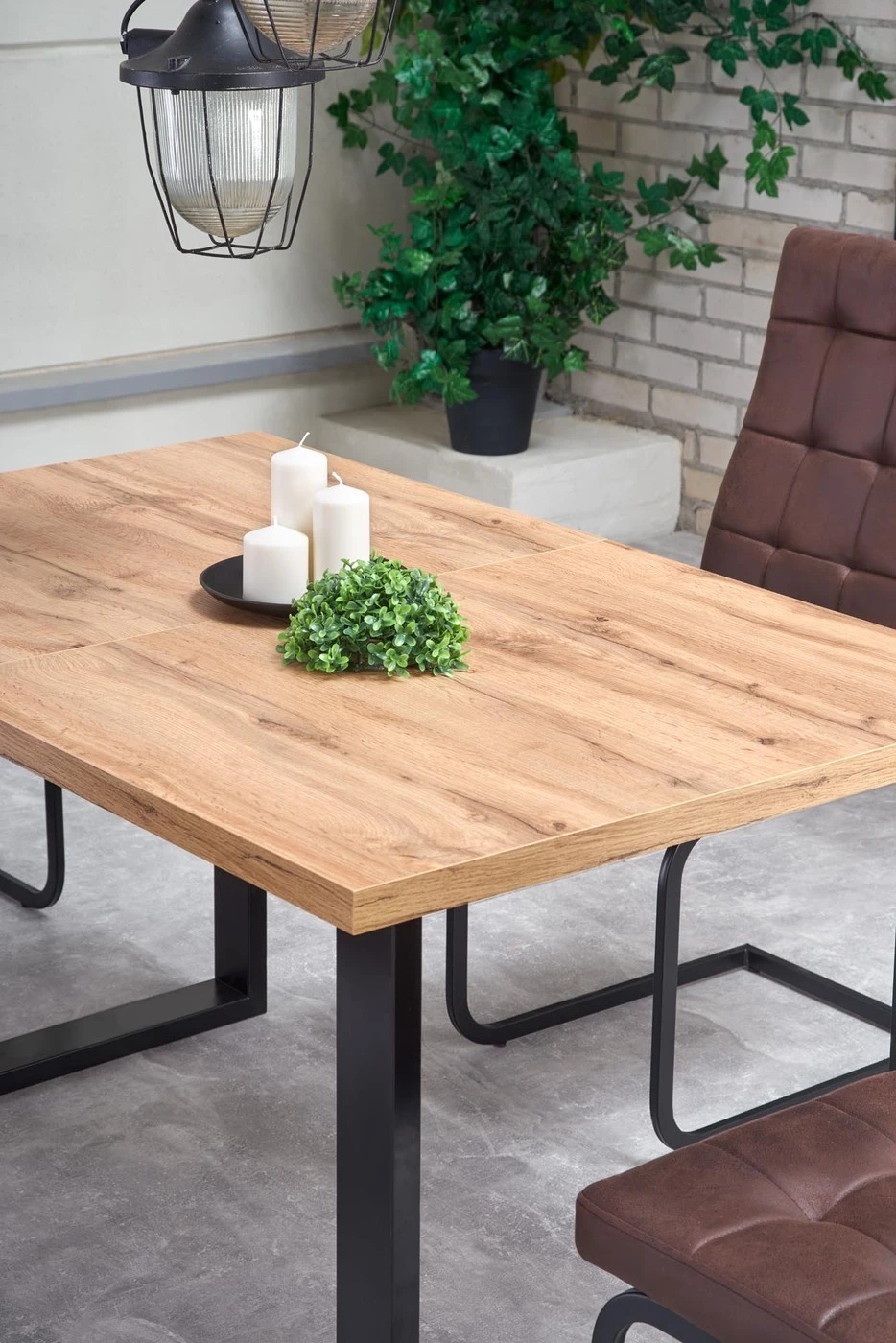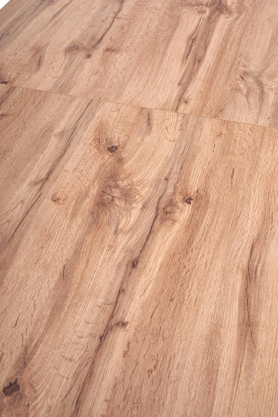 matmenys: 135÷185/85/74 cm, prailginamasis stalas, medžiaga: viršus - laminuota medžio drožlių plokštė, ABS plastikas iš kraštų, kojos - milteliniu būdu dažytas plienas, spalva: viršus - ąžuolas, kojos - juodos