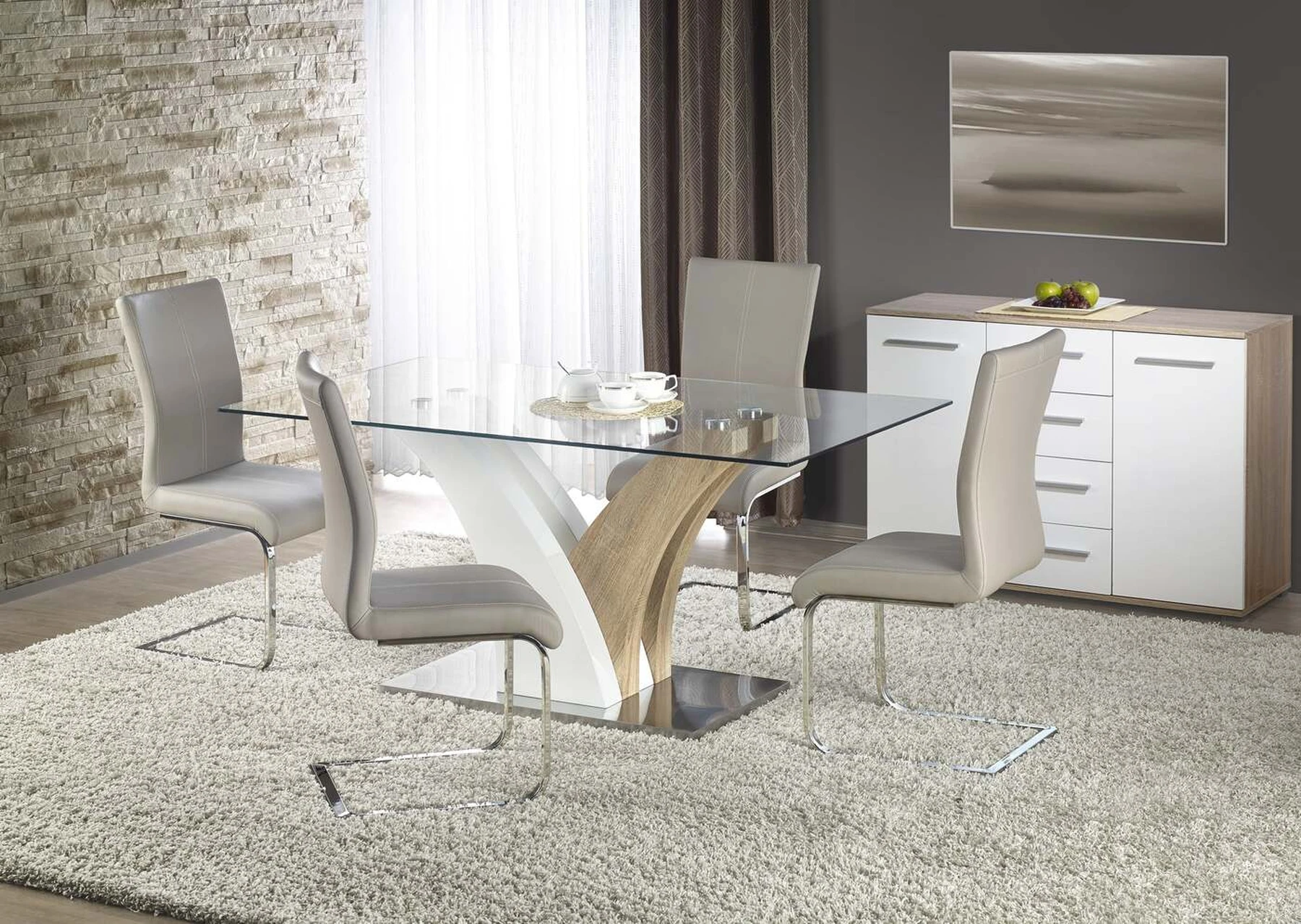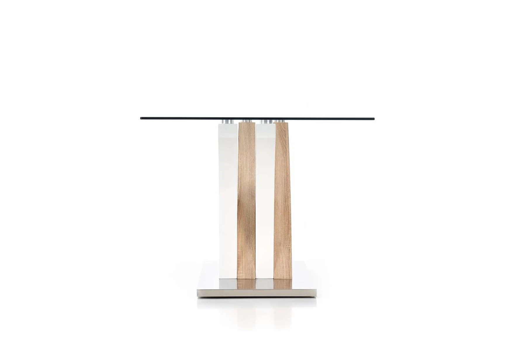 matmenys: 160/90/76 cm, medžiaga: stiklas / lakuotas MDF / laminuotas MDF / nerūdijantis plienas, spalva: balta / sonoma ąžuolas
