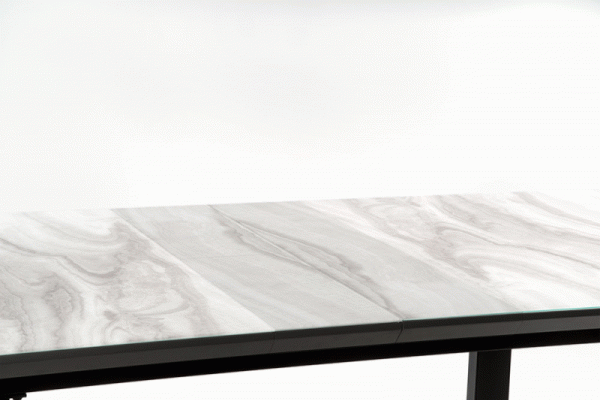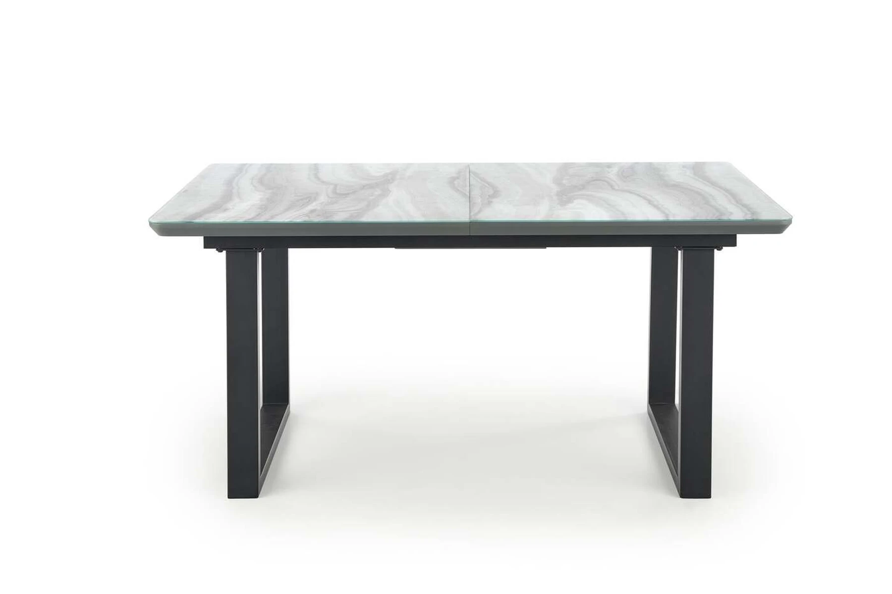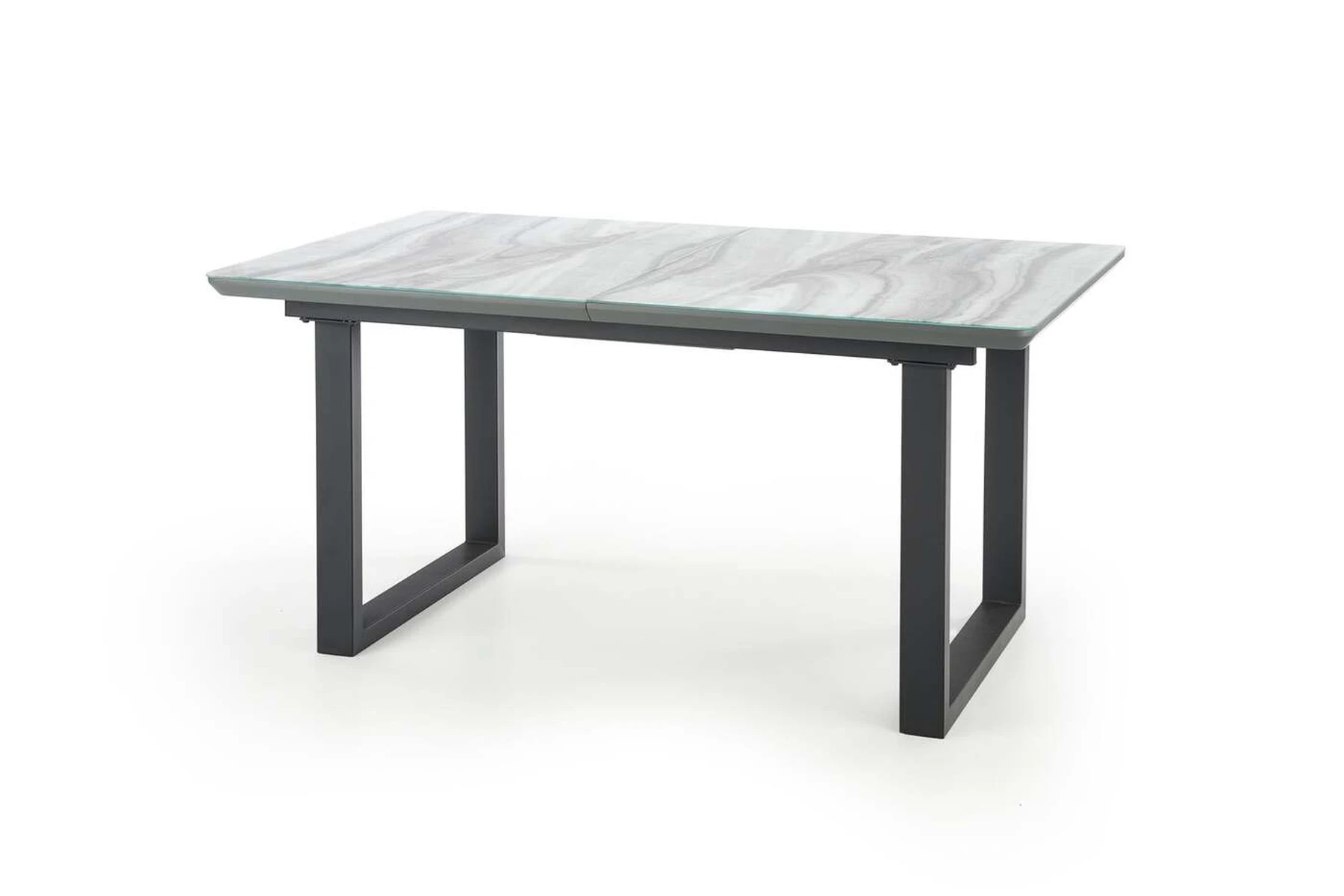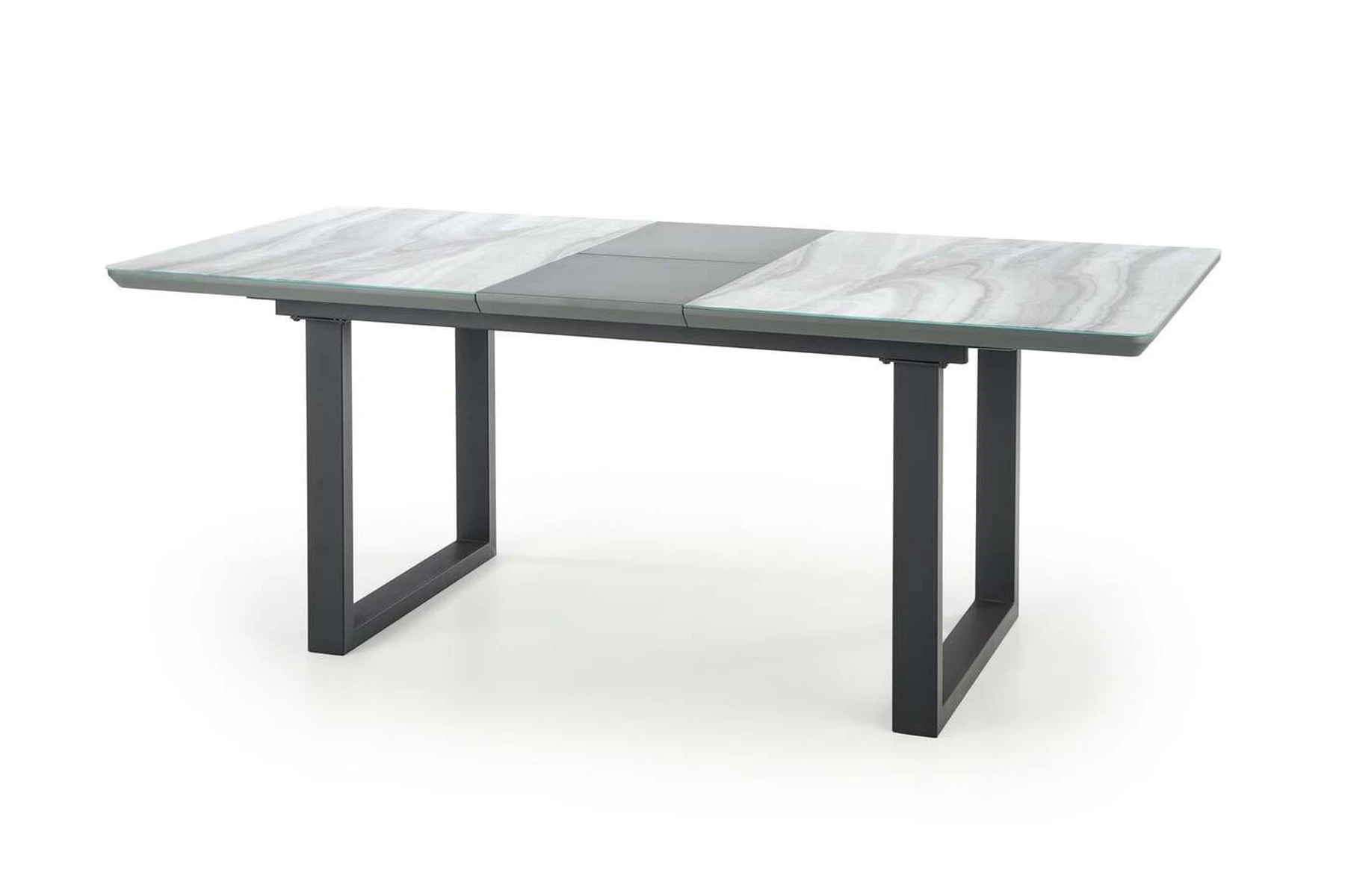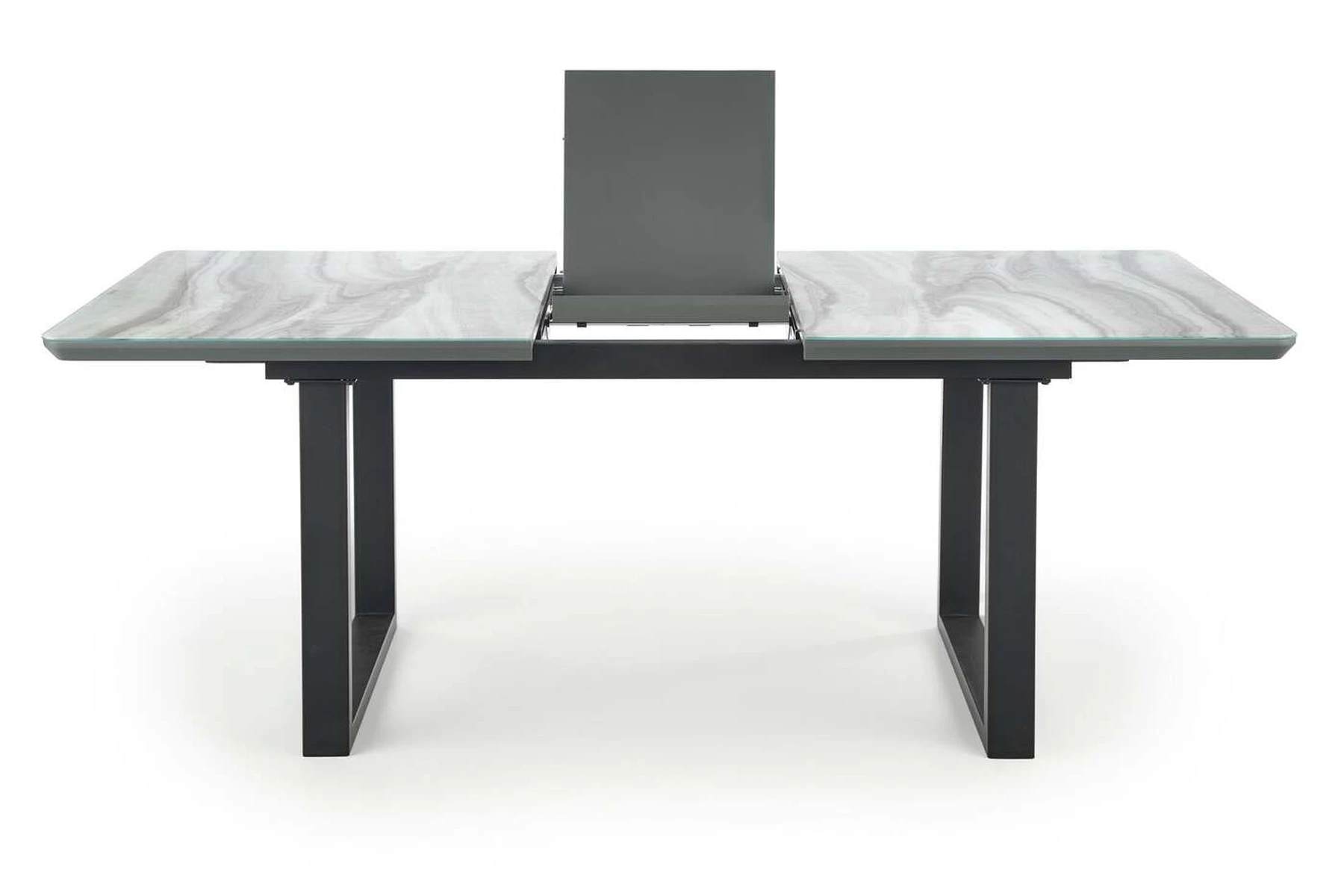 prailginamasis stalas, matmenys: 160-200/90/76cm, medžiaga: stiklas / lakuotas MDF / milteliniu būdu dažytas plienas, spalva: viršus - baltas marmuras / pilka, kojos - juodos