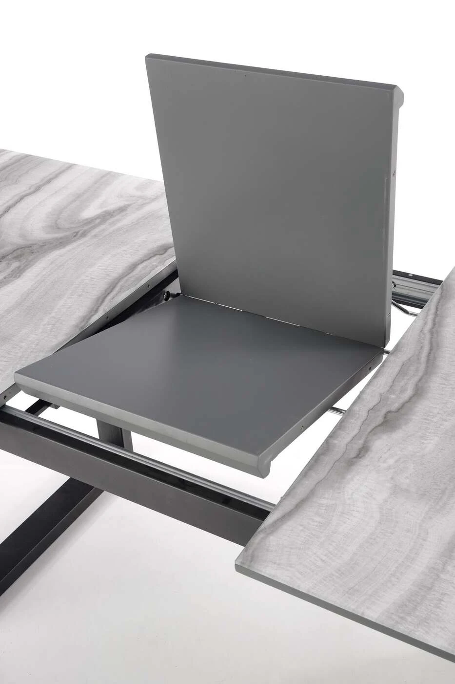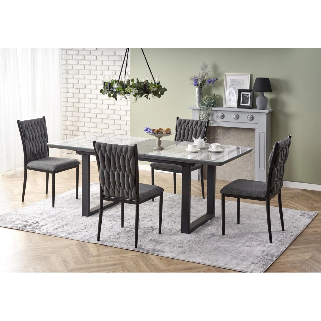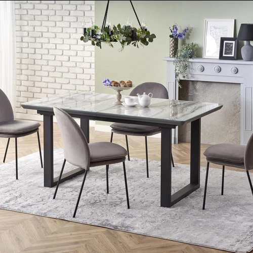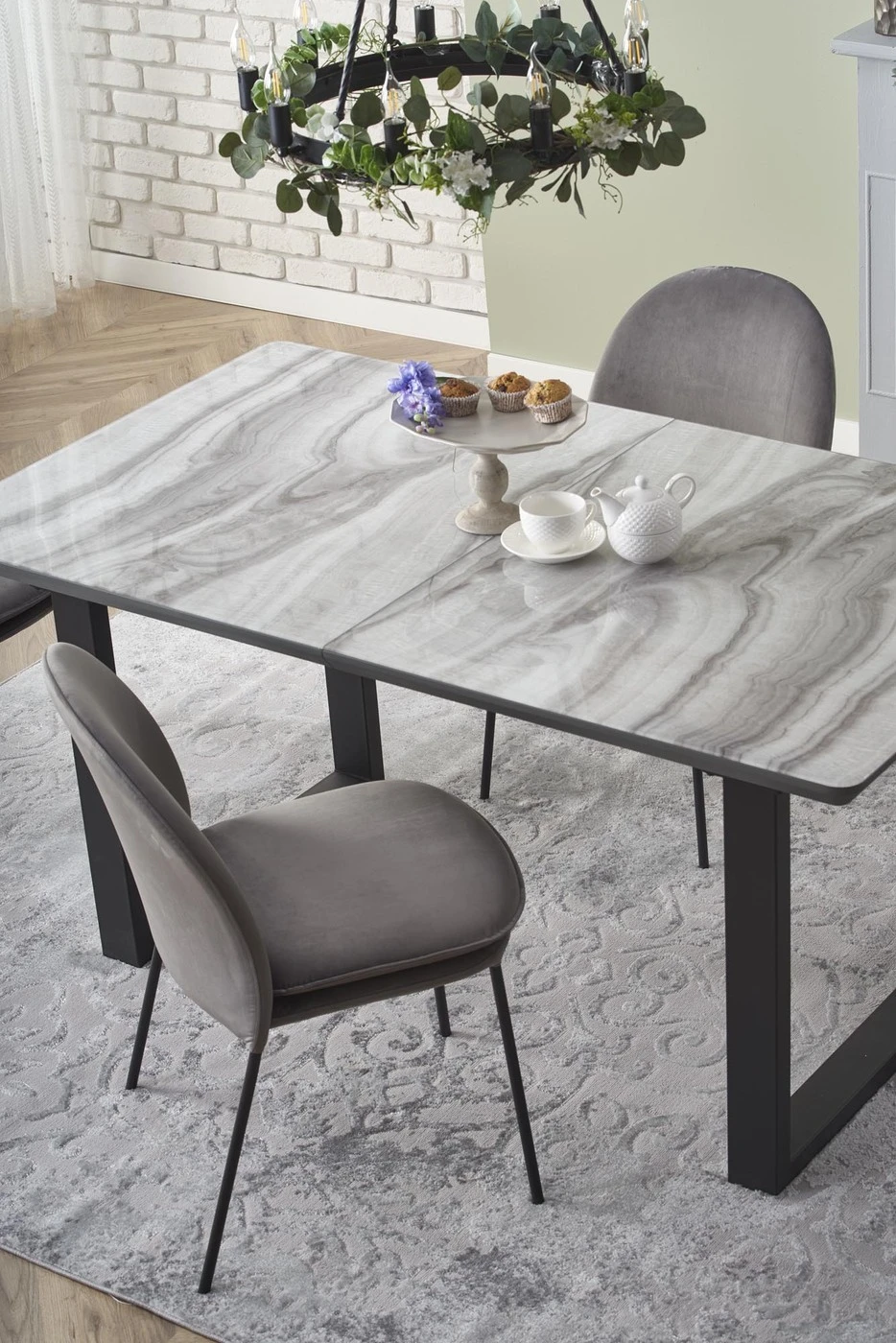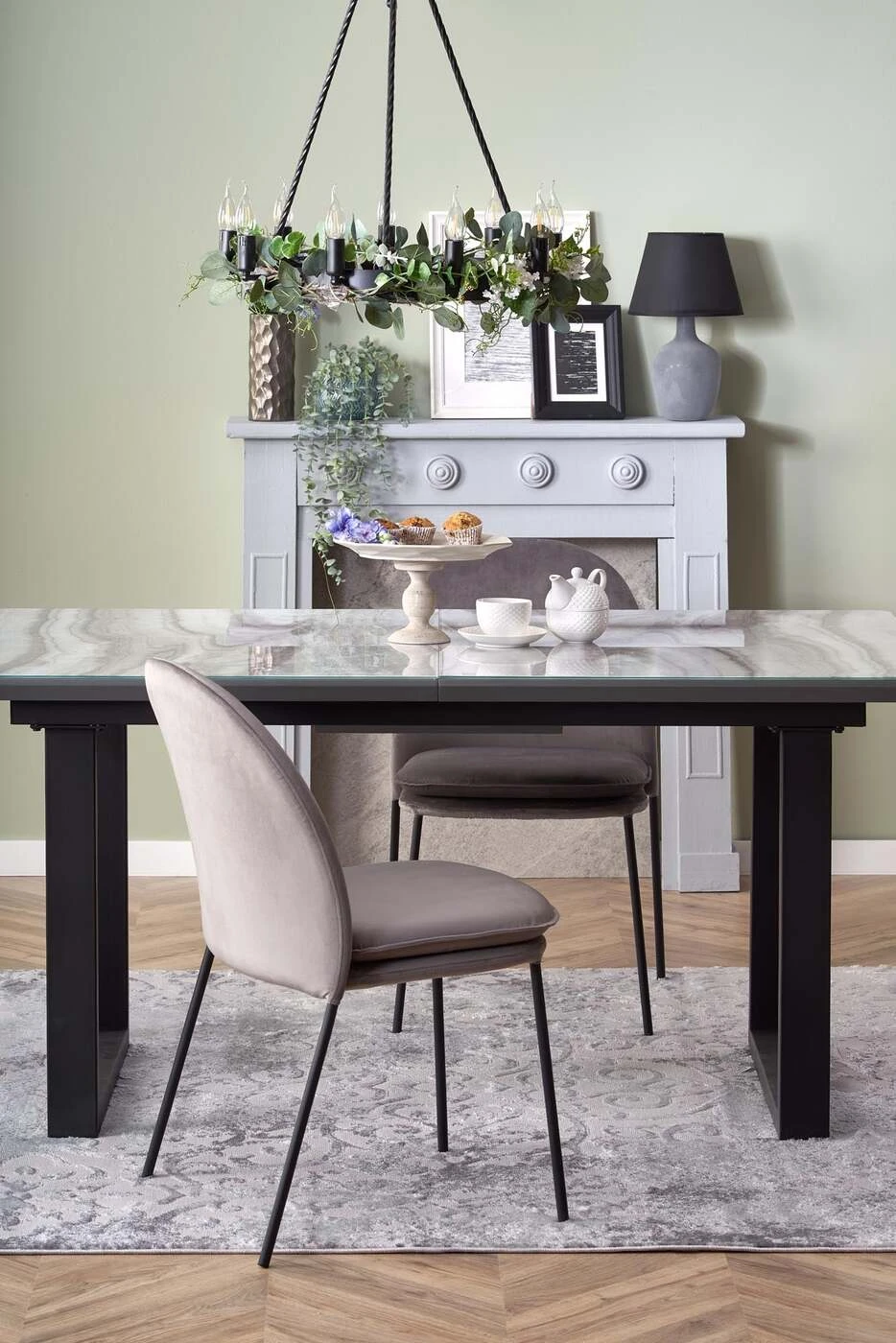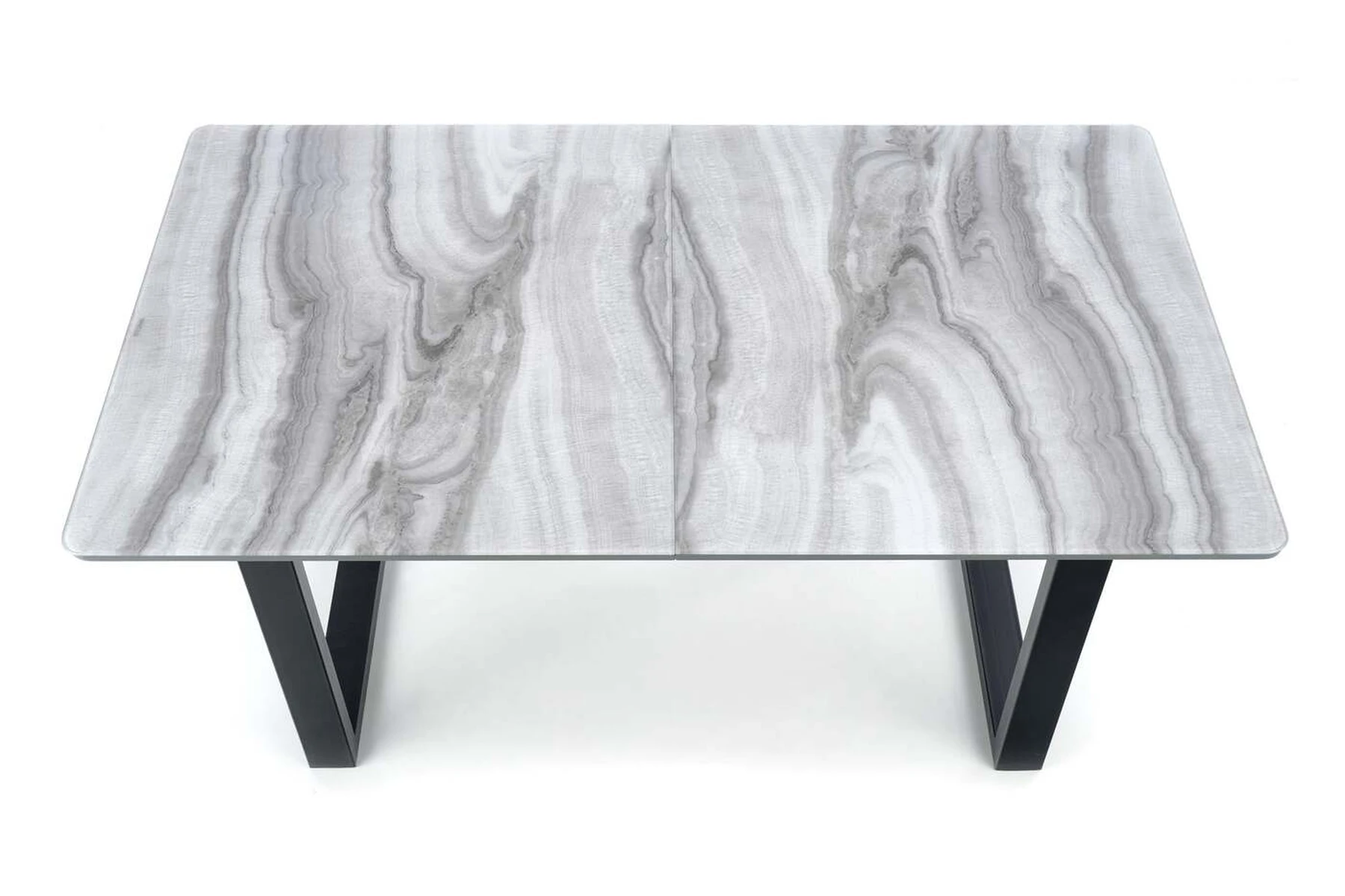 prailginamasis stalas, matmenys: 160-200/90/76cm, medžiaga: stiklas / lakuotas MDF / milteliniu būdu dažytas plienas, spalva: viršus - baltas marmuras / pilka, kojos - juodos