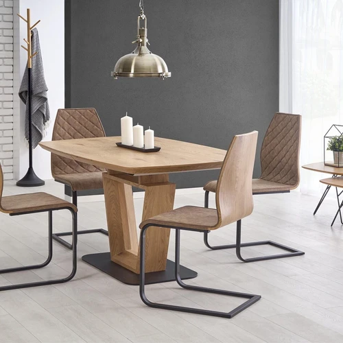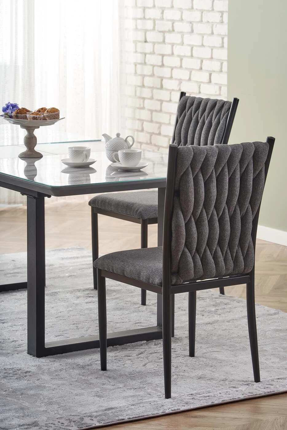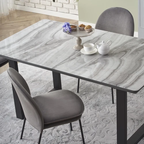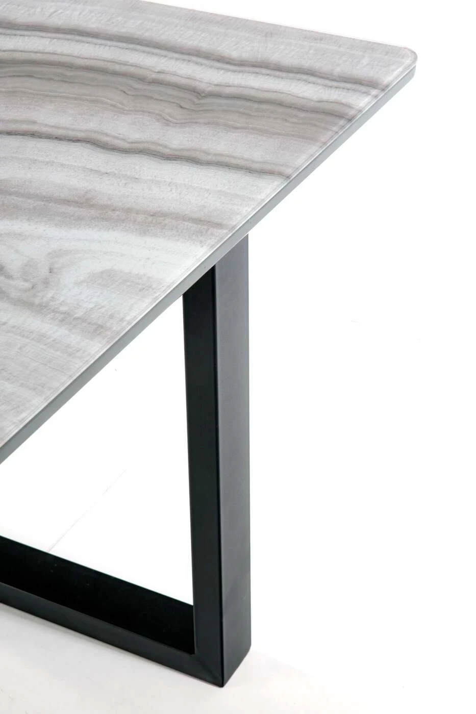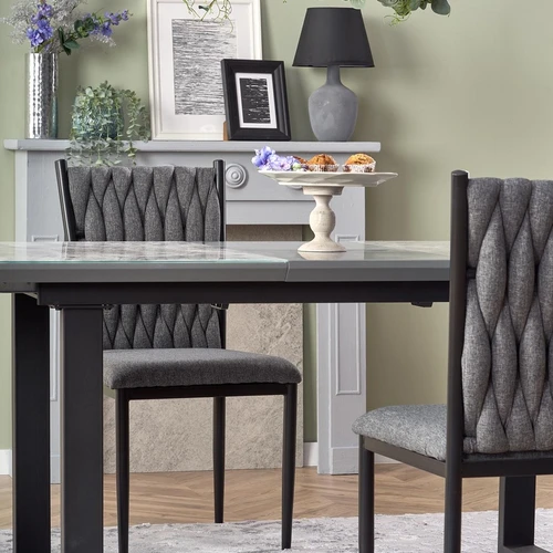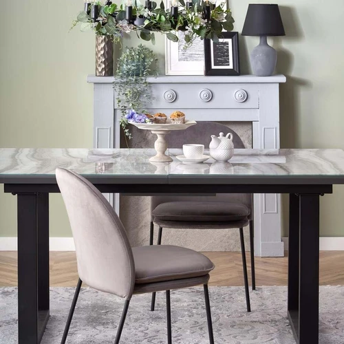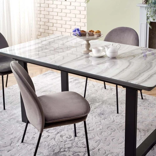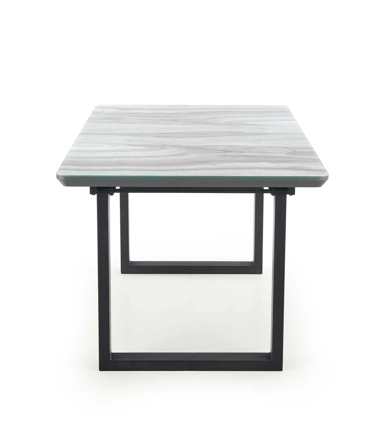 prailginamasis stalas, matmenys: 160-200/90/76cm, medžiaga: stiklas / lakuotas MDF / milteliniu būdu dažytas plienas, spalva: viršus - baltas marmuras / pilka, kojos - juodos