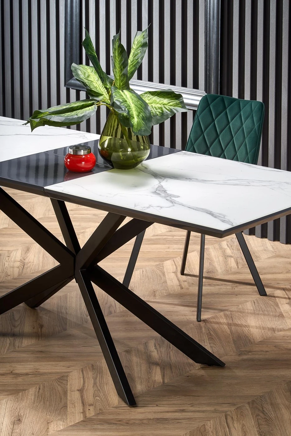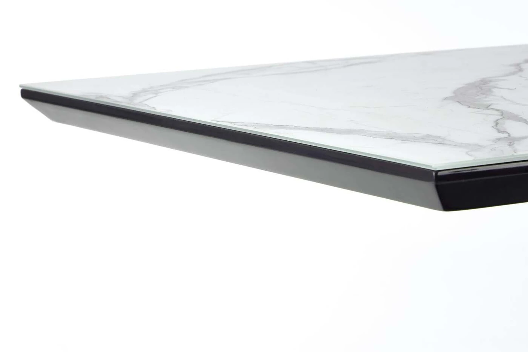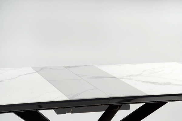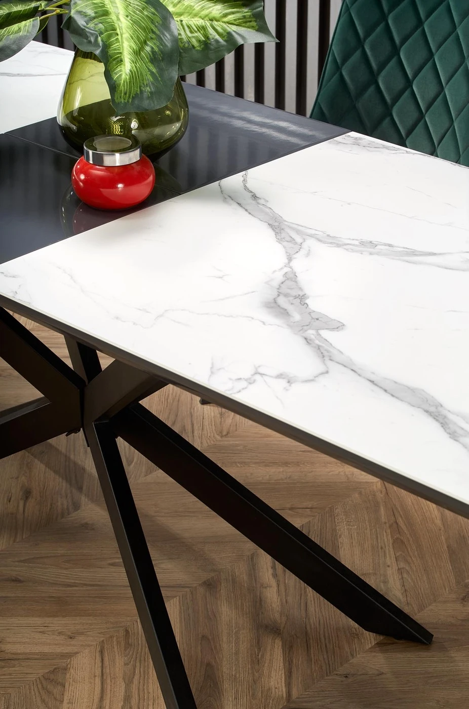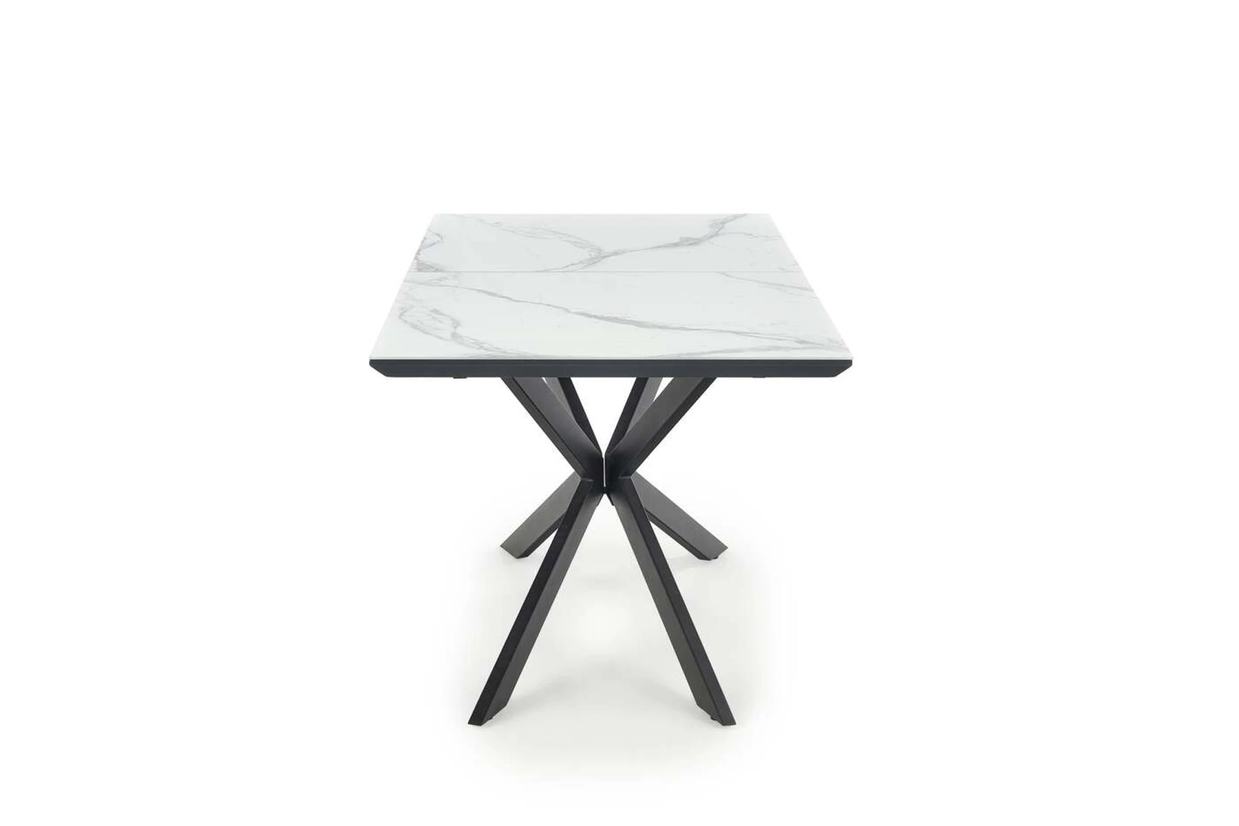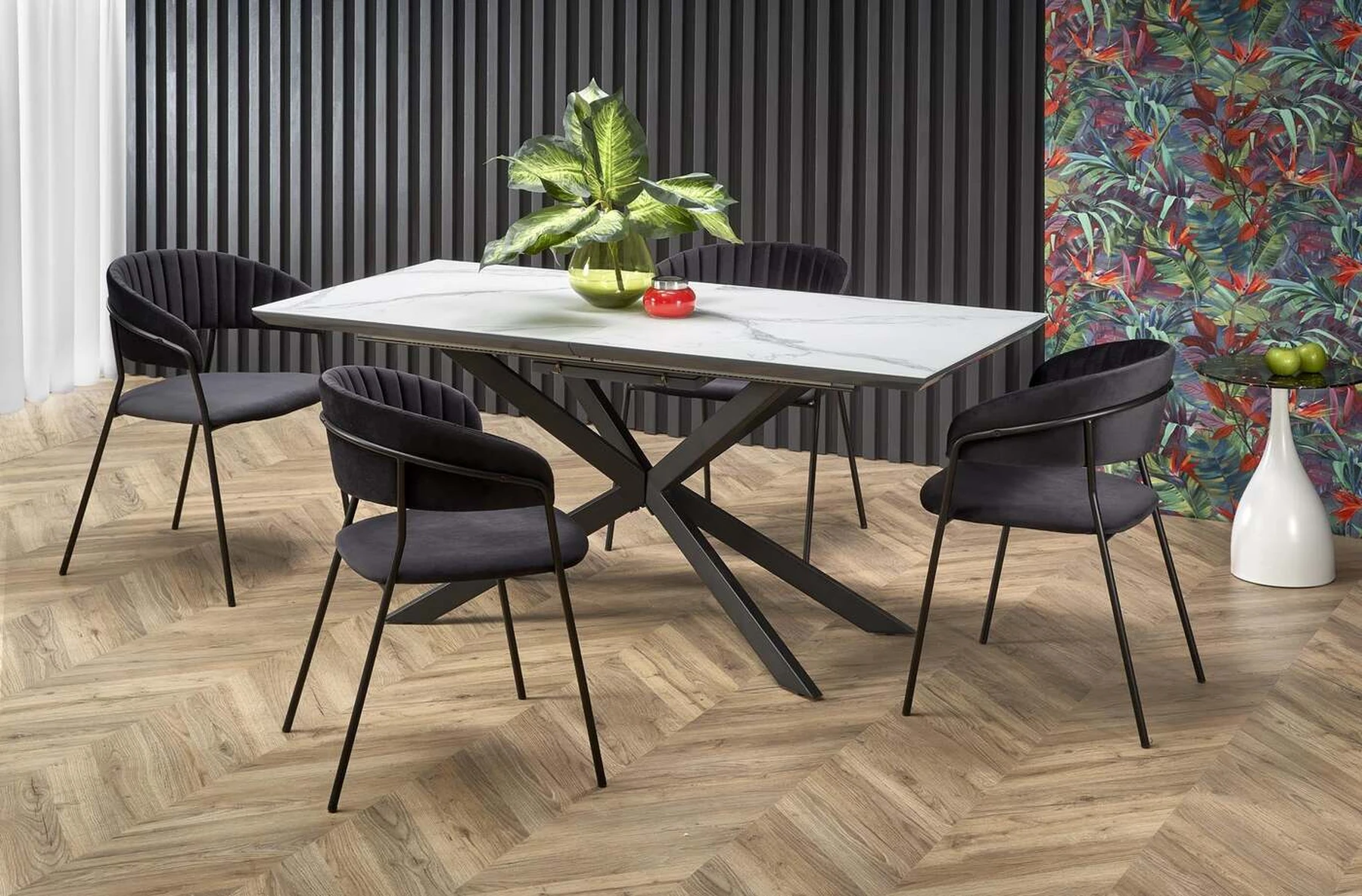 prailginamasis stalas, matmenys: 160-200/90/76 cm, medžiaga: keramika / lakuotas MDF / milteliniu būdu dengtas plienas, spalva: viršus - baltas marmuras / tamsiai pilka, kojos - juodos