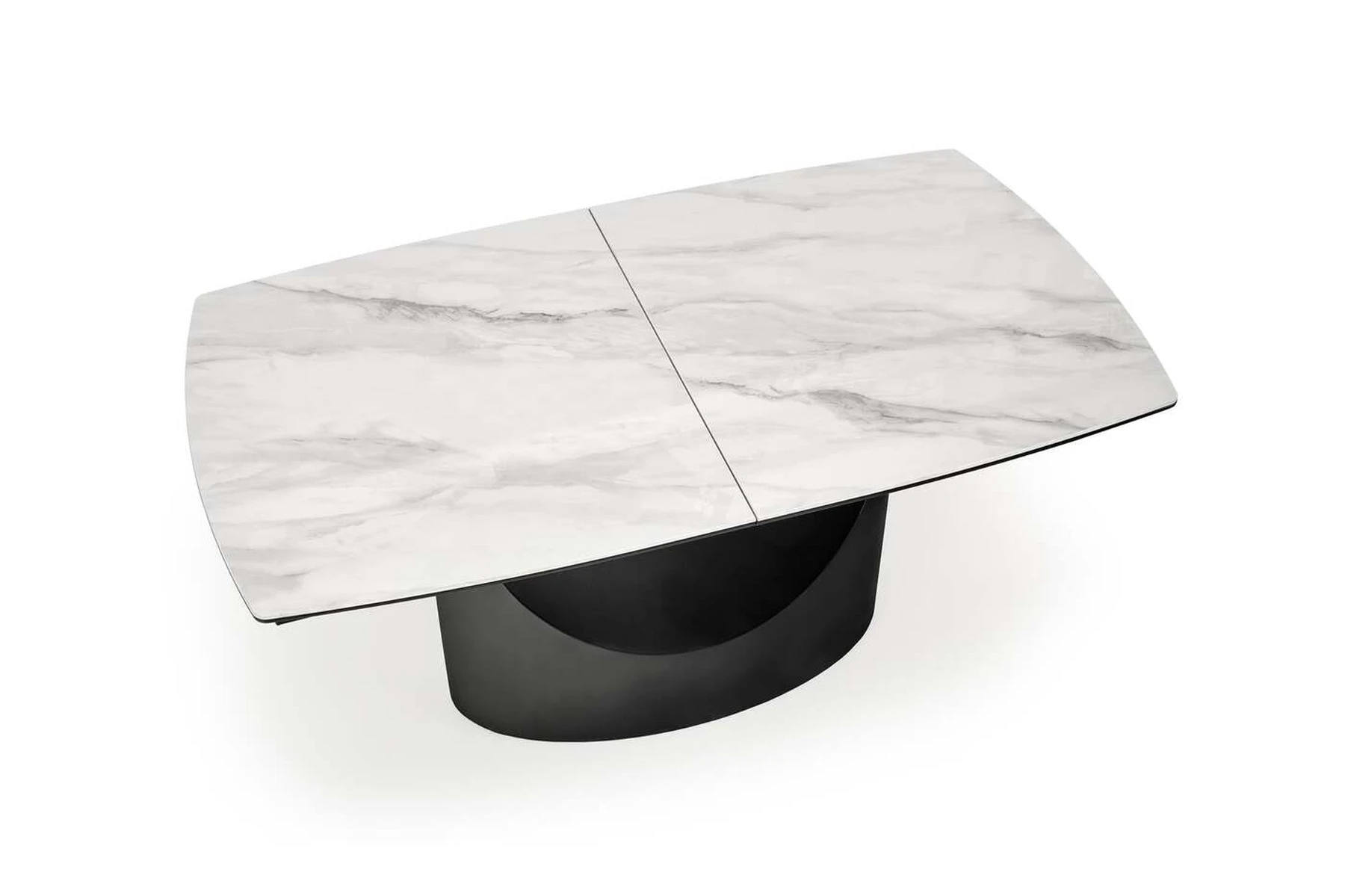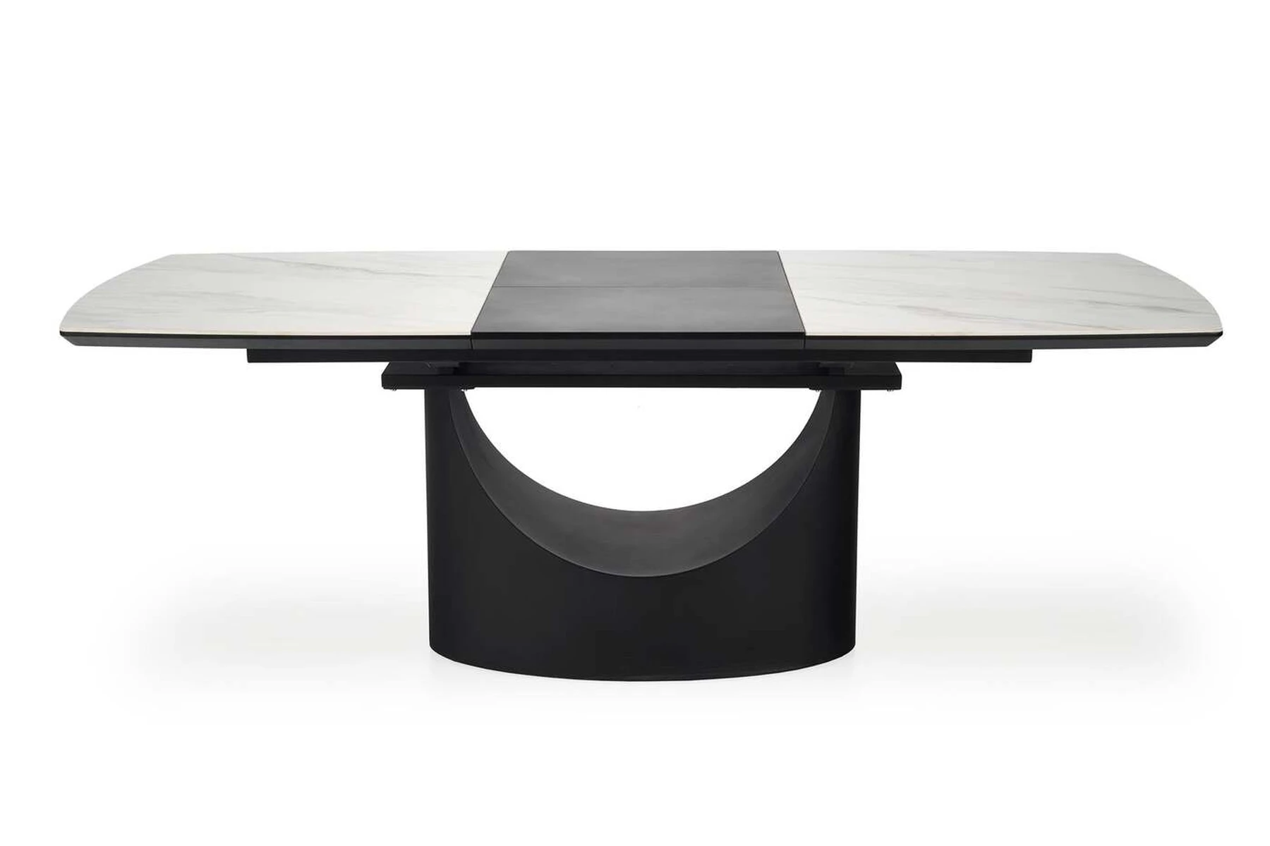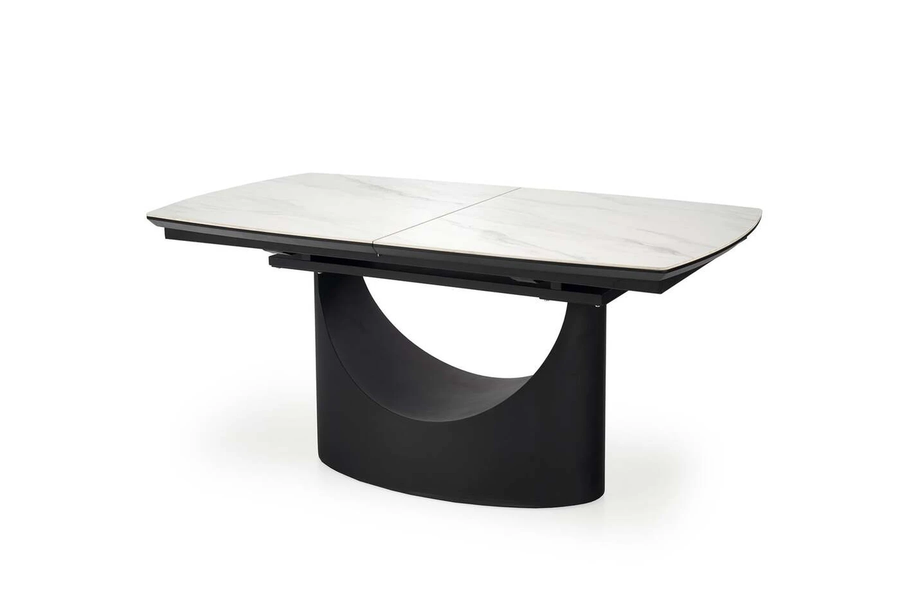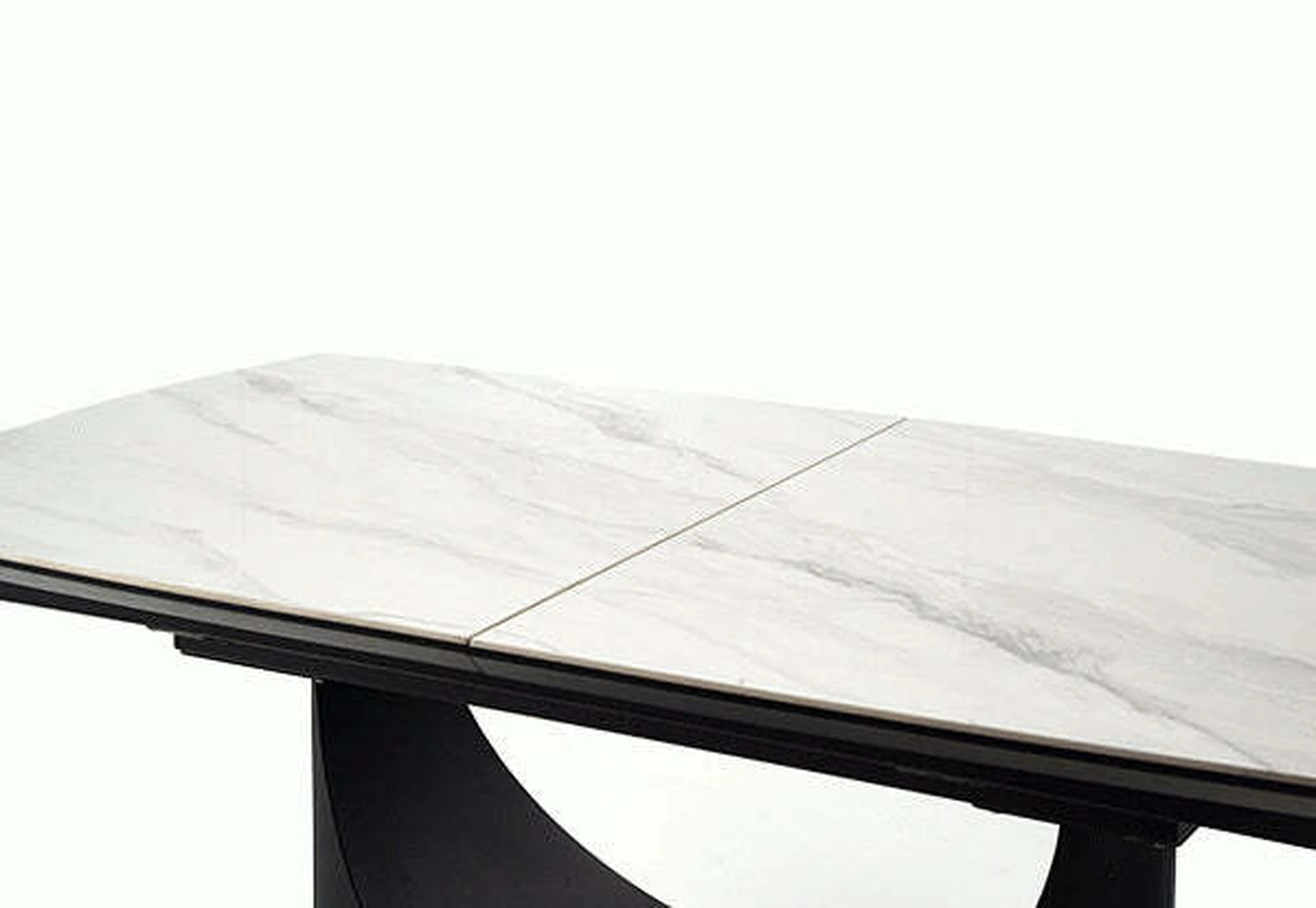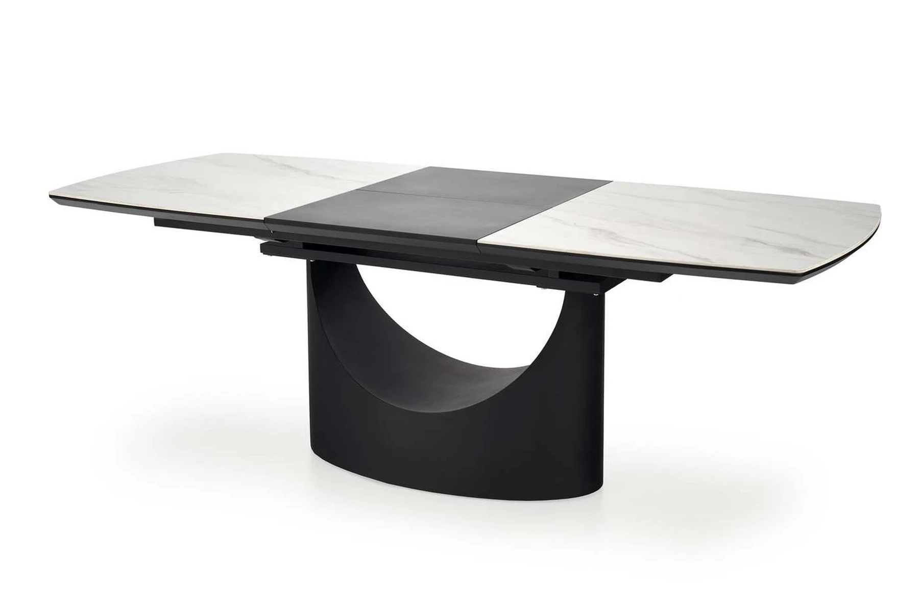matmenys: 160-220/90/77 cm, prailginimo stalas, medžiaga: keramika / lakuotas MDF / milteliniu būdu dažytas plienas, spalva: viršus - baltas marmuras / juodas, kojos - juodos