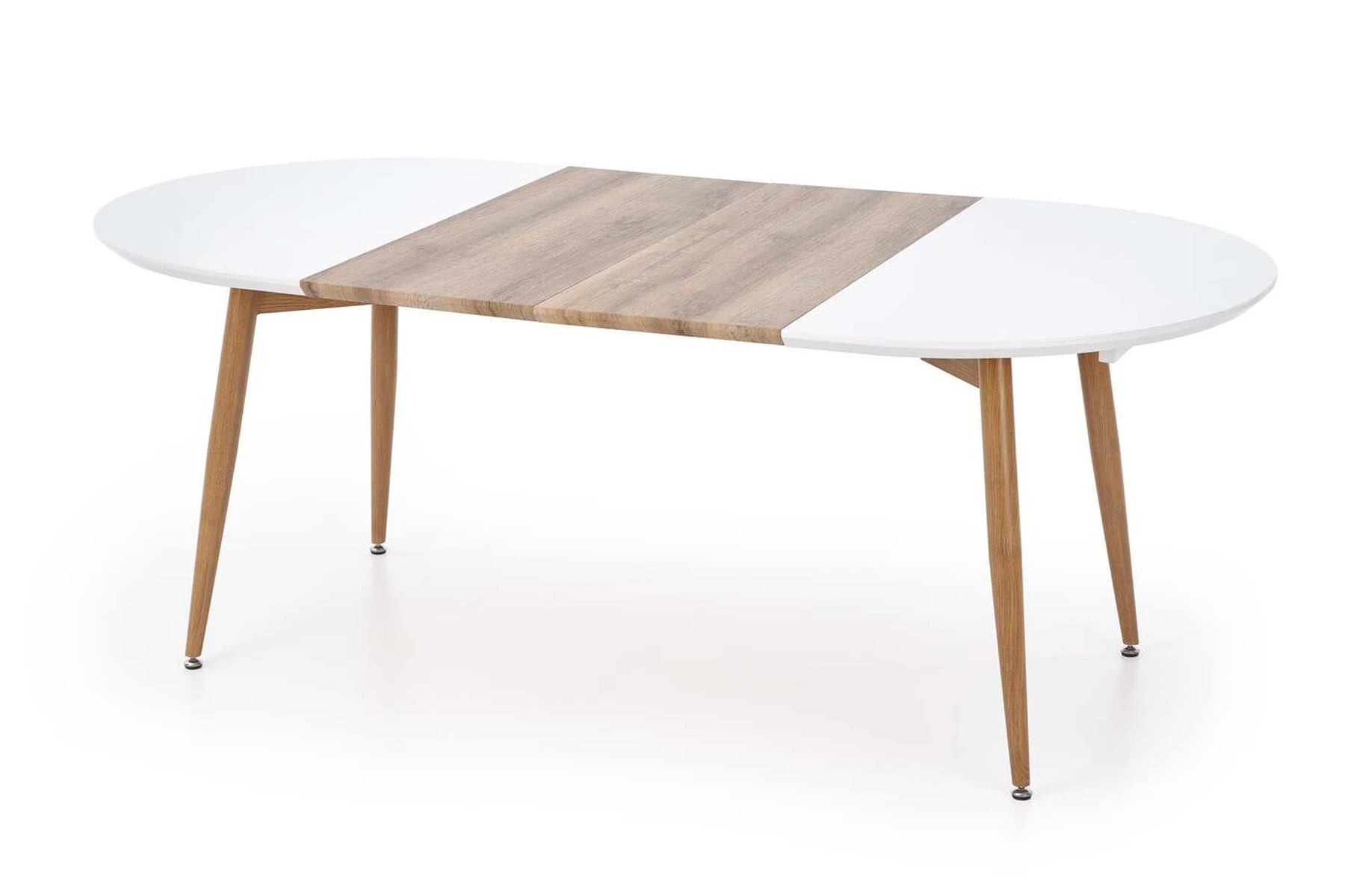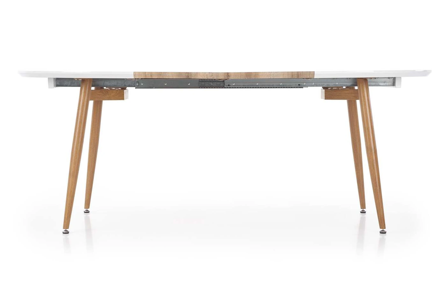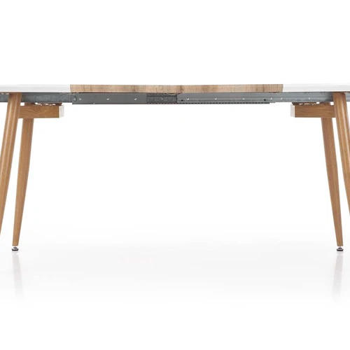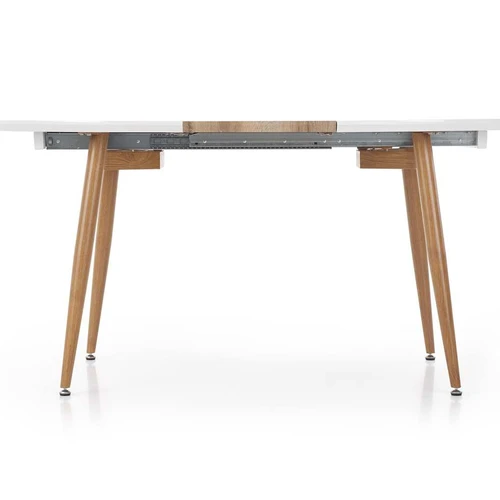 prailginamasis stalas, matmenys: 120-200/100/75 cm, medžiaga: lakuotas MDF / laminuotas MDF / dažytas plienas, spalva: viršus - baltas / medaus ąžuolas, kojos - medaus ąžuolas