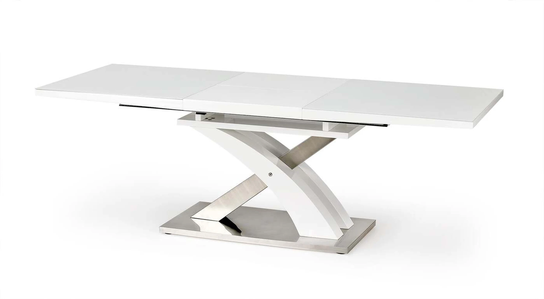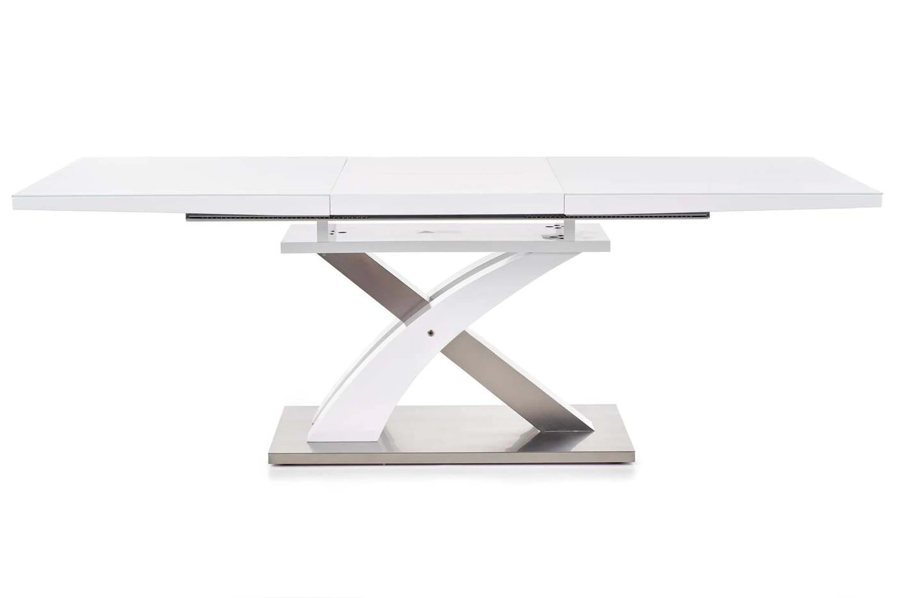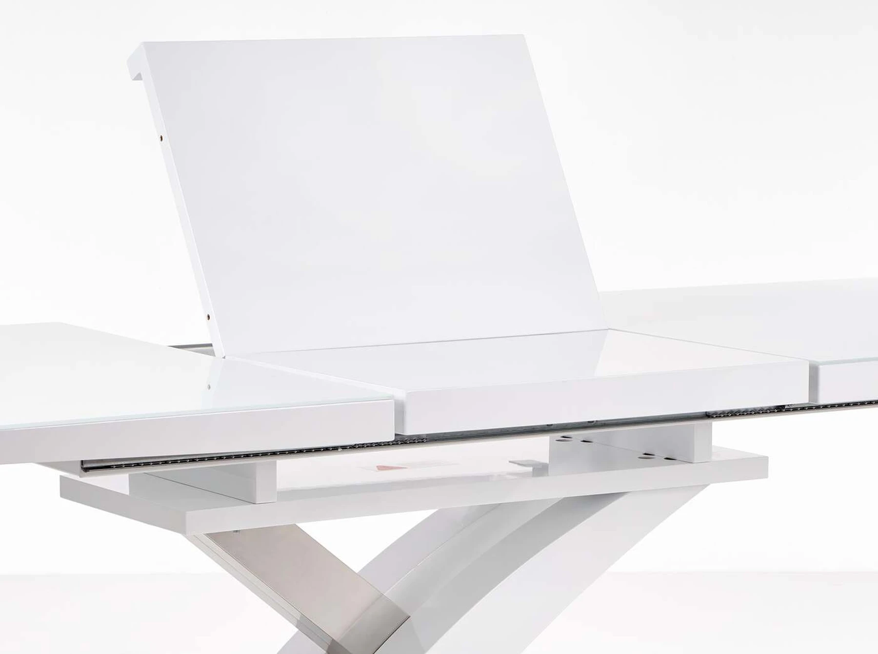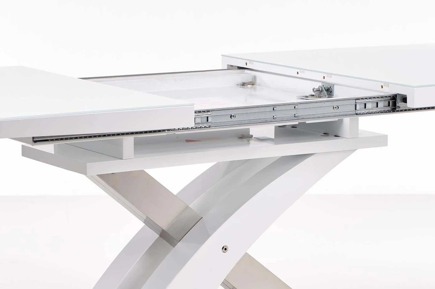 prailginamasis stalas, matmenys: 160÷220/90/78 cm, medžiaga: stiklas / lakuotas MDF / nerūdijantis plienas, spalva: stiklas - ypač balta, MDF - balta