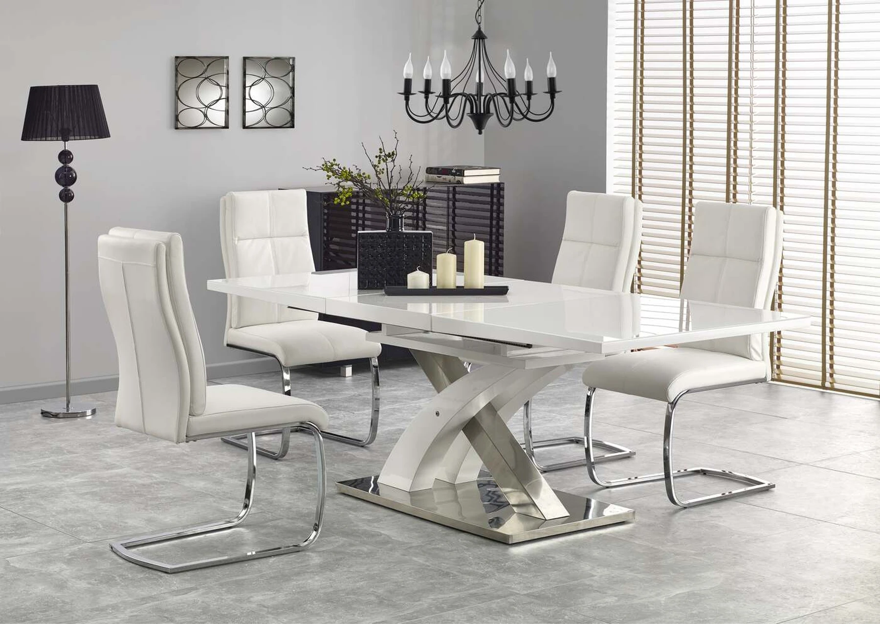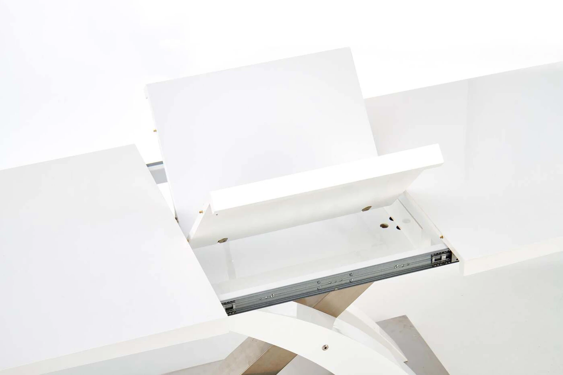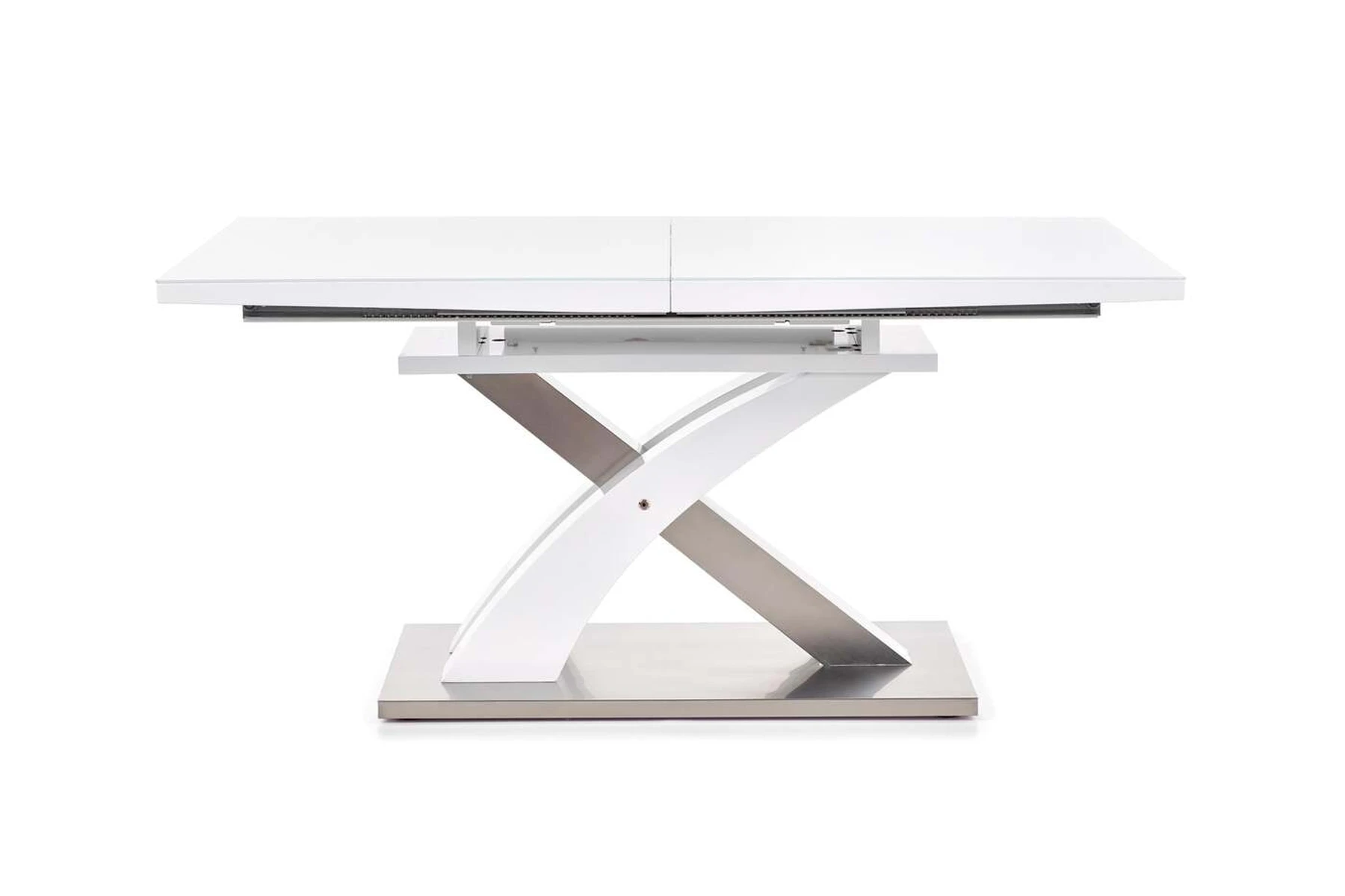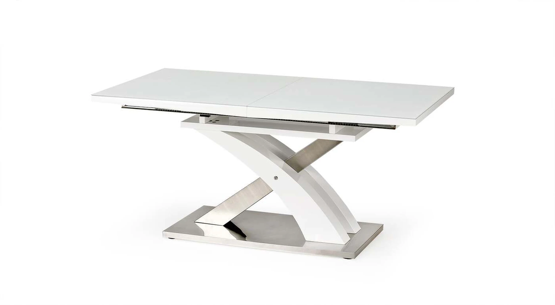 prailginamasis stalas, matmenys: 160÷220/90/78 cm, medžiaga: stiklas / lakuotas MDF / nerūdijantis plienas, spalva: stiklas - ypač balta, MDF - balta
