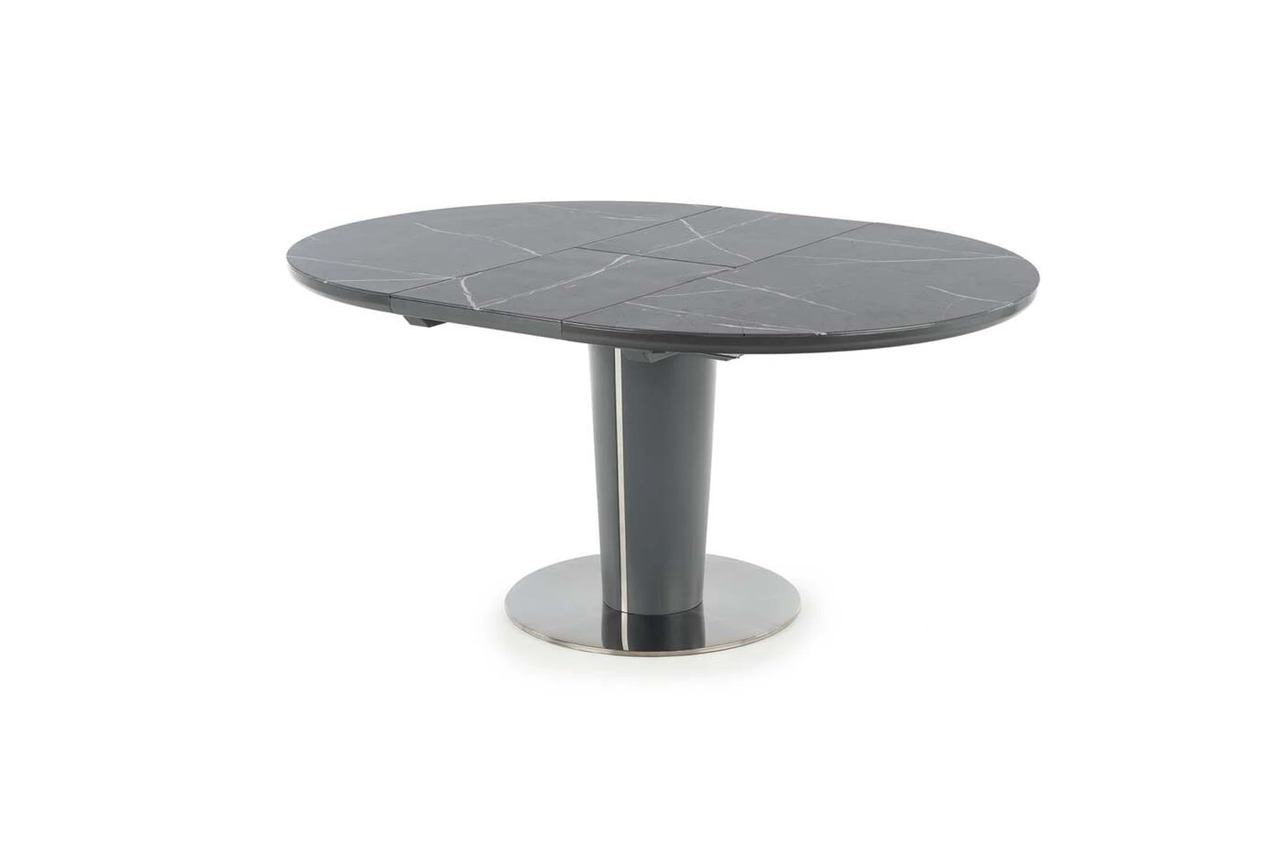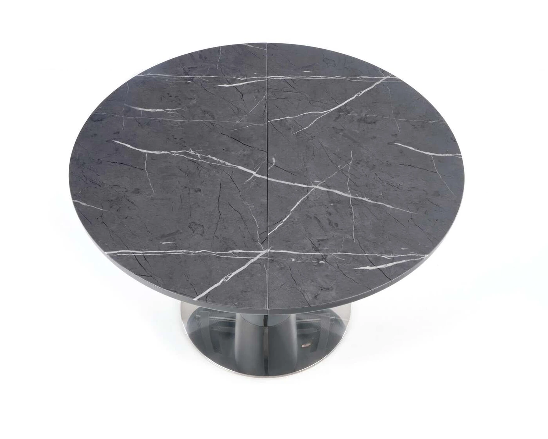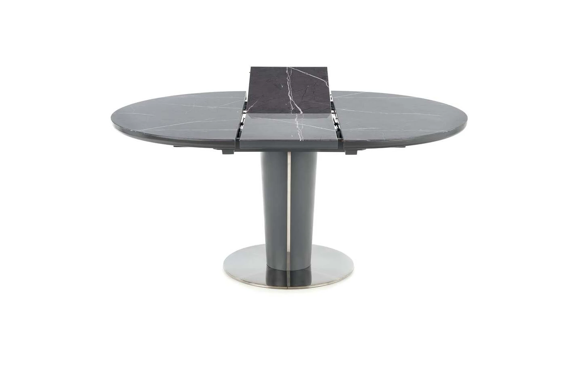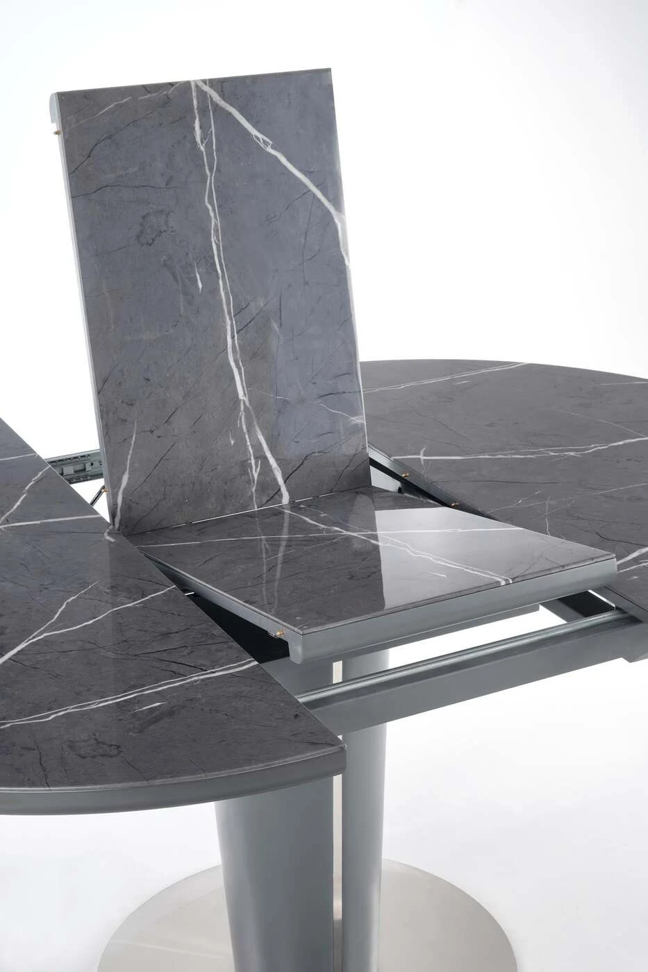 prailginamasis stalas, matmenys: 120-160/120/76cm, medžiaga: stiklas / lakuotas MDF / nerūdijantis plienas, spalva: viršus - pilkas marmuras, kojos - tamsiai pilka