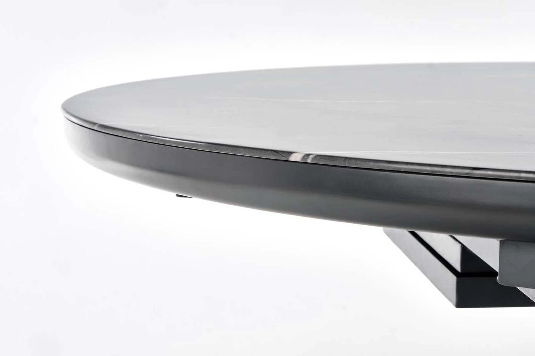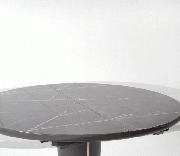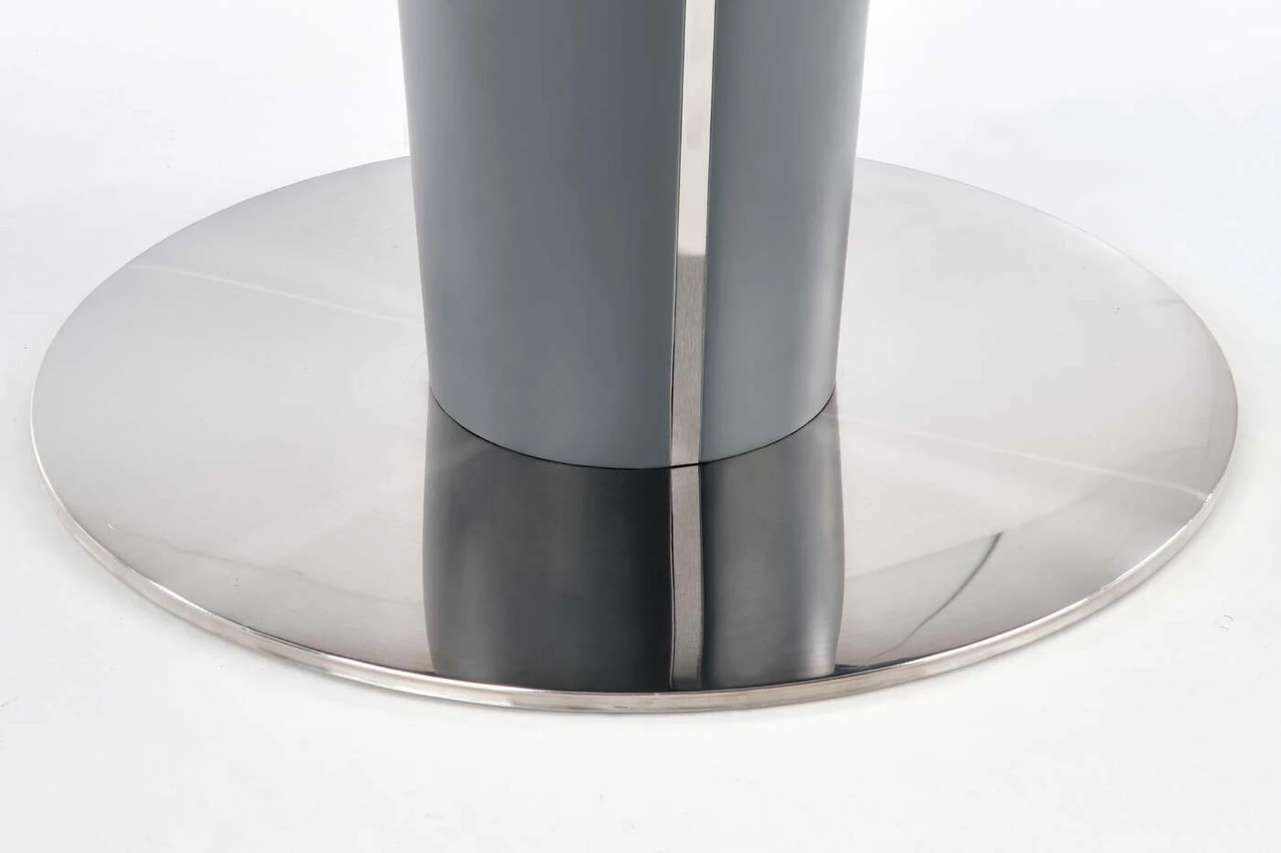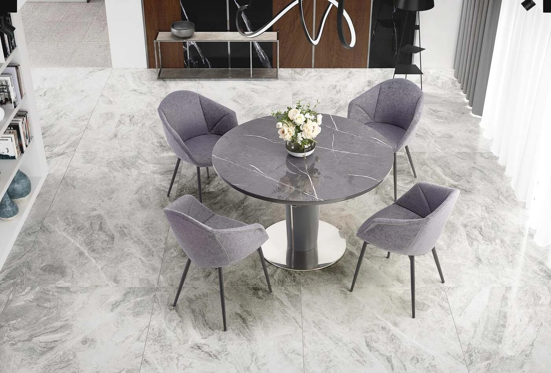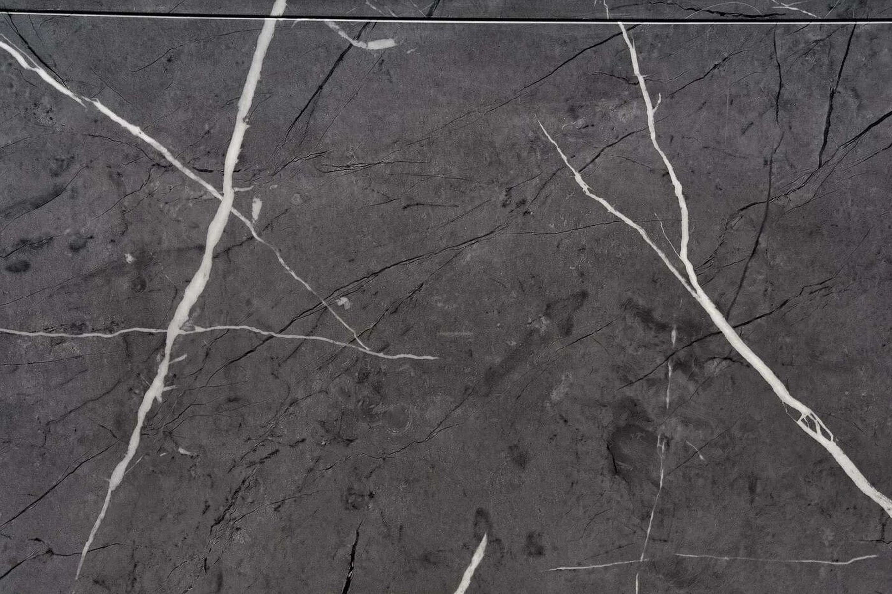 prailginamasis stalas, matmenys: 120-160/120/76cm, medžiaga: stiklas / lakuotas MDF / nerūdijantis plienas, spalva: viršus - pilkas marmuras, kojos - tamsiai pilka