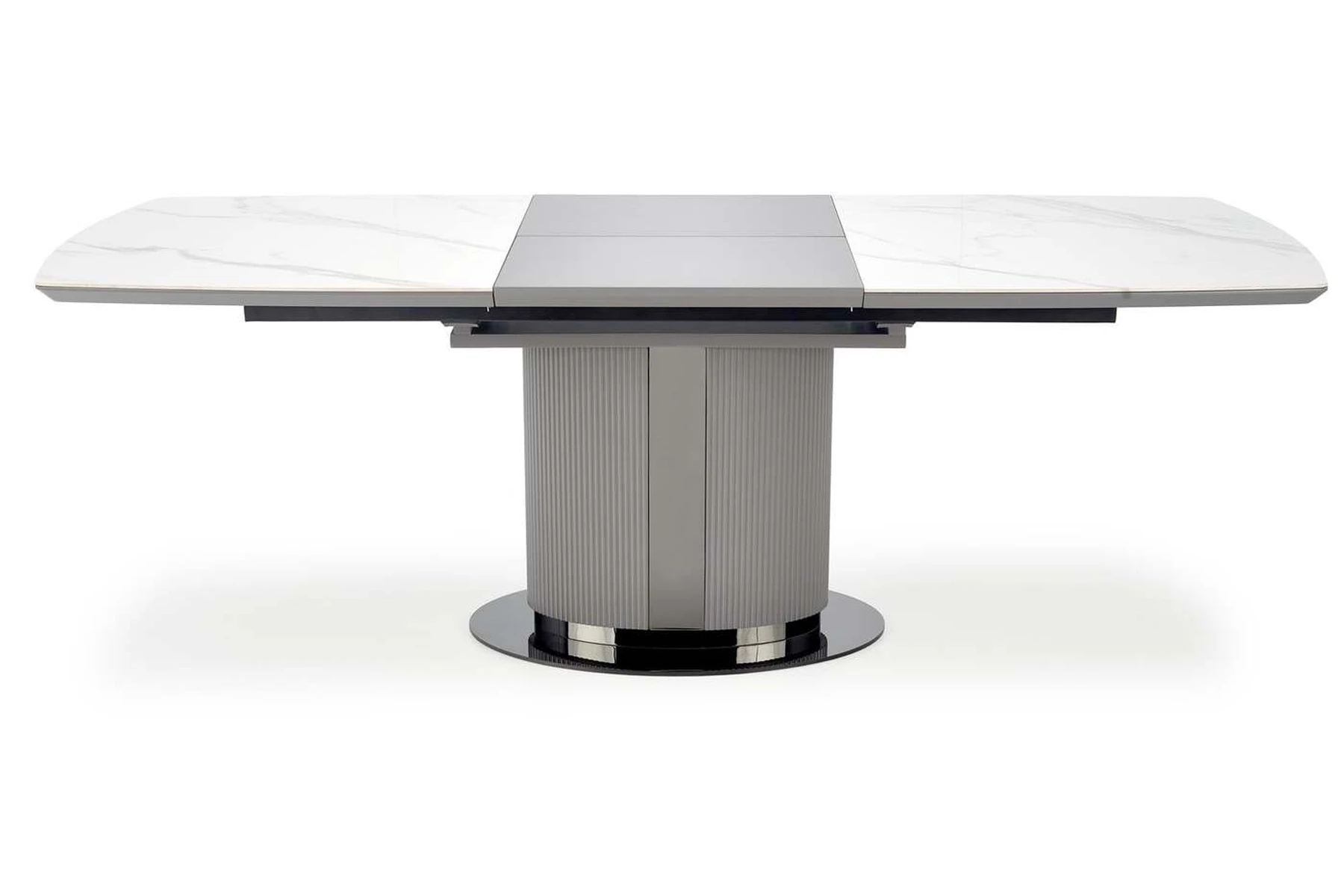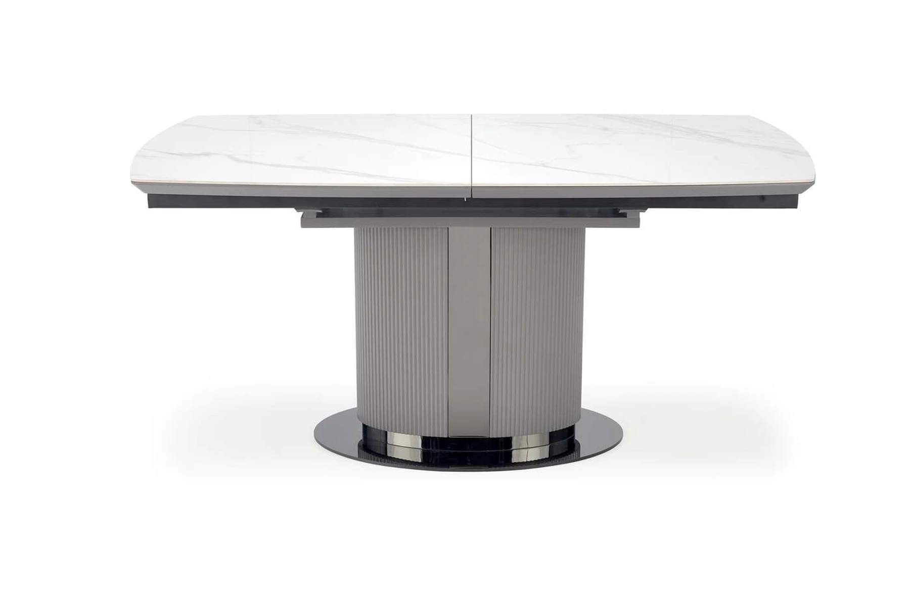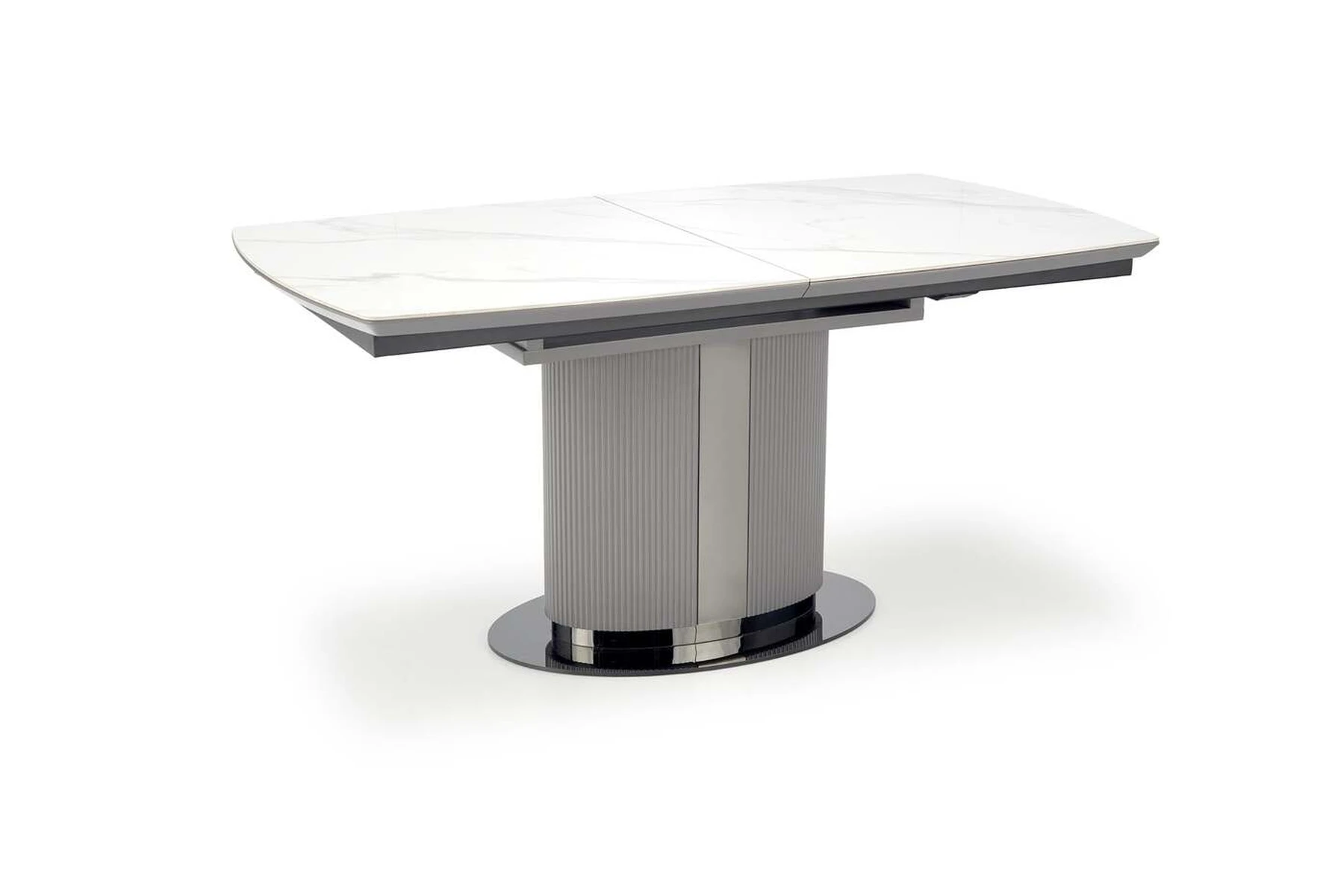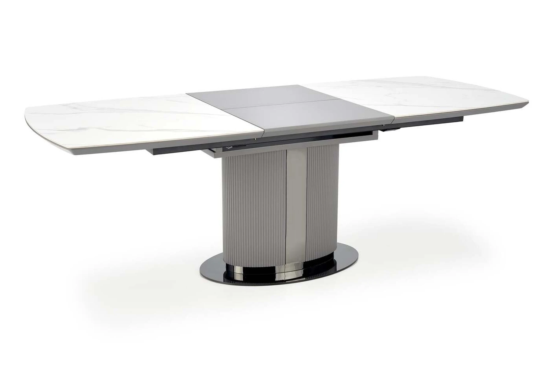 matmenys: 160-220/90/76 cm, prailginamasis stalas, medžiaga: keramika / lakuotas MDF / milteliniu būdu dažytas plienas, spalva: viršus - baltas marmuras / pilka, kojos - šviesiai pilka / juoda