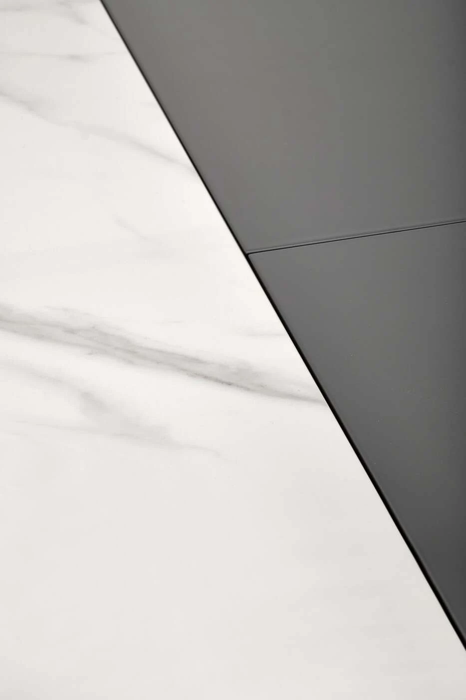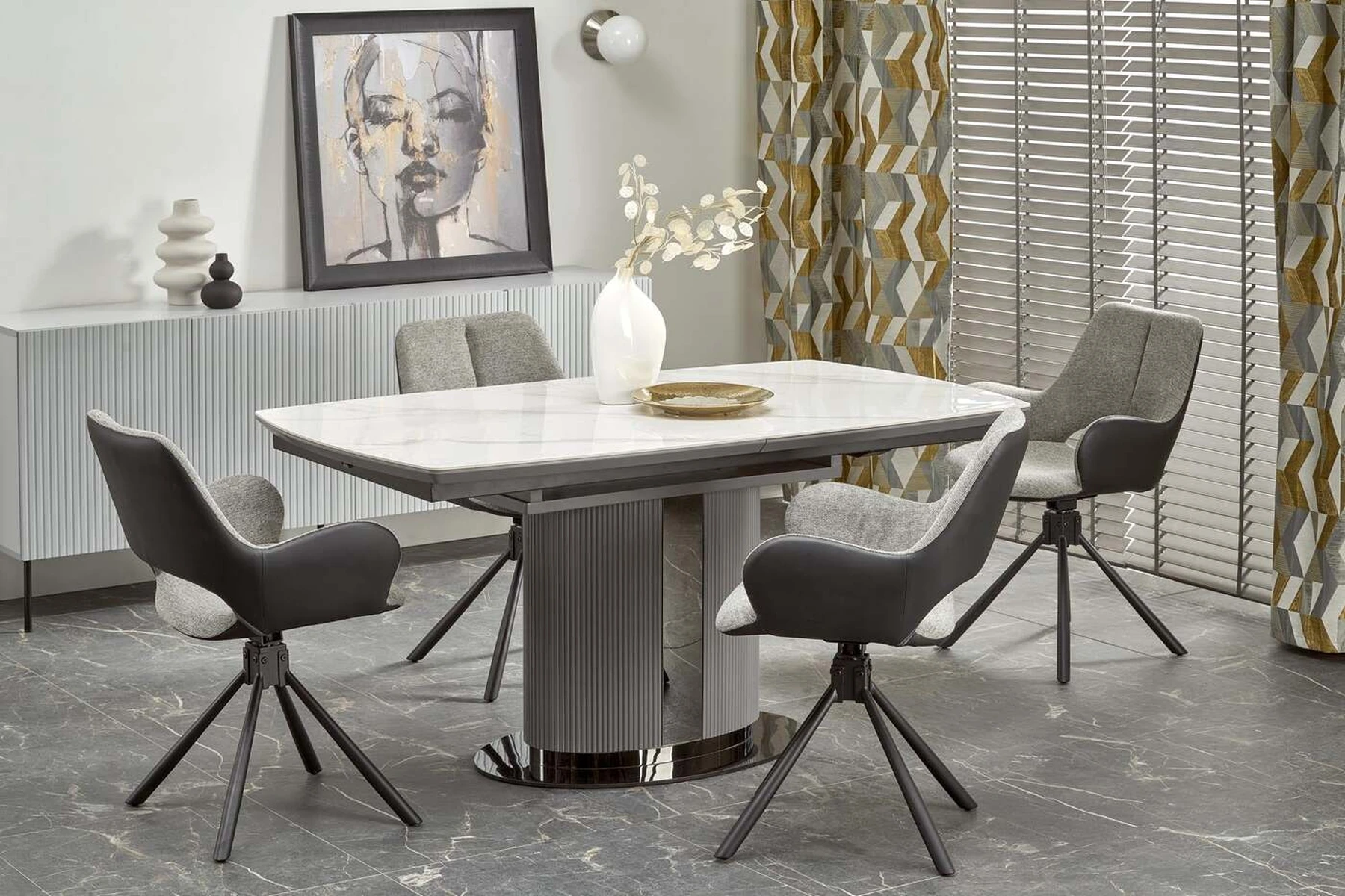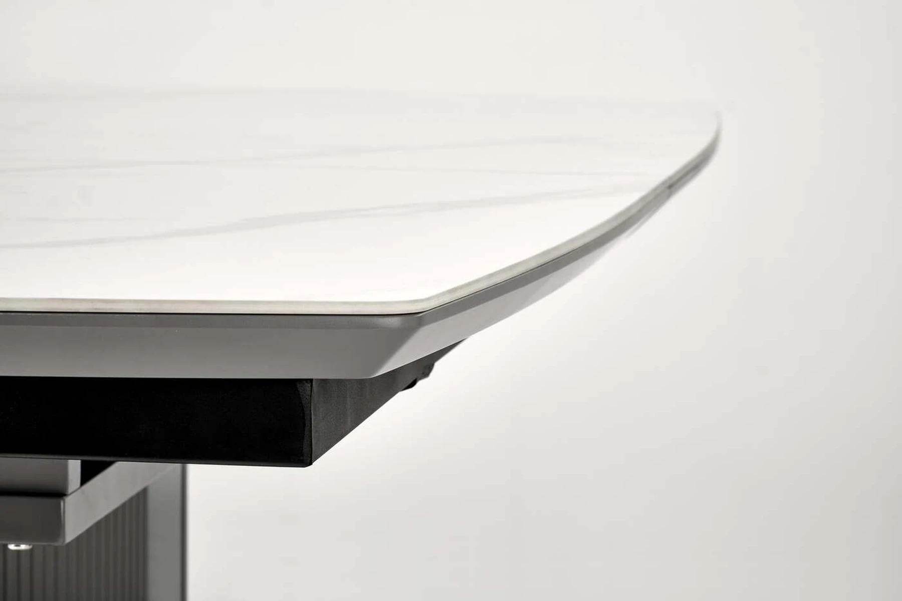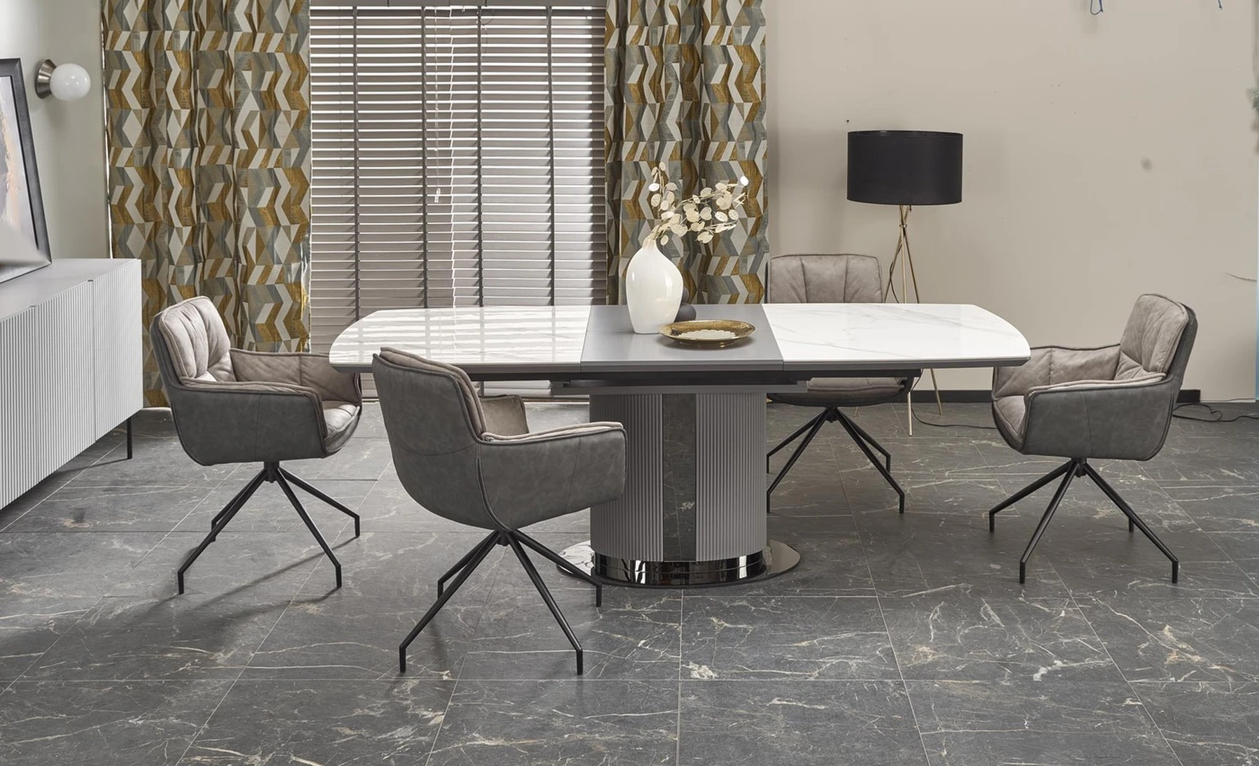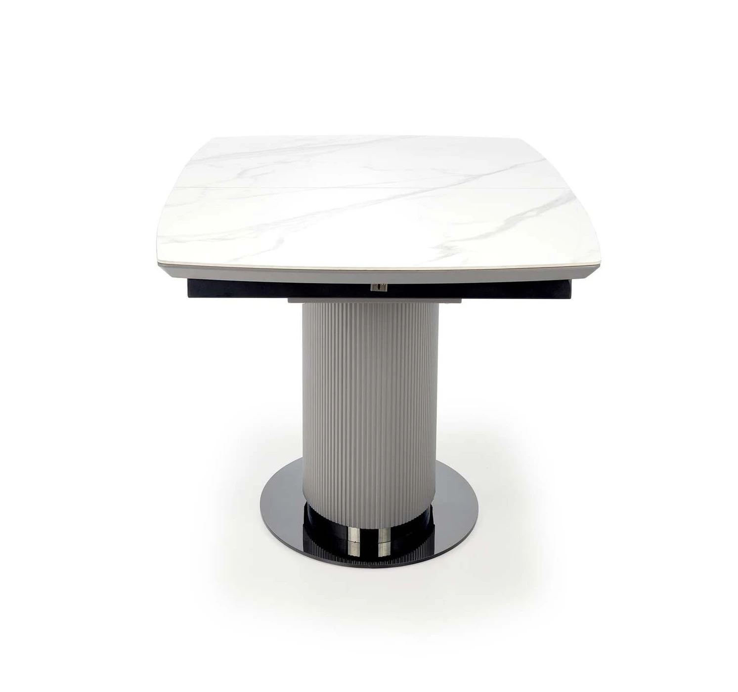 matmenys: 160-220/90/76 cm, prailginamasis stalas, medžiaga: keramika / lakuotas MDF / milteliniu būdu dažytas plienas, spalva: viršus - baltas marmuras / pilka, kojos - šviesiai pilka / juoda