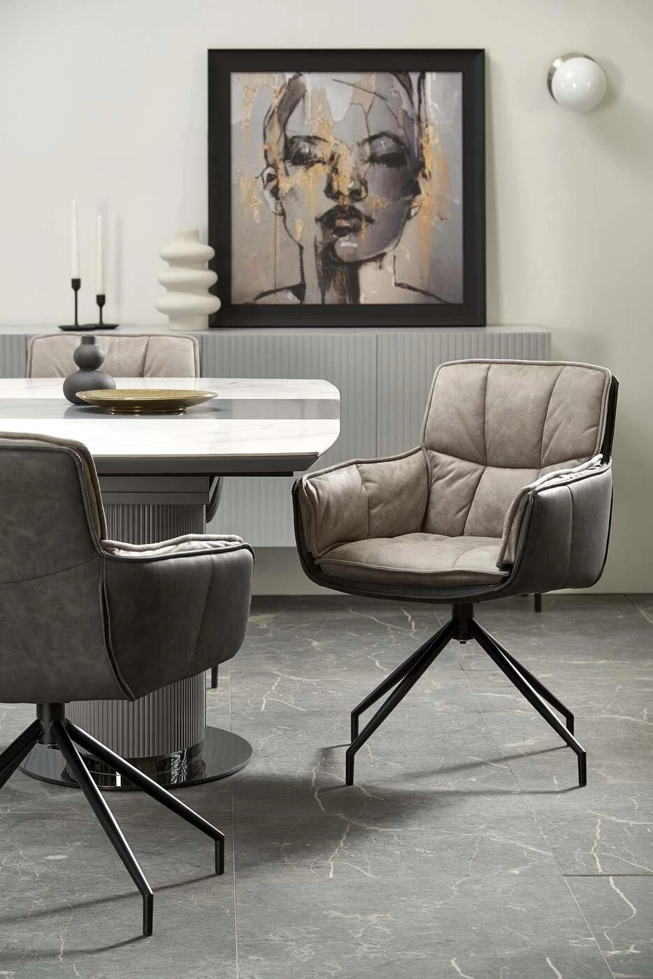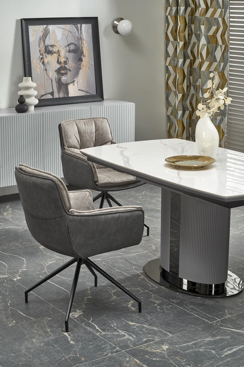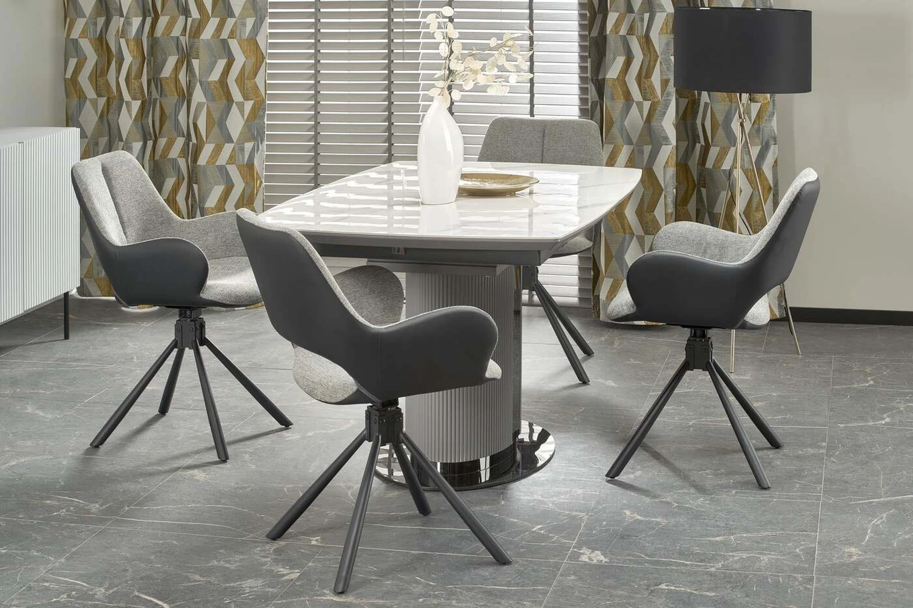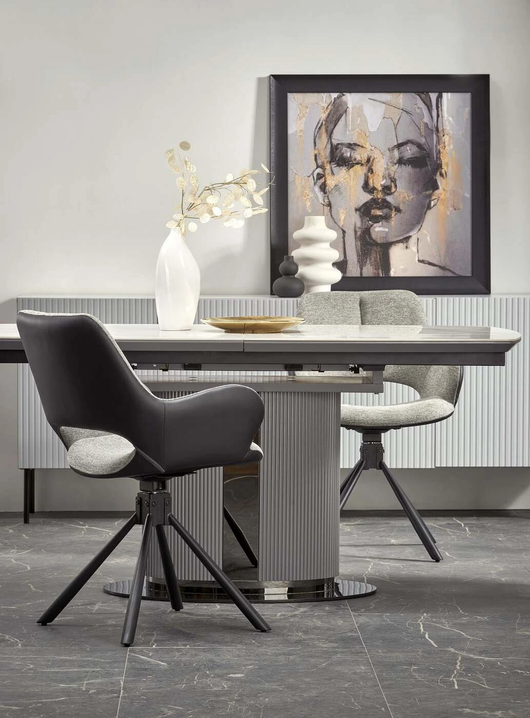matmenys: 160-220/90/76 cm, prailginamasis stalas, medžiaga: keramika / lakuotas MDF / milteliniu būdu dažytas plienas, spalva: viršus - baltas marmuras / pilka, kojos - šviesiai pilka / juoda