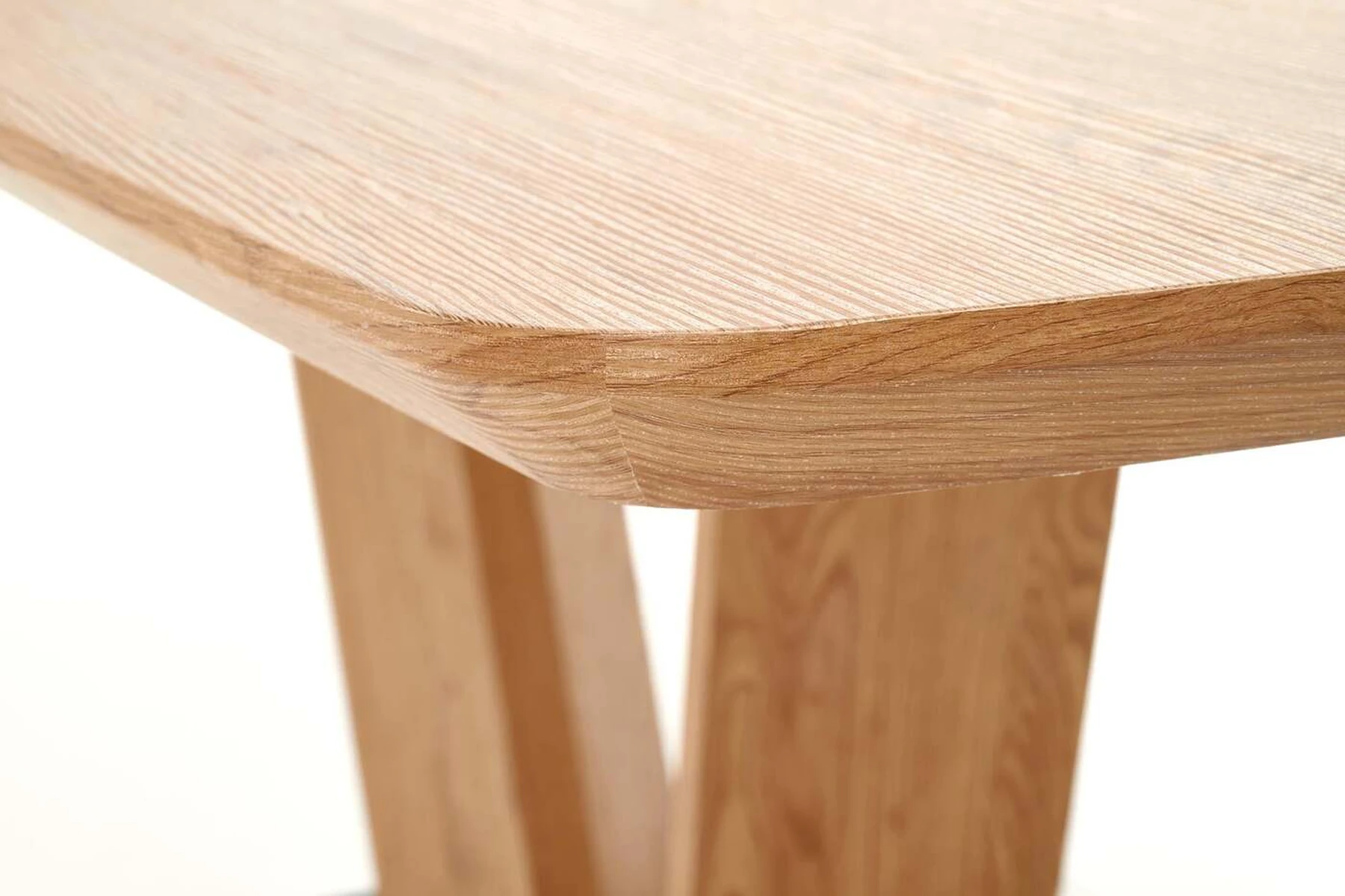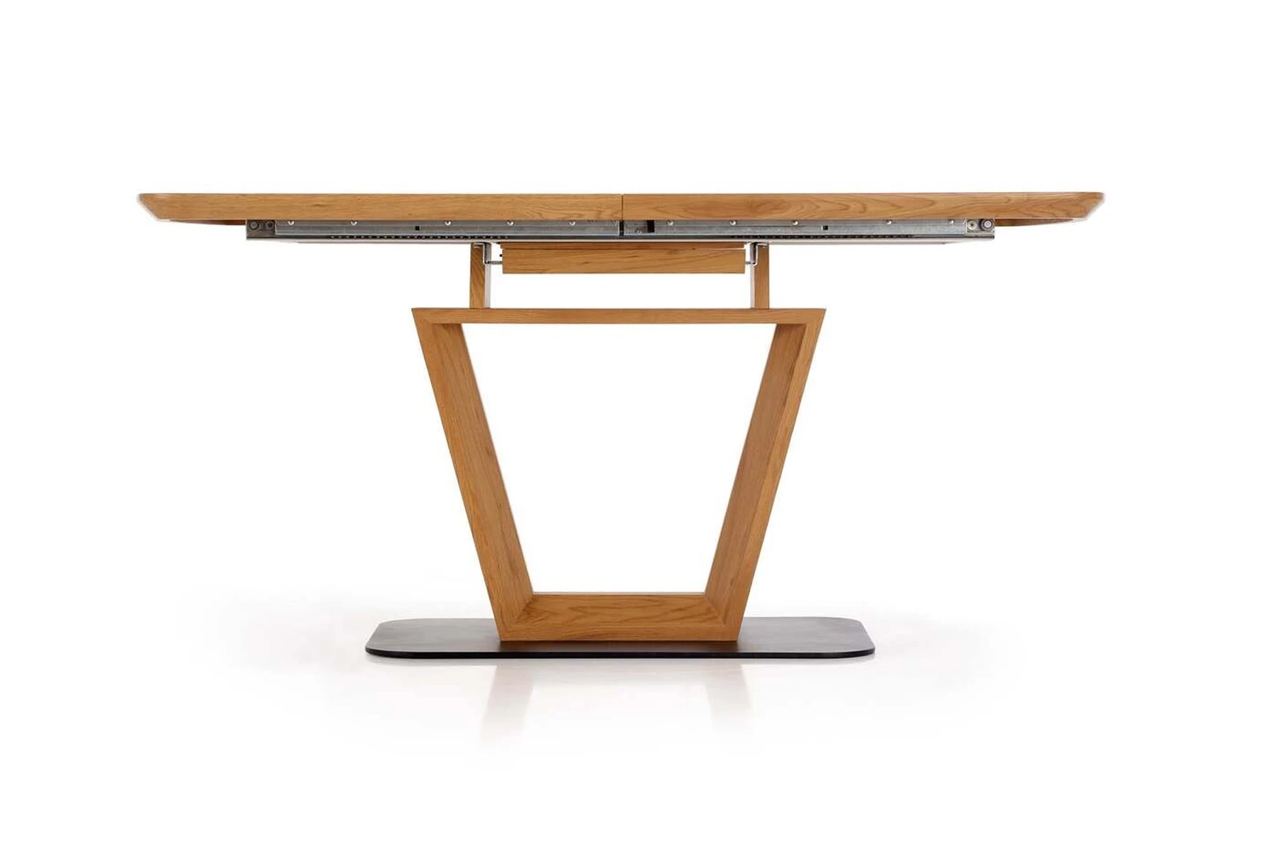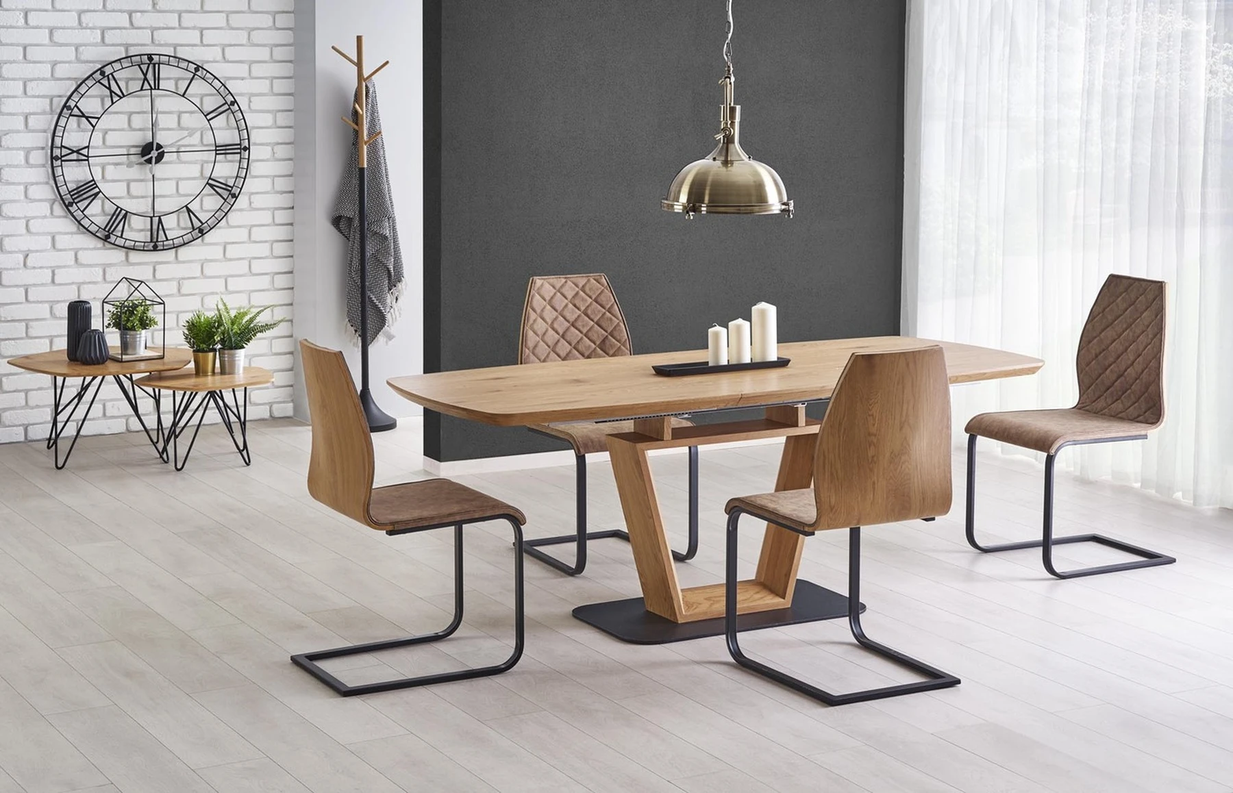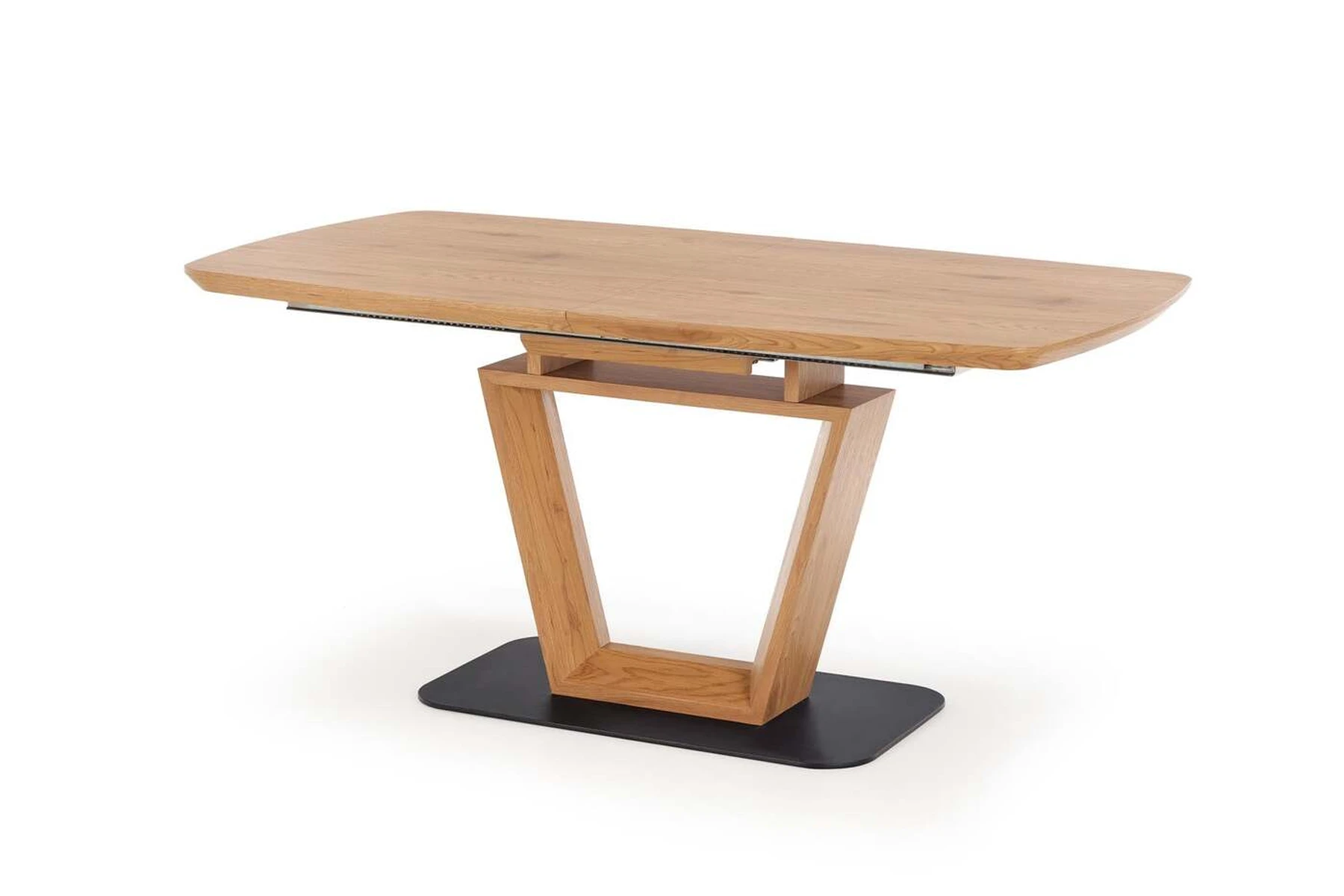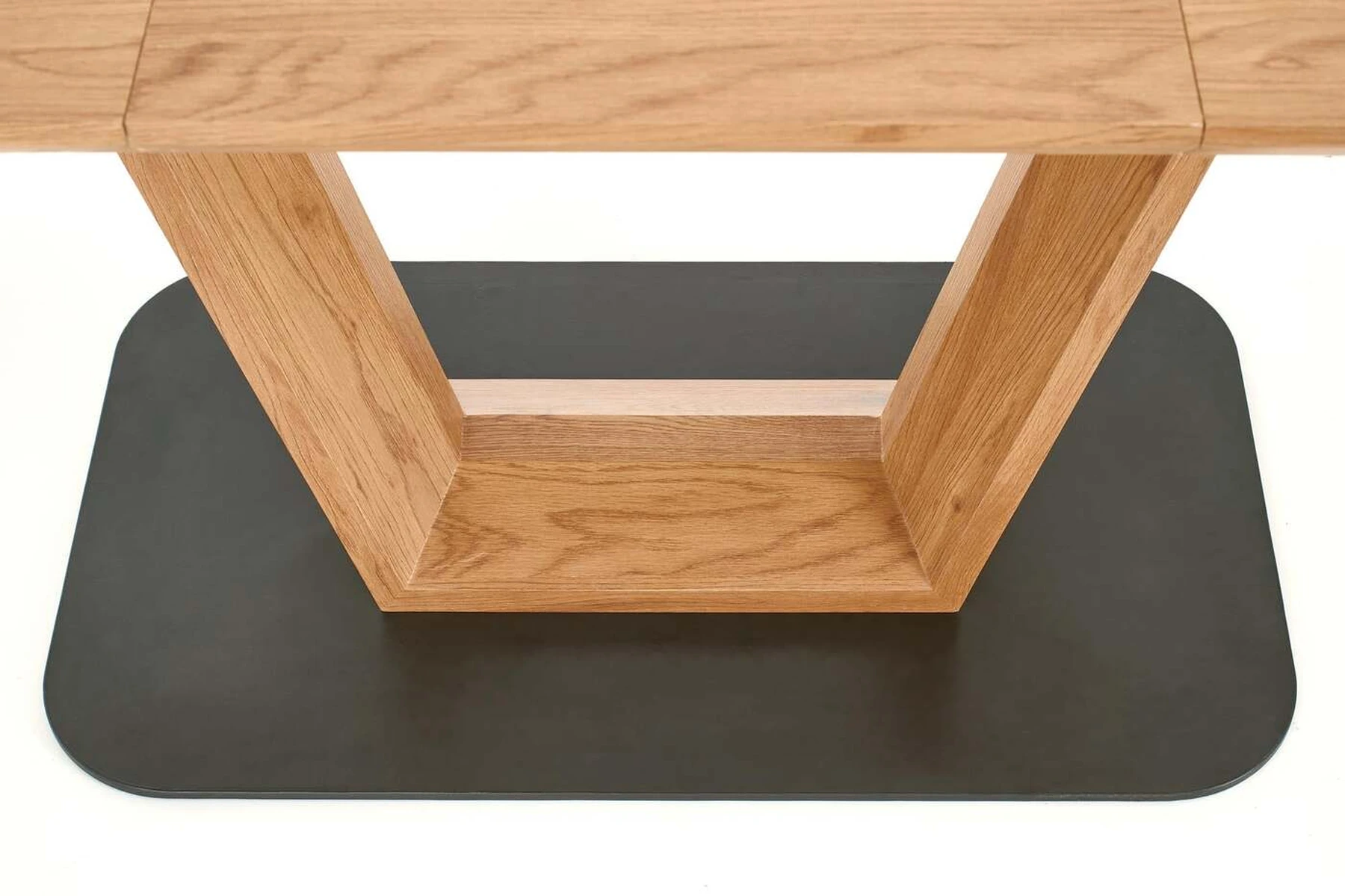 matmenys: 160-220/90/76 cm, prailginamasis stalas, medžiaga: MDF + natūrali fanera / milteliniu būdu dažytas plienas, spalva: viršus - natūralus ąžuolas, kojos - juodos