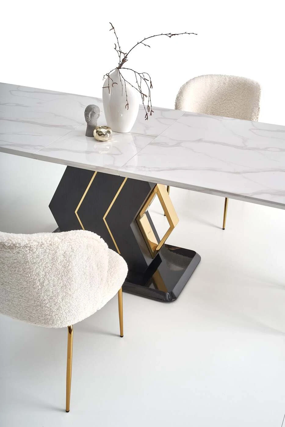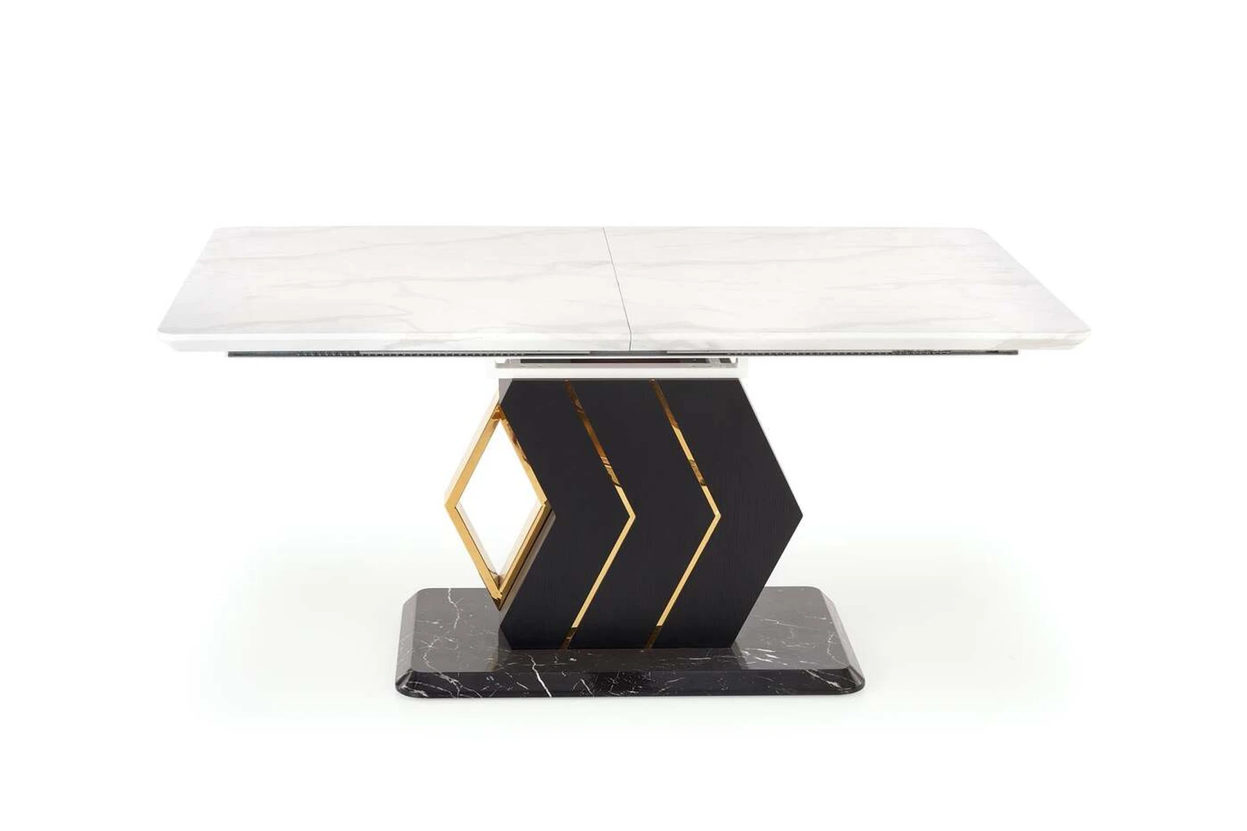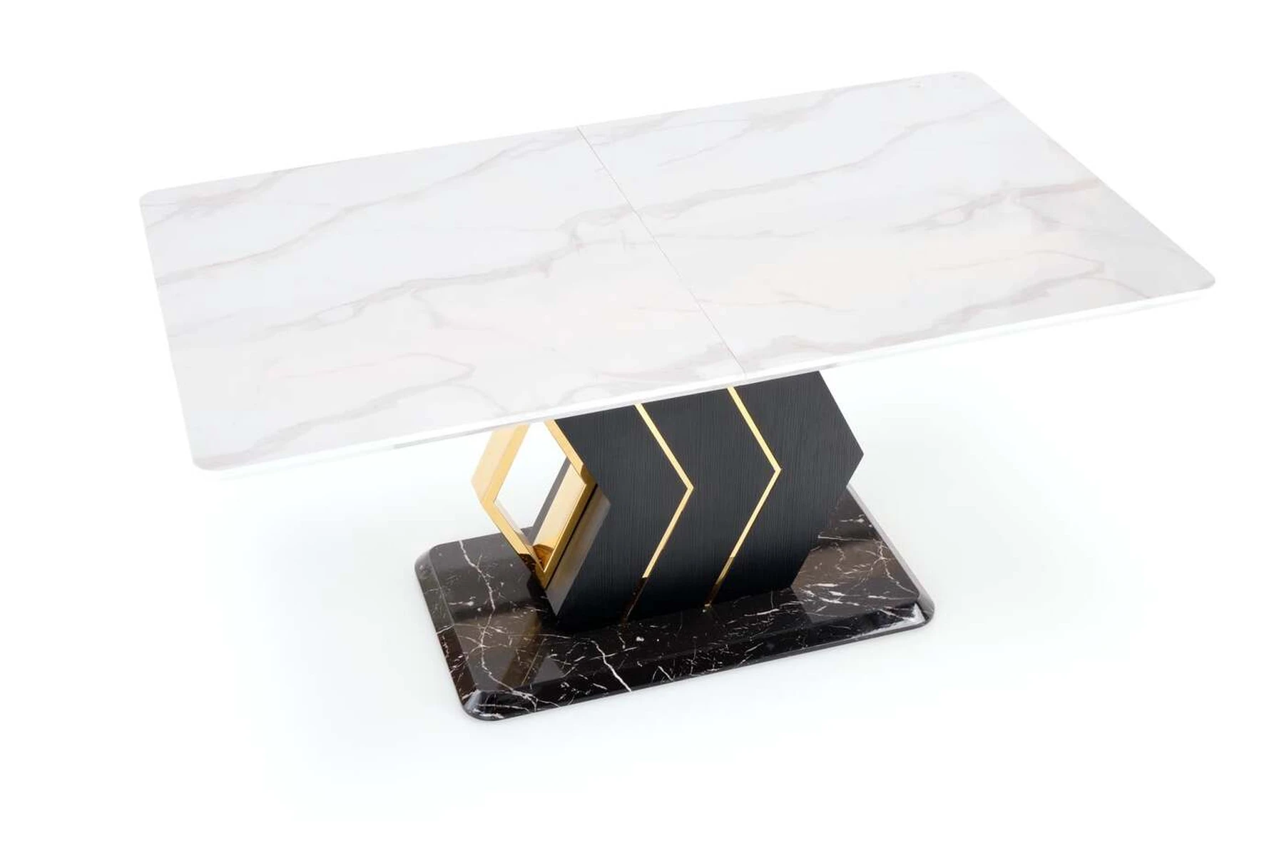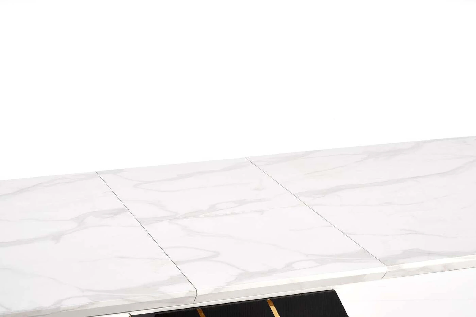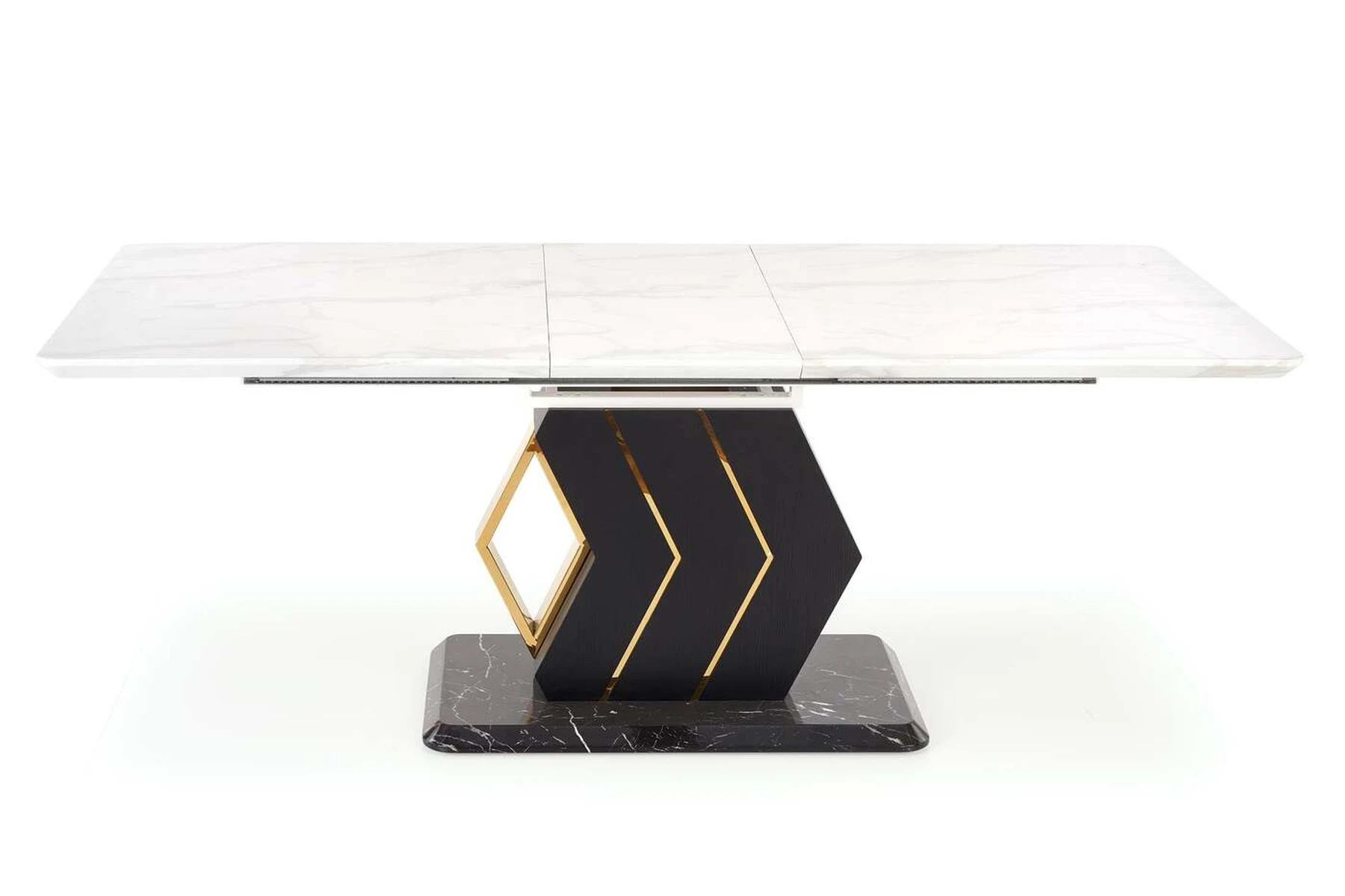 matmenys: 160-200/90/77 cm, prailginimo stalas, medžiaga: laminuotas MDF / lakuotas MDF / chromuotas plienas, spalva: viršus - baltas marmuras, kojos - juodas / auksas