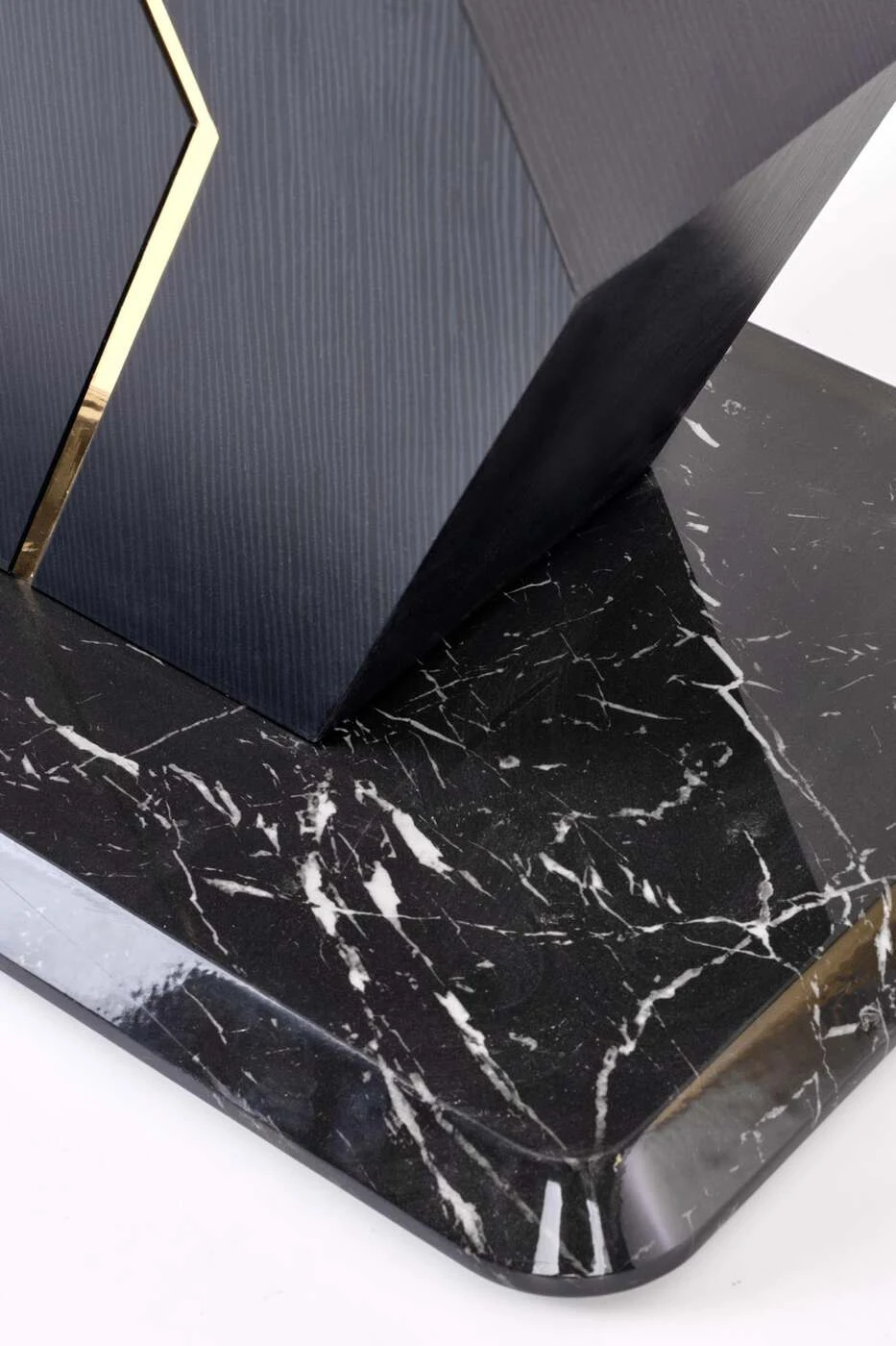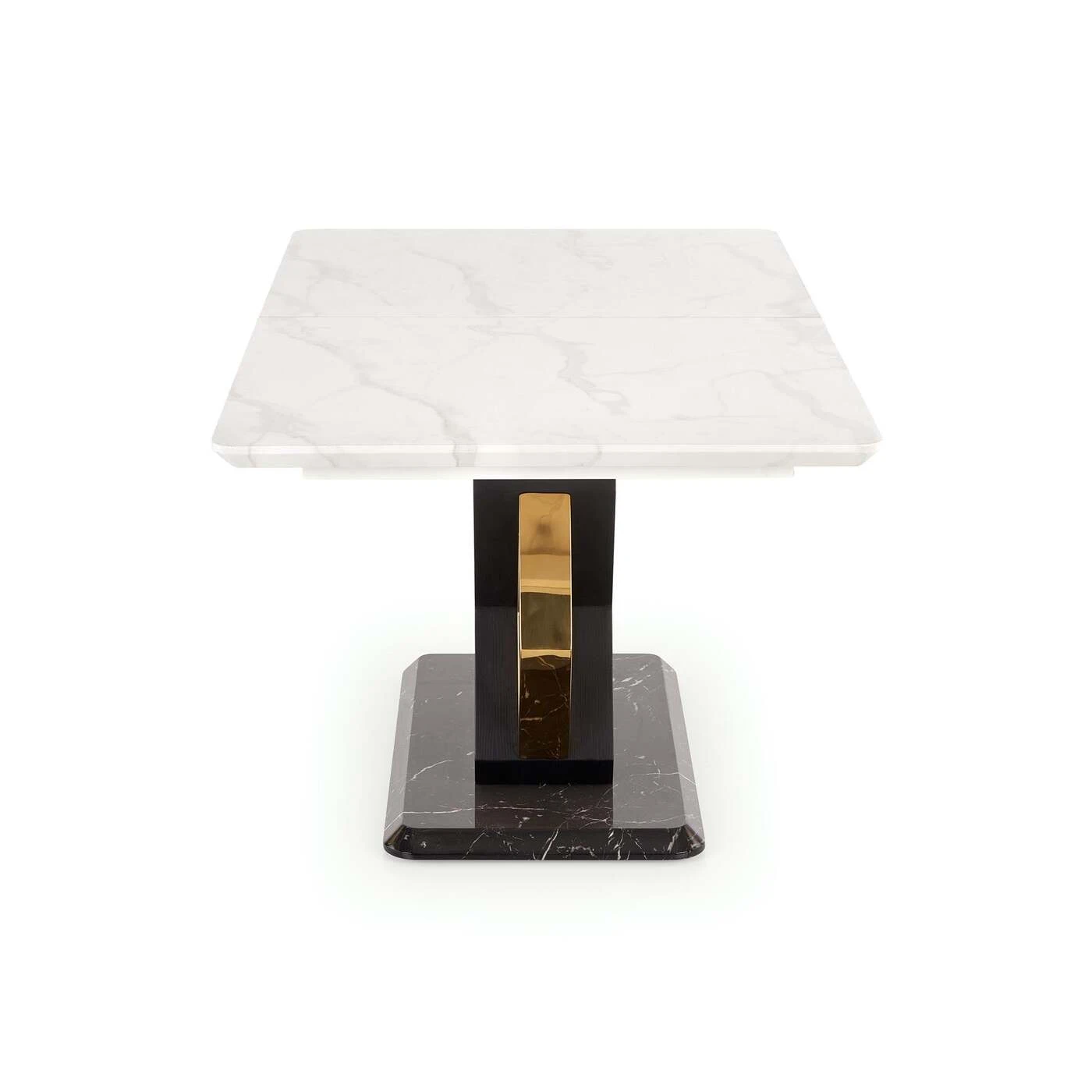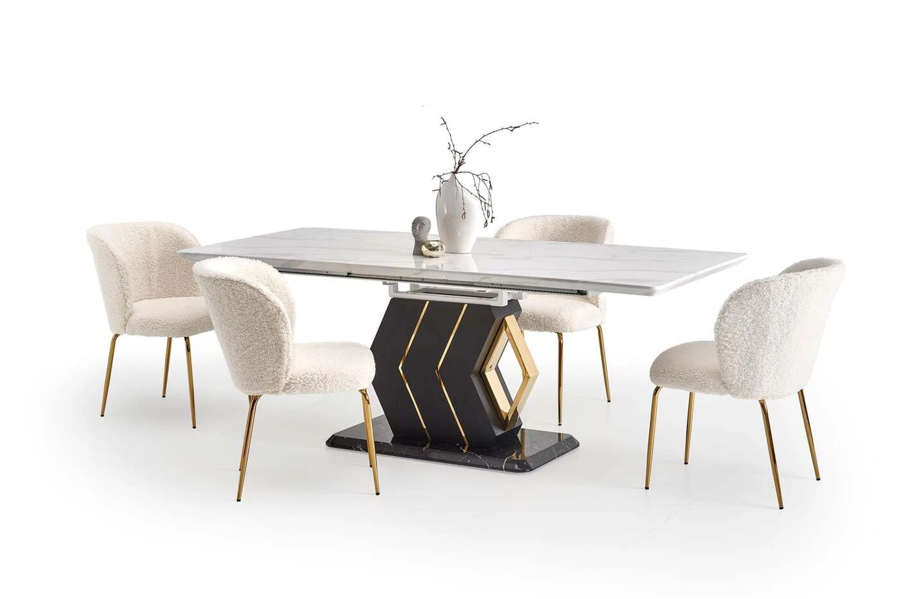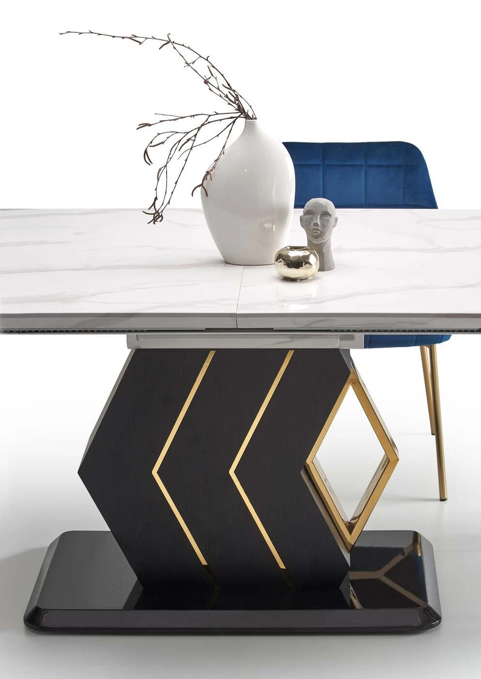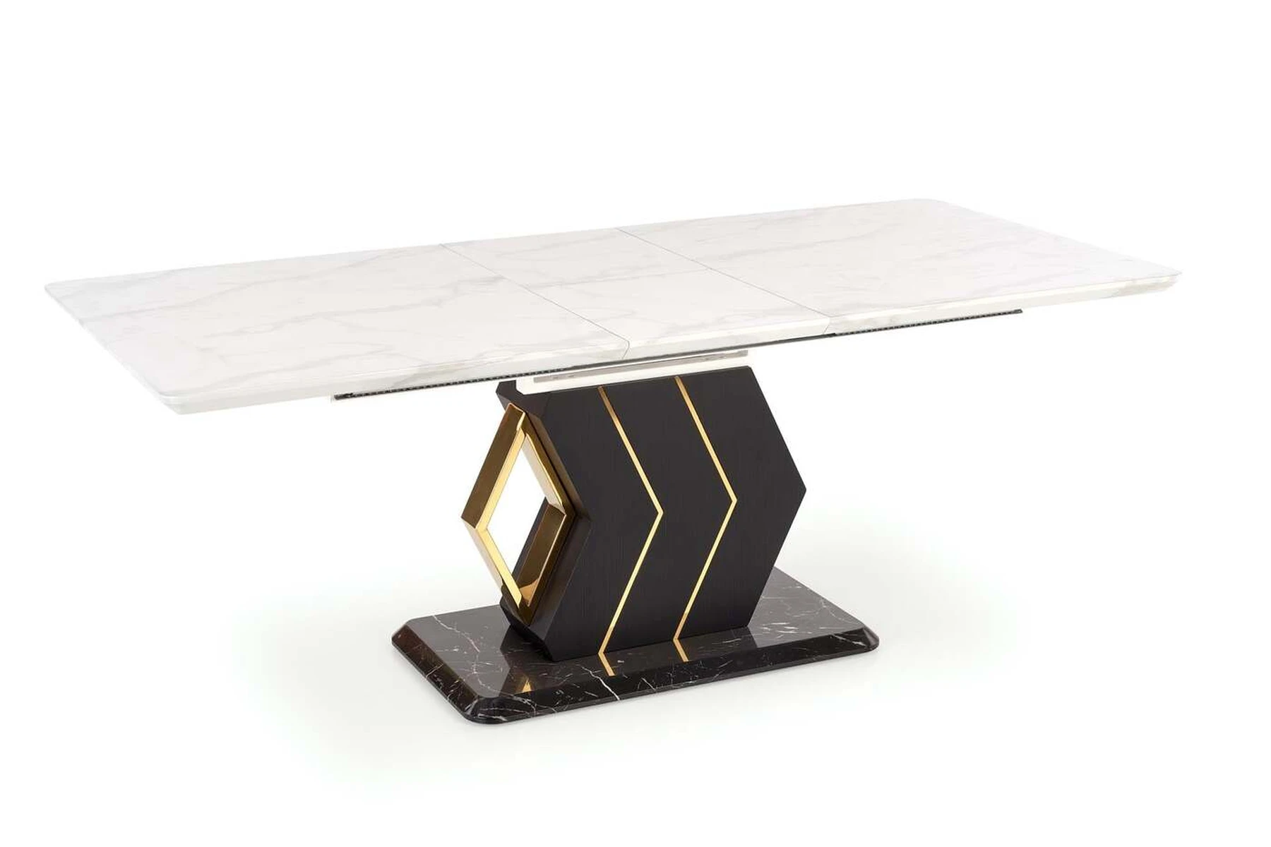 matmenys: 160-200/90/77 cm, prailginimo stalas, medžiaga: laminuotas MDF / lakuotas MDF / chromuotas plienas, spalva: viršus - baltas marmuras, kojos - juodas / auksas