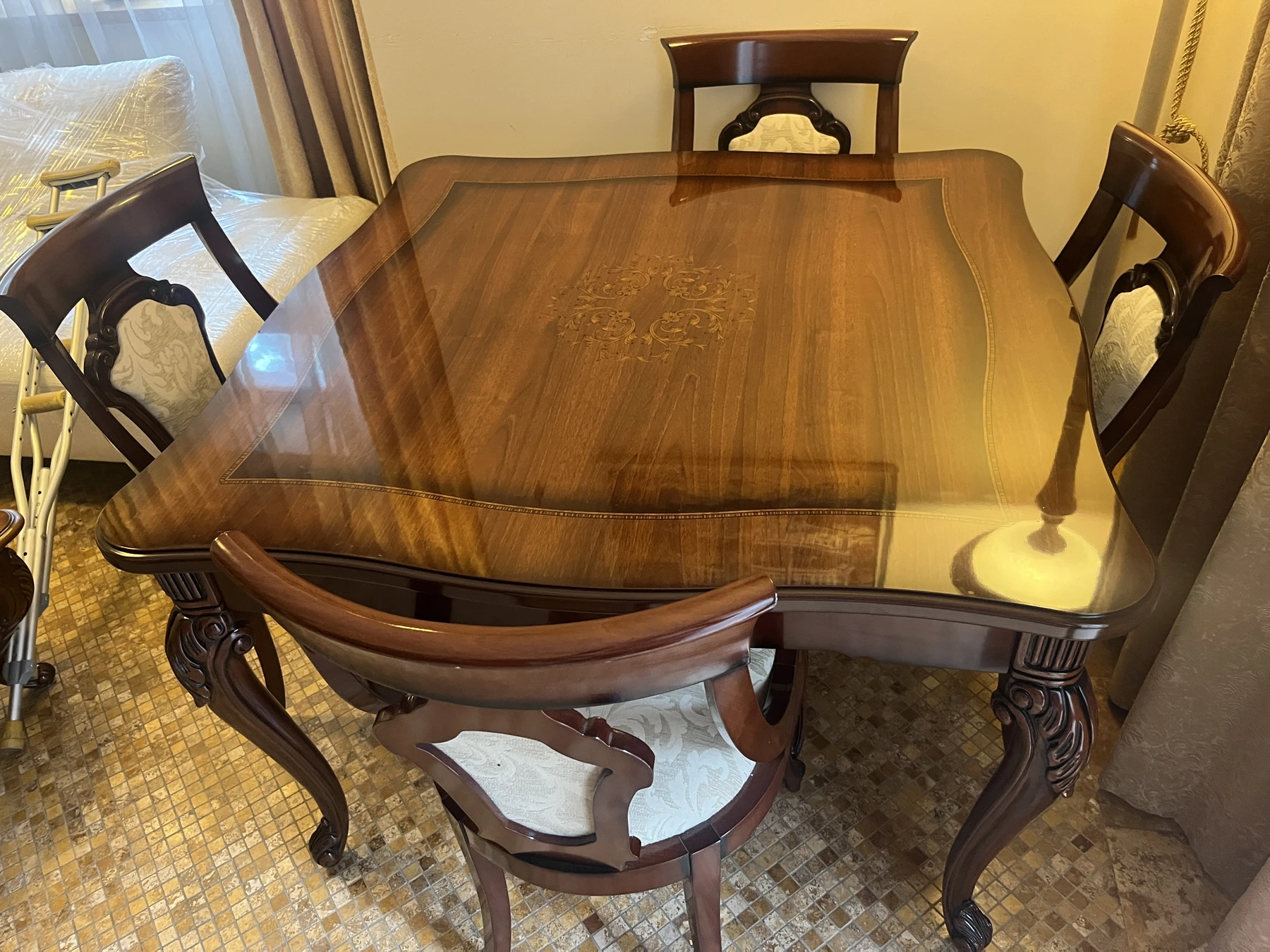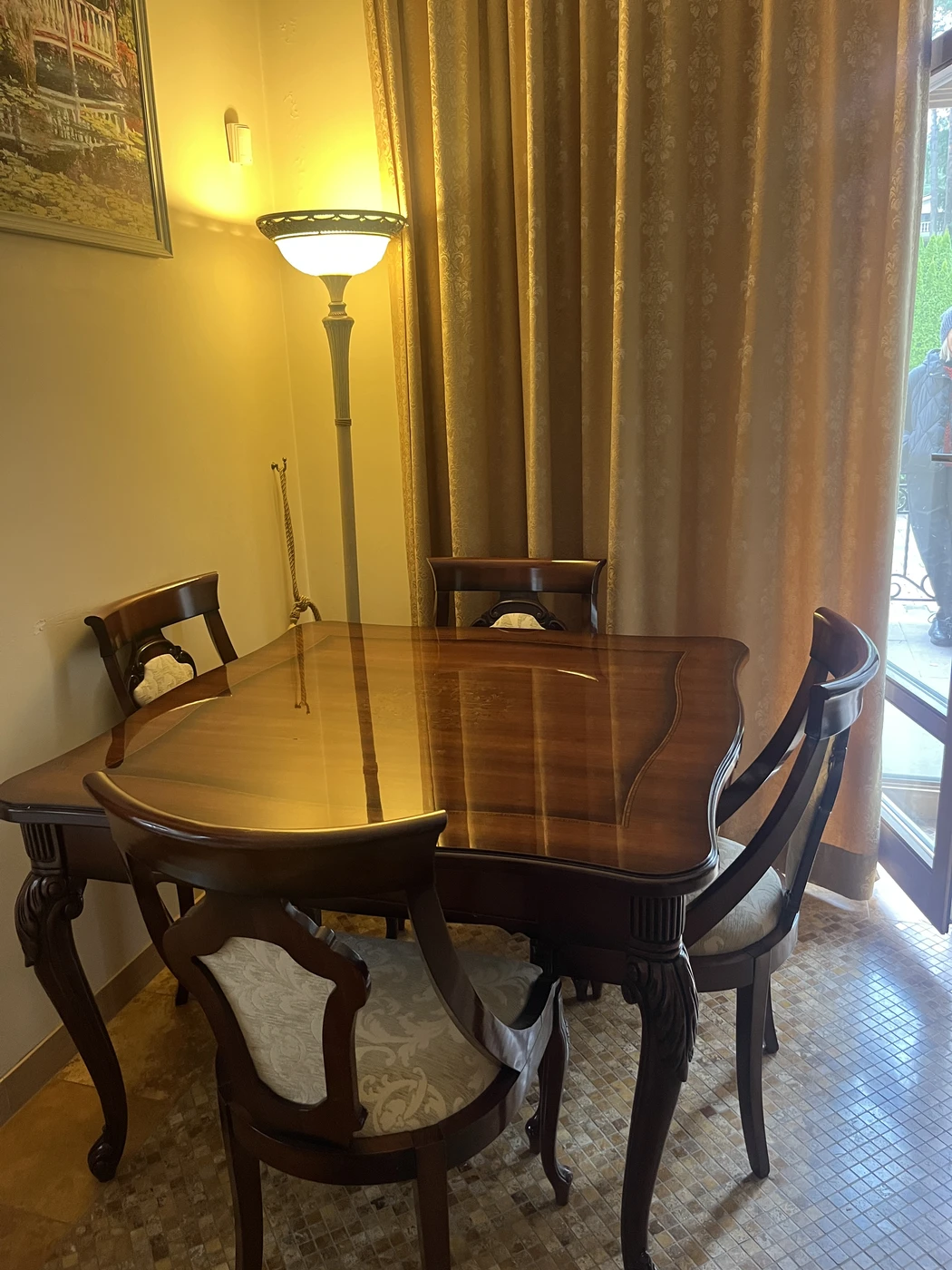 Itališkas medžio masyvo valgomojo komplektas: stalas ir septynios kėdės. Stalas prasiilgina iš abiejų pusių po 40 cm. Siųsti užklausąĮsiminti skelbimą