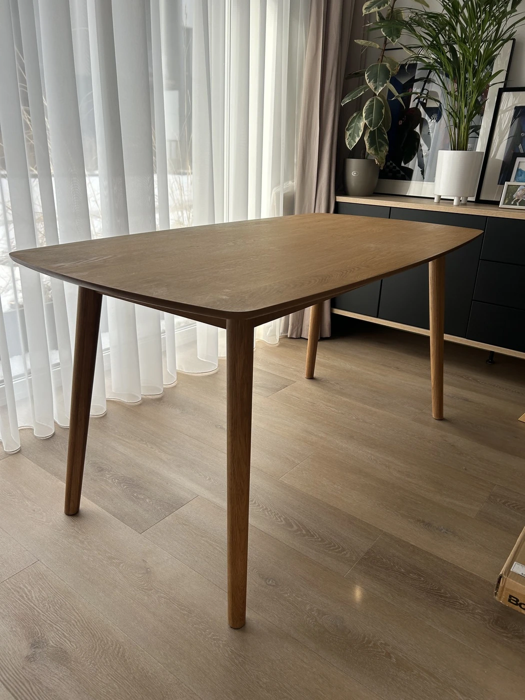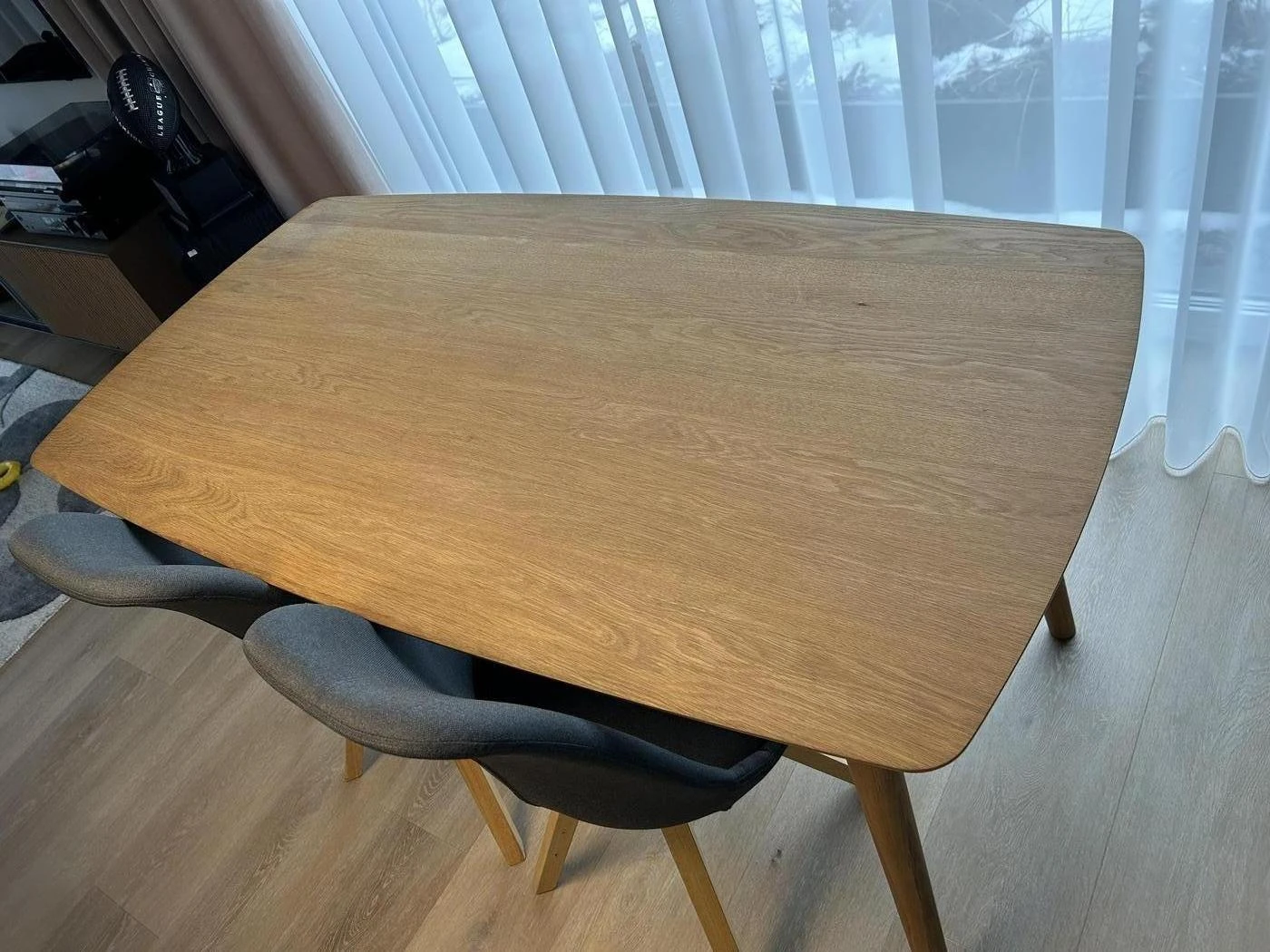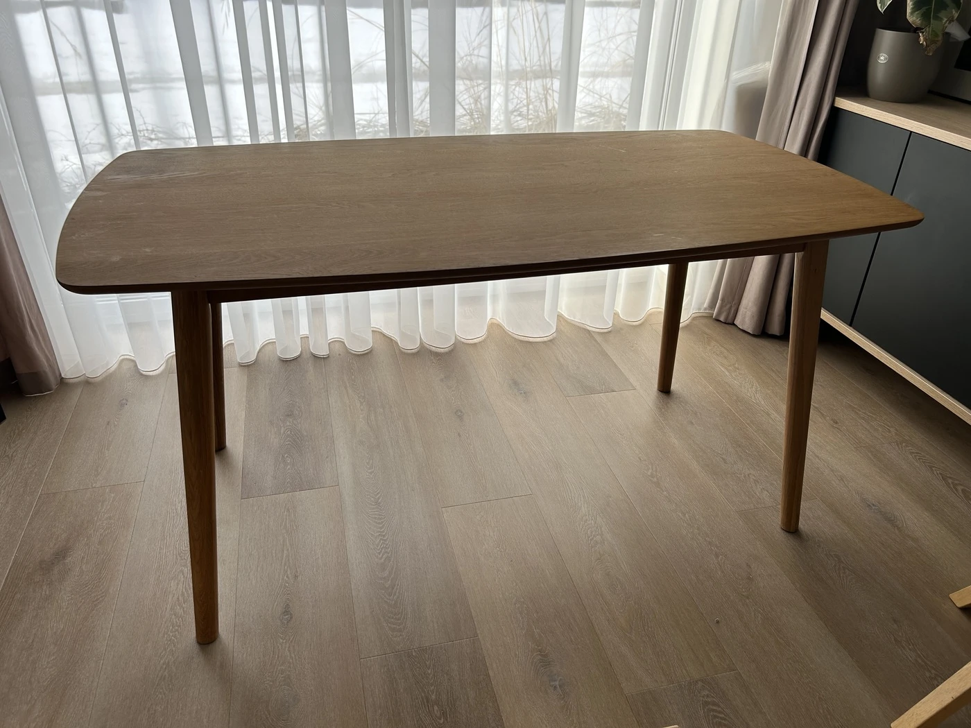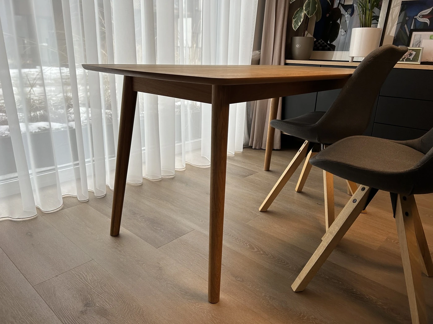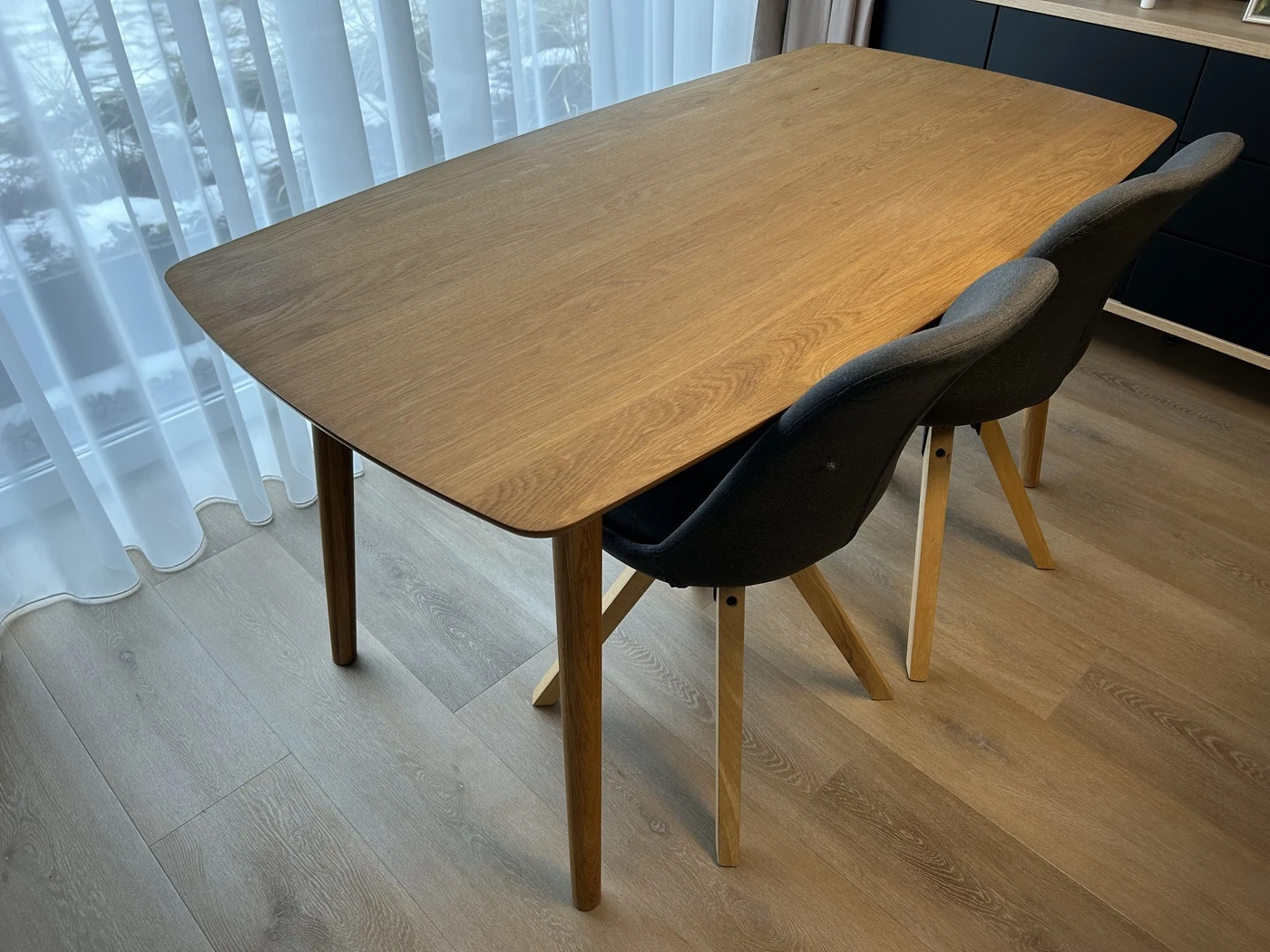 Skandinavisko dizaino valgomojo stalas su keturiom pilkos spalvos (antracito) kedemis. Kedes labai patogios net ir ilgam pasisedejimui. Stalas tinka 4-6 zmonems. Dydis: 150x80. Naudotas.