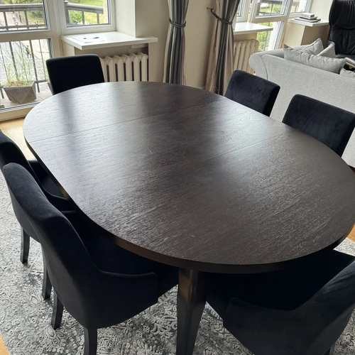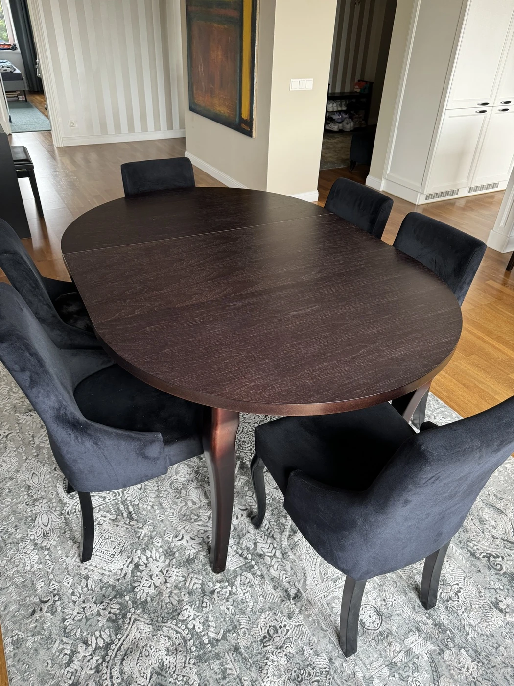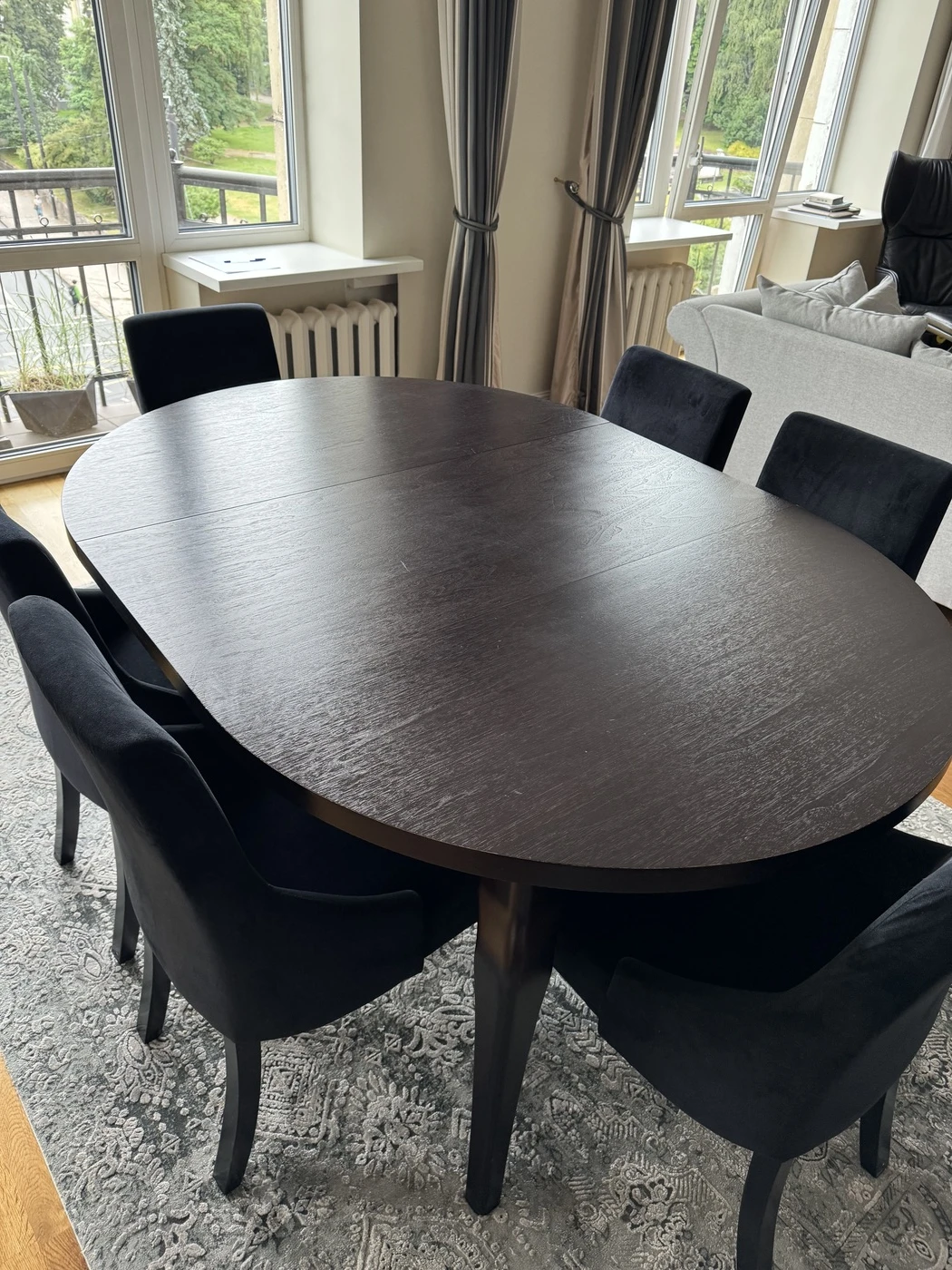 Kėdės su lengvai valoma medžiagaGeros būklės valgomasis komplektasStalas su funkcija mažinimoPatogios ir praktiškos kėdės valgomajam