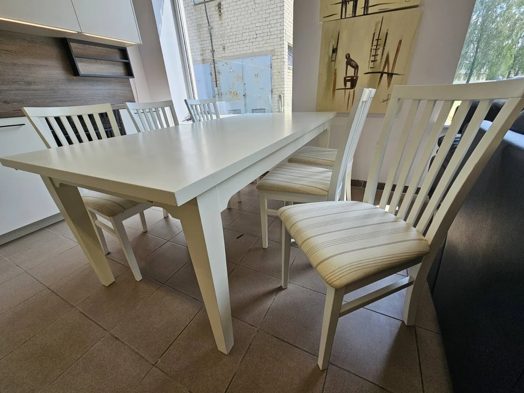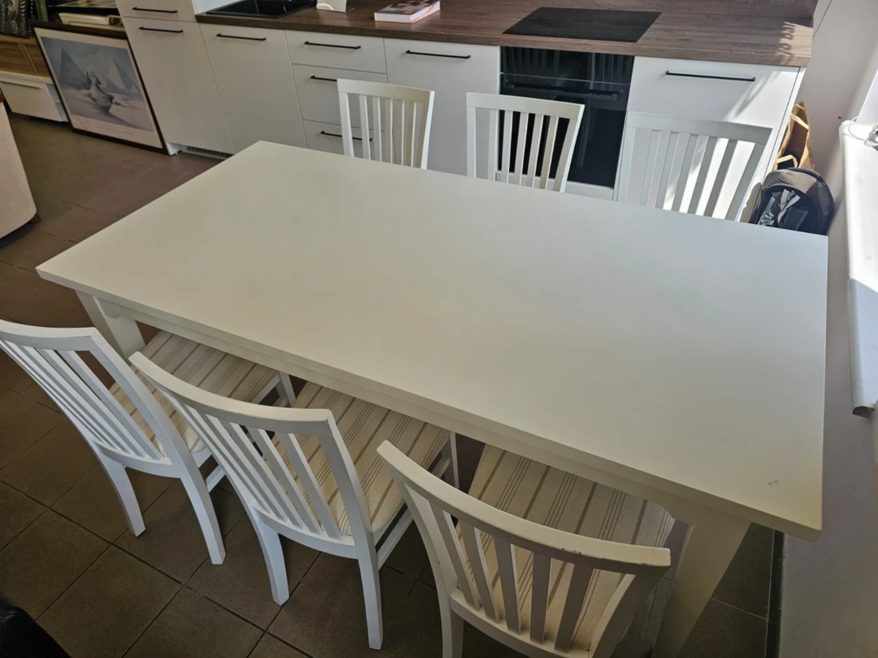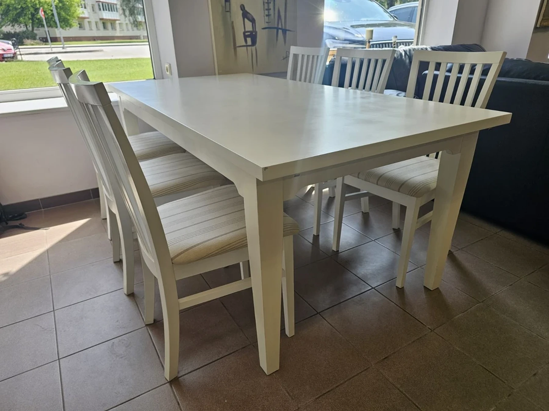 Nemokamas pristatymas visoje Lietuvoje.Išsimokėtinai be pabrangimo.Baltos spalvos valgomojo stalas su 6 kėdėmis.Išmatavimai: ilgis: 1,9 m; plotis: 0,95 m; aukštis: 0,75 m. Nesididina.Daugiau informacijos tel.+37062565222, +37065297093.Nemokamas pristatymas taikomas užsakymams nuo 300eurų.Išsamų baldo aprašymą ir video pristatymą galite peržiūrėti paspaudę nuorodą: