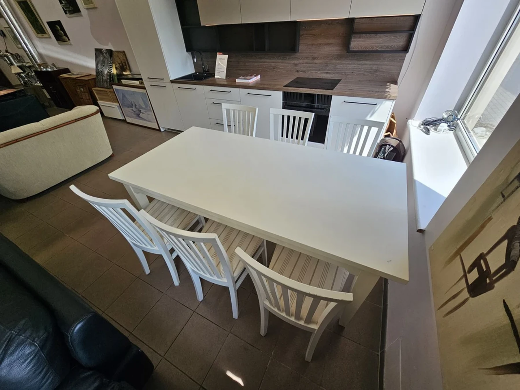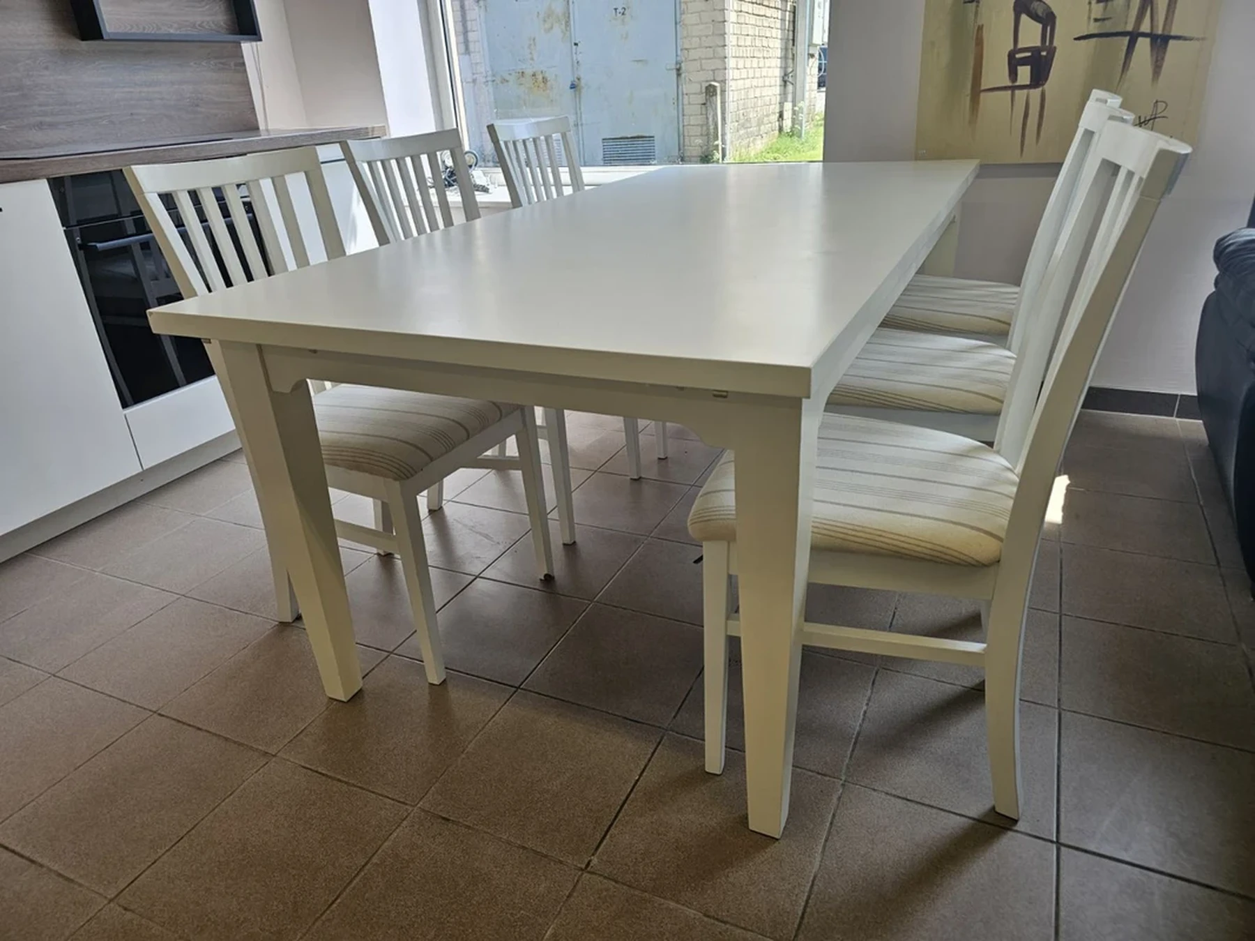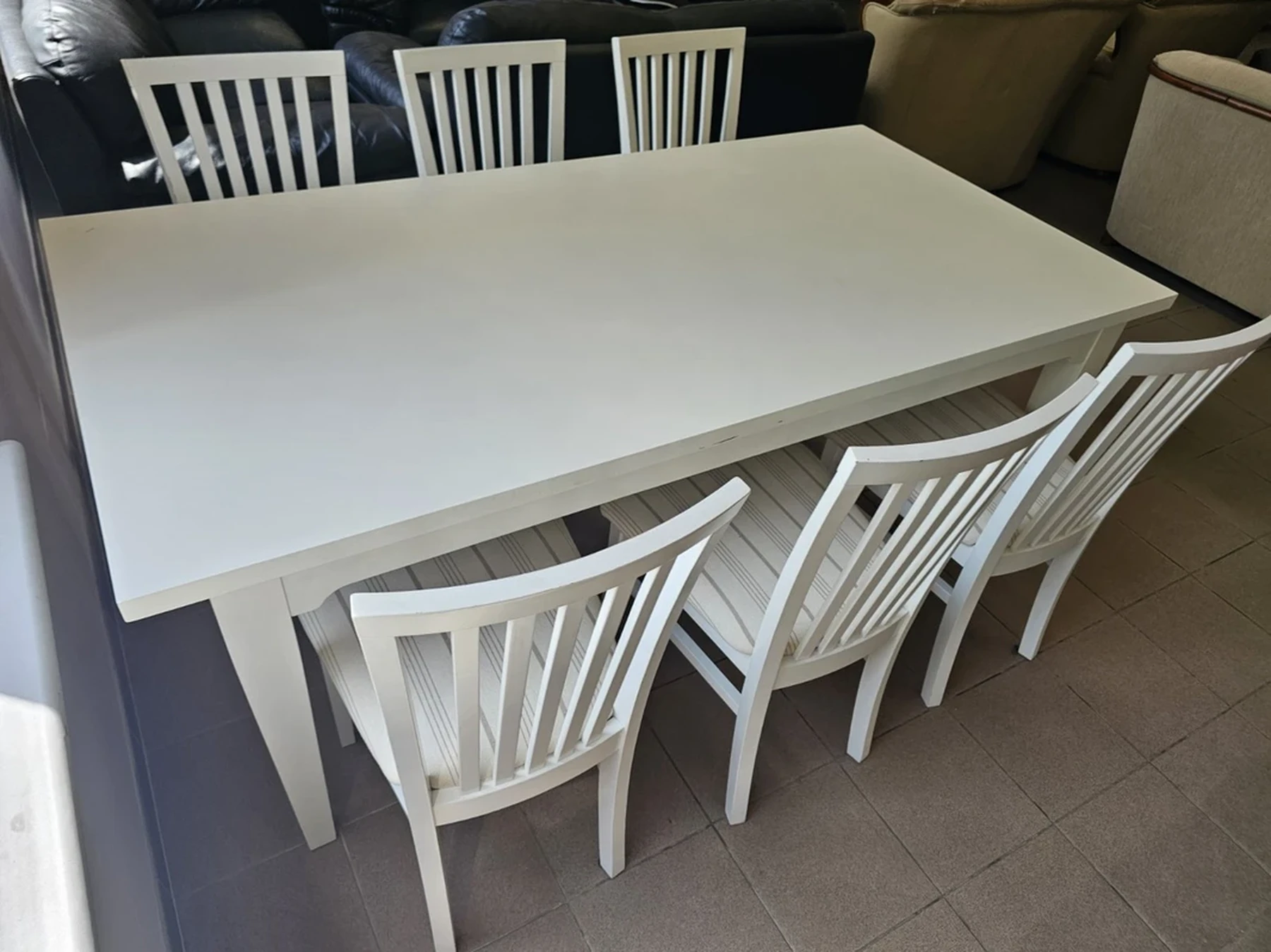 Nemokamas pristatymas visoje Lietuvoje.Išsimokėtinai be pabrangimo.Baltos spalvos valgomojo stalas su 6 kėdėmis.Išmatavimai: ilgis: 1,9 m; plotis: 0,95 m; aukštis: 0,75 m. Nesididina.Daugiau informacijos tel.+37062565222, +37065297093.Nemokamas pristatymas taikomas užsakymams nuo 300eurų.Išsamų baldo aprašymą ir video pristatymą galite peržiūrėti paspaudę nuorodą: