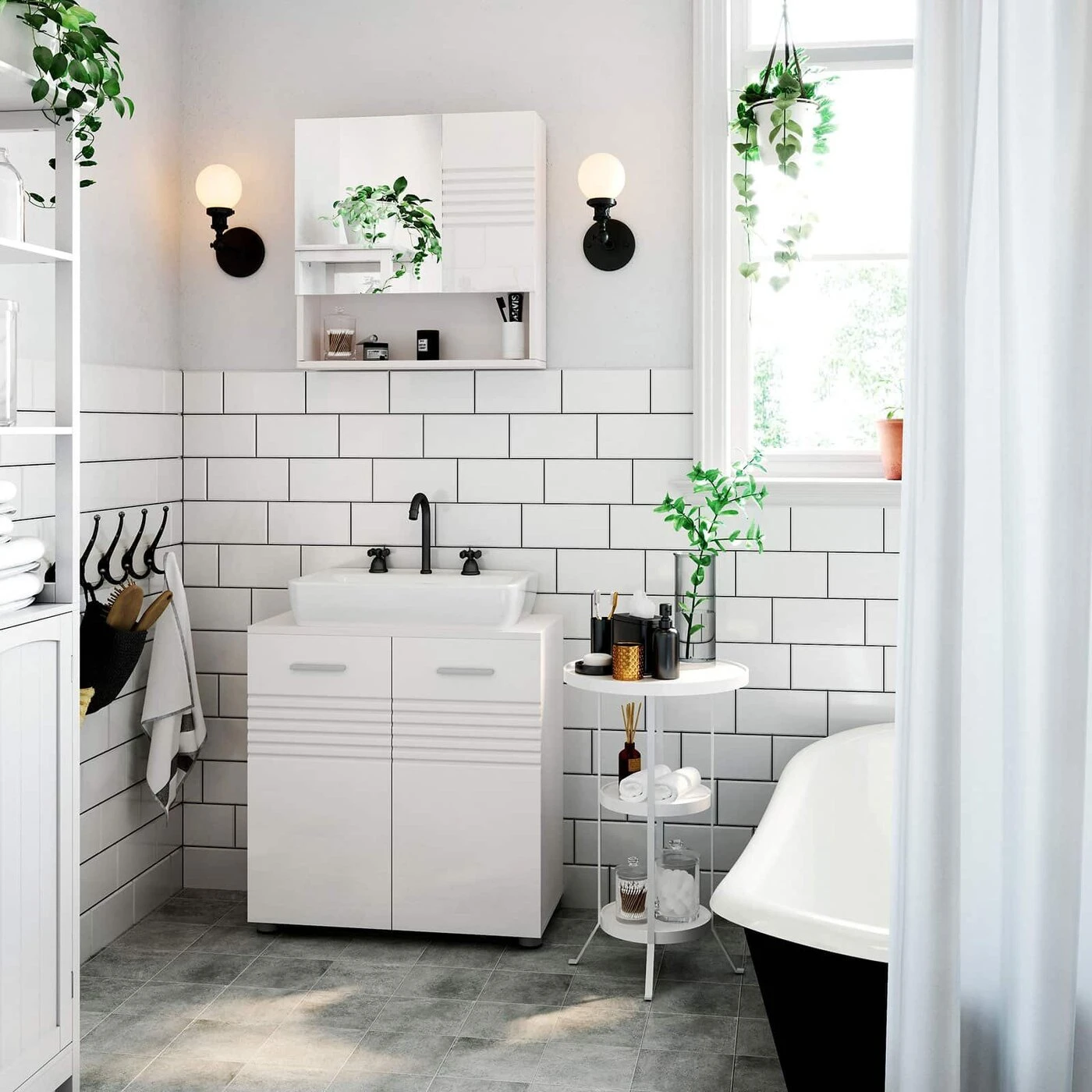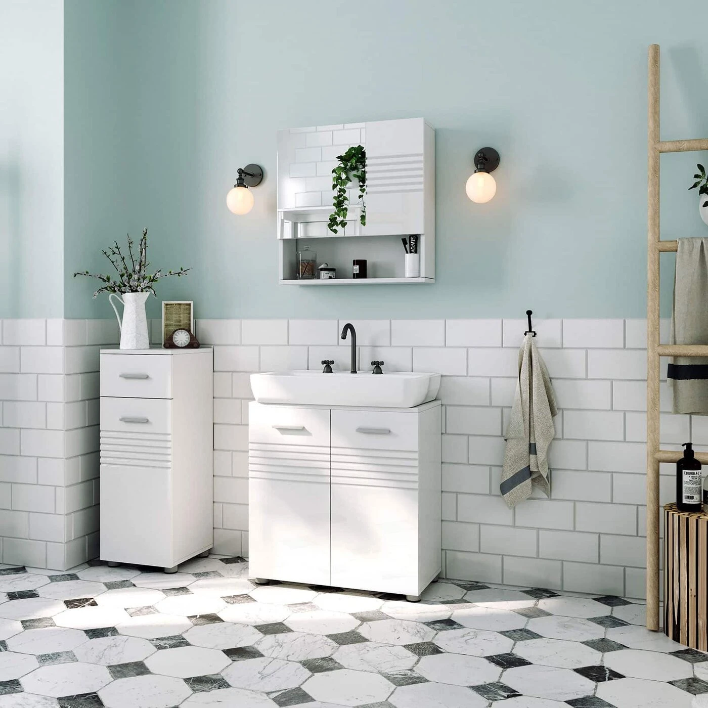 Aprašymas buvo automatiškai išverstas, gali pasitaikyti klaidų.VASAGLE dizaineriai sukūrė stilingus vonios baldus, kad galėtumėte savo vonios kambariui suteikti šviežią ir ramią išvaizdą. Čia galite atsikratyti visų rūpesčių, įkrauti baterijas ir pradėti arba užbaigti dieną teigiamai. Aukštos kokybės medžiagos Naudodami šią vonios spintelę galite ne tik parodyti eleganciją ir stilių. Baldas taip pat patvarus, nes korpusas pagamintas iš baltos, melaminu dengtos medžio drožlių plokštės. Spintelės durys taip pat pagamintos iš PVC dengto MDF ir suteikia vonios baldams efektingo blizgesio. Savo grožiu galėsite grožėtis ir grūdinto stiklo veidrodyje Iki smulkmenų.Dvi veidrodžio spintelės viduje esančios lentynos yra reguliuojamo aukščio, todėl joje galėsite laikyti įvairaus dydžio higienos reikmenis. Švelniai užsidarantys vyriai neleidžia spintelių durims užsitrenkti. Šiuolaikinis vonios kambarys nusipelno šios vonios spintelės! Pažvelkite į kitus VASAGLE vonios kambario baldus, kad sukurtumėte nuoseklų stilių savo vonios kambaryje.Informacija apie gaminį: - Spalva: Blizgi balta (durys), Matinė balta (korpusas) - Medžiaga: Melaminu dengta medžio drožlių plokštė, PVC dengta MDF, grūdintas veidrodinis stiklas - Dydis: 54 x 15 x 55 cm (P x P x A) - Svoris: 10,3 kg - Maksimali keliamoji galia: 15 kg Pristatymo apimtis: - 1 x veidrodinė spintelė - 1 x konteineris su priedais - 1 x instrukcija (DE, EN, FR, ES, IT) VASAGLE Pastabos: - Neatidėkite produktą tiesioginiams saulės spinduliams. - Produktas neturi liestis su dideliu kiekiu vandens. - Montuokite gaminį ant tvirtos sienos - Sumontavę nuimkite apsauginę plėvelę gaminio priekyje.