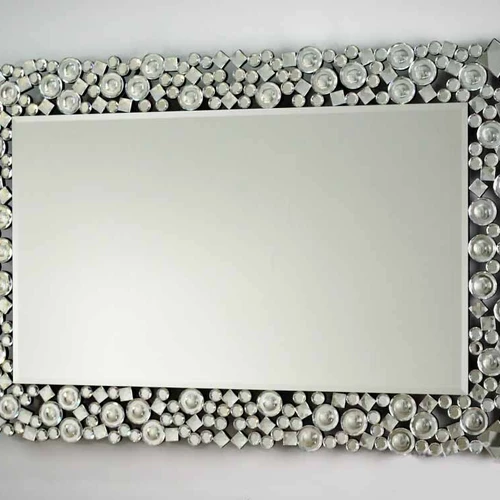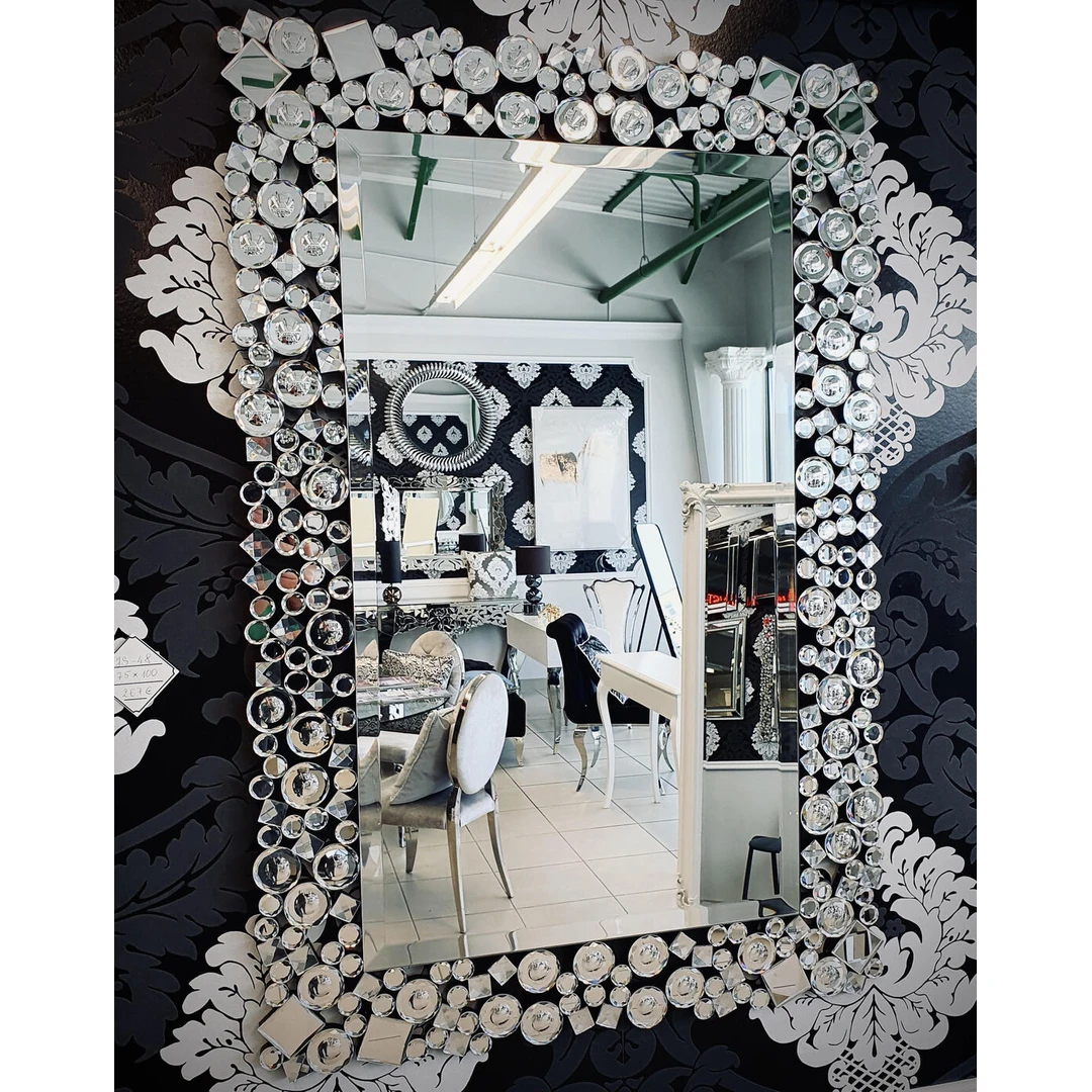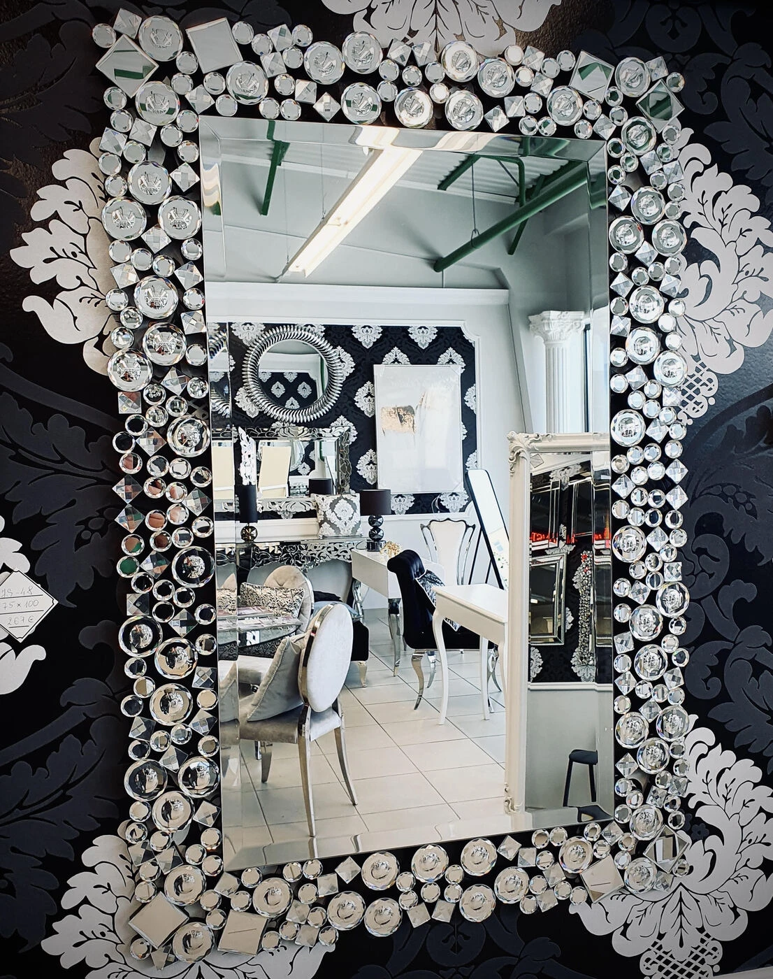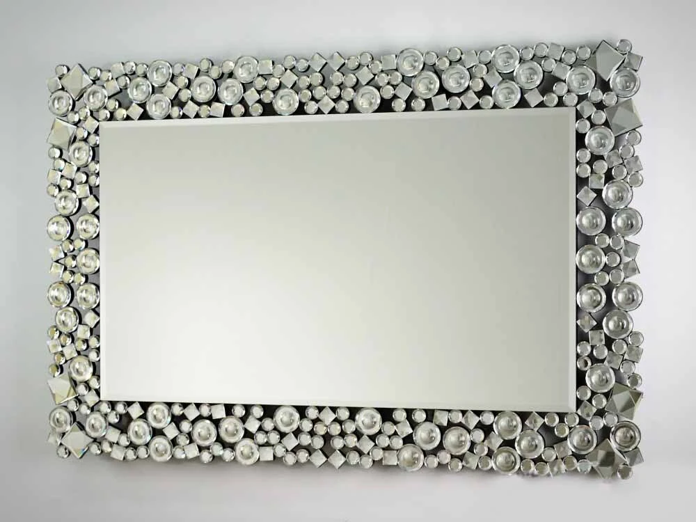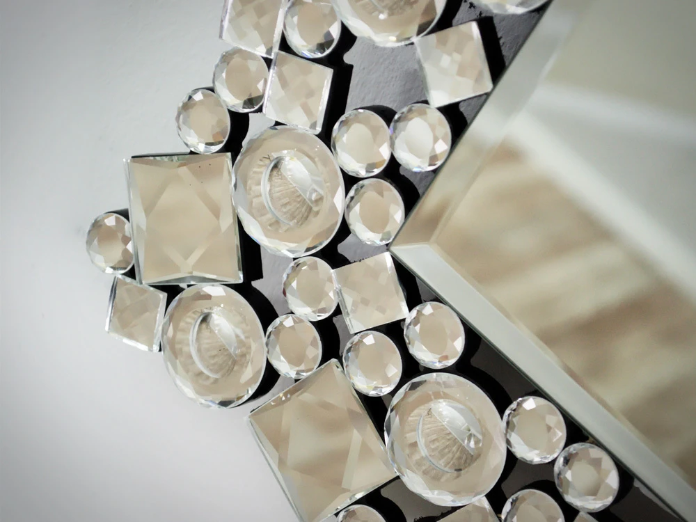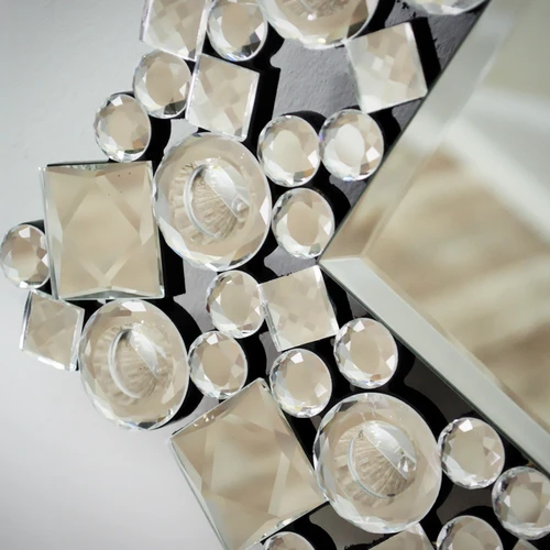 Veidrodis rėmelyje iš poliruotų, įvairių formų mirgančių kristalų. Dekoratyvus, ažūrinis rėmas gražiai pabrėš glamūrinio stiliaus interjero charakterį. Išoriniai matmenys su rėmeliu 60x90cm.