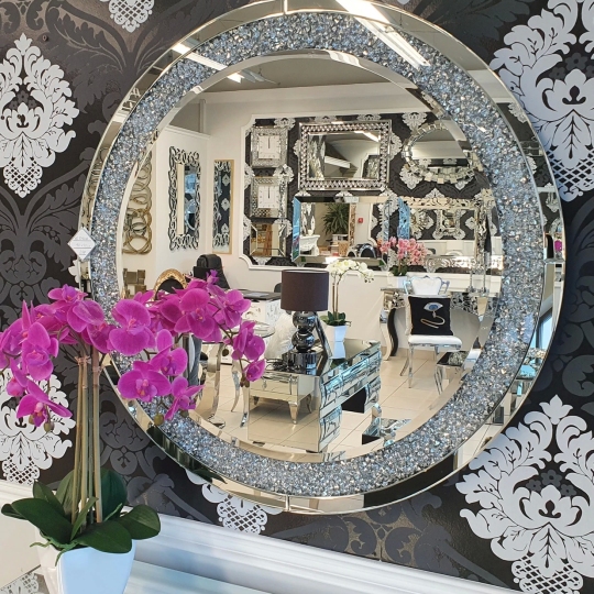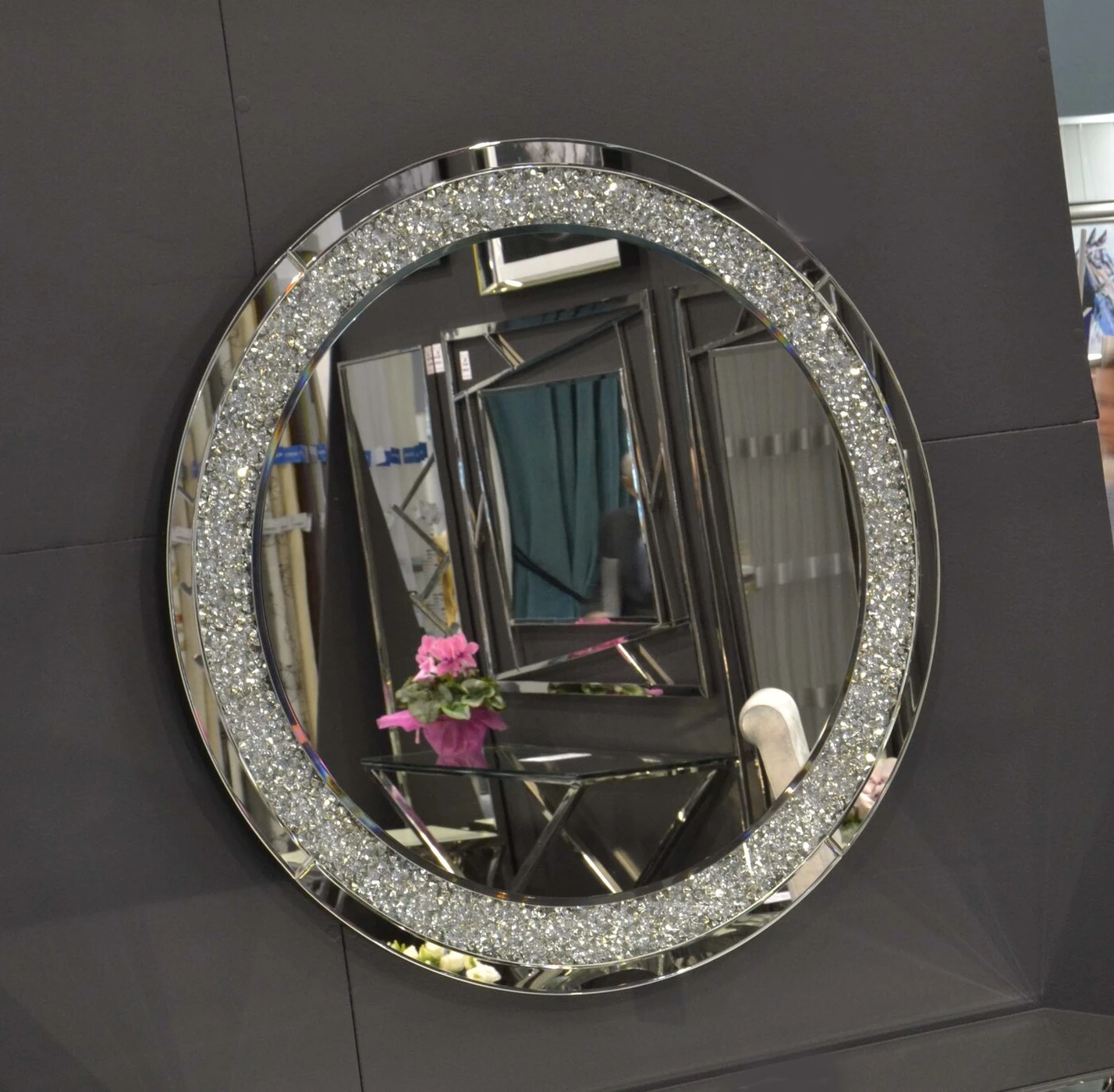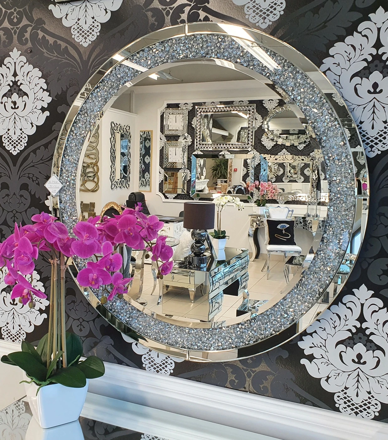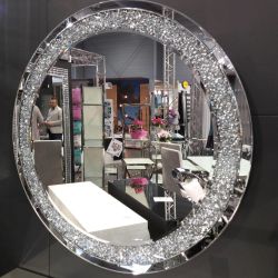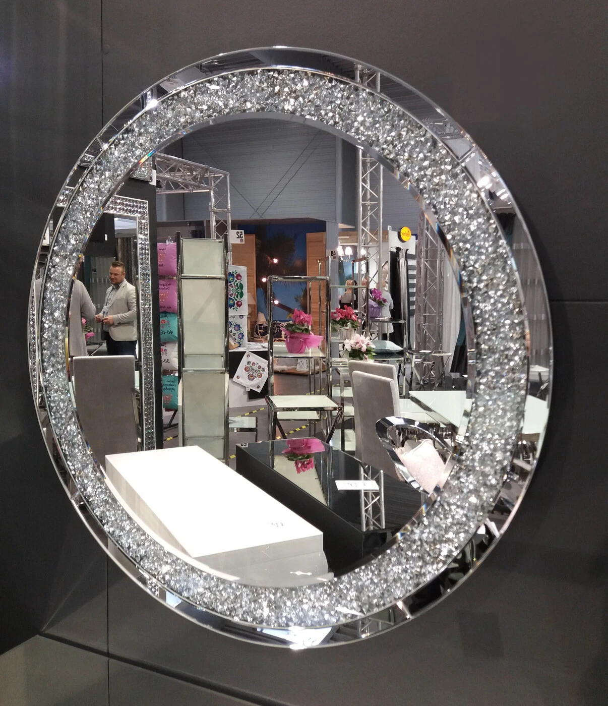 Modernus apvalus veidrodis su kristaliukais. Veidrodžio spindesys papuoš betkurį interjerą.