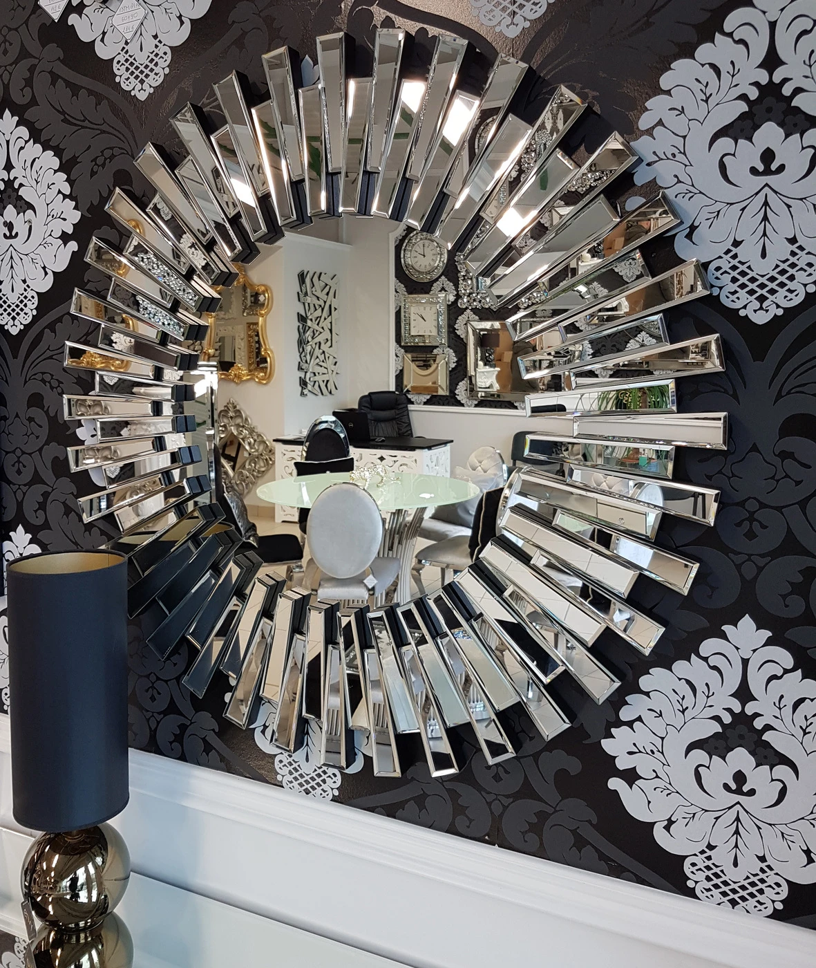 Modernus apvalus veidrodis "saulutė". Išoriniai matmenys 91x91cm, vidiniai paties veidrodžio matmenys 50x50cm. Šis veidrodis tikrai papuoš Jūsų sveitainės ar kolidoriaus interjerą.