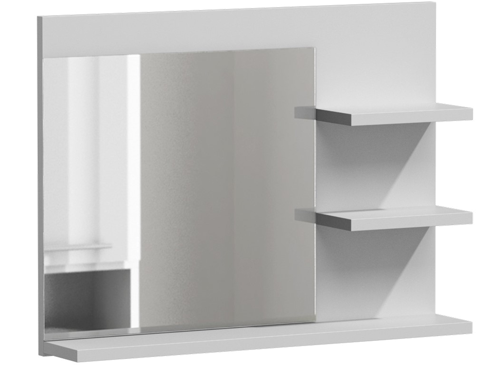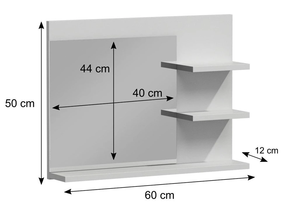 paprastas, praktiškas ir elegantiškas veidrodis su lentynomis;pagaminta iš laminuotos medžio drožlių plokštės (MDP); apsaugota nuo drėgmės; veidrodžio matmenys: plotis - 40 cm, aukštis - 44 cm; išmatavimai: plotis - 60 cm, aukštis - 50 cm, gylis - 12 cm;3 praktiškos lentynos;spalva: balta (matinė);be apšvietimo.