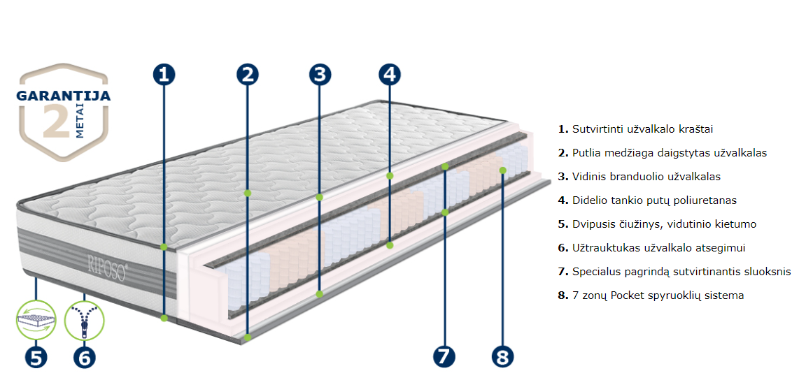 Ilgaamžių 7 zonų Pocket spyruoklių sistema suteikia komfortą ir užtikrina kokybišką miegą.