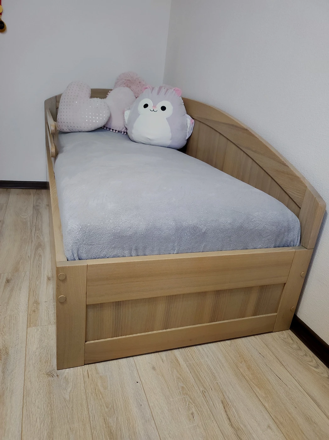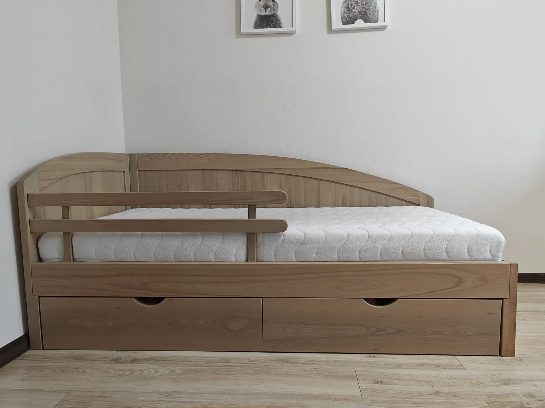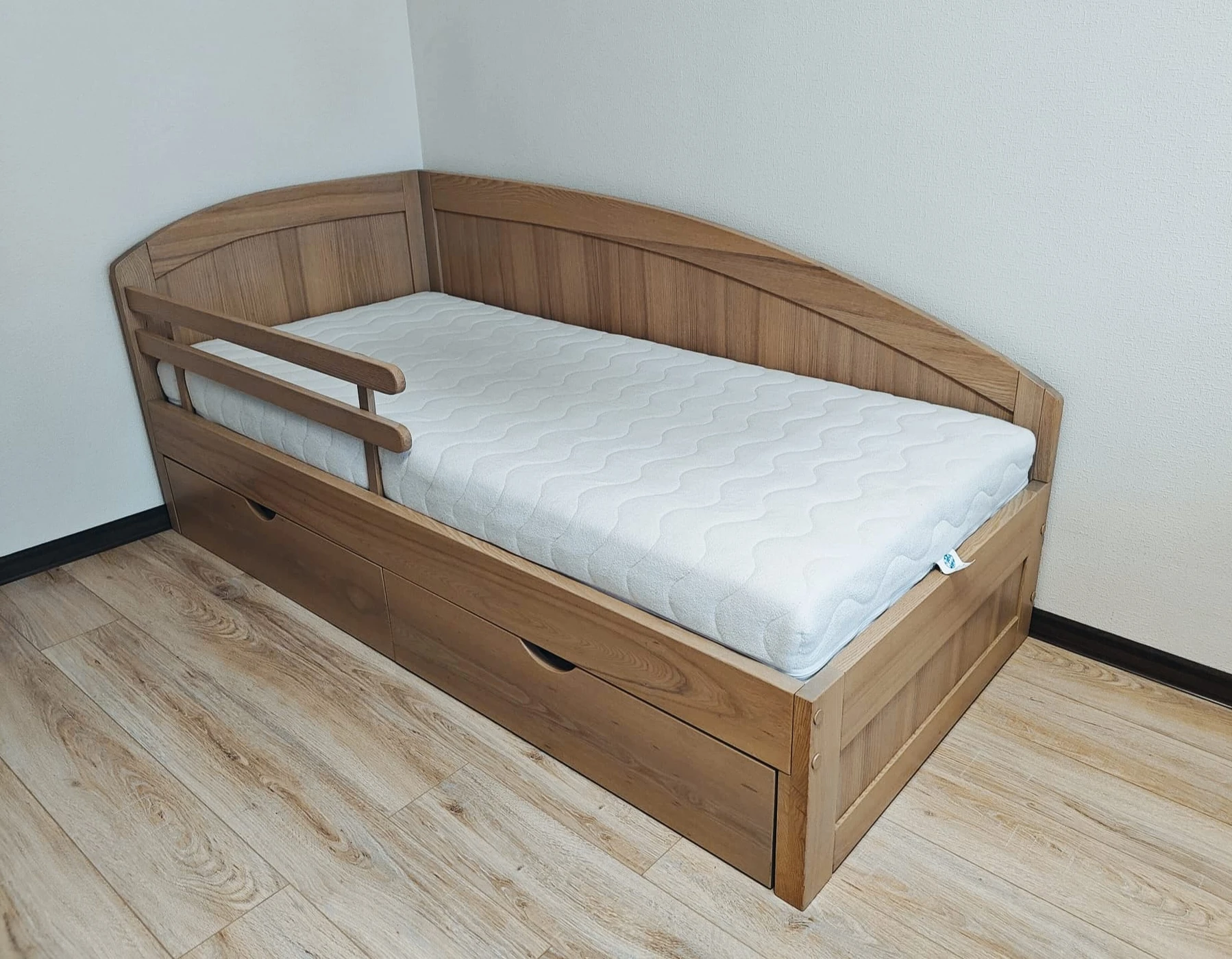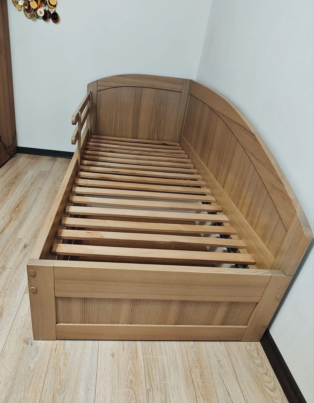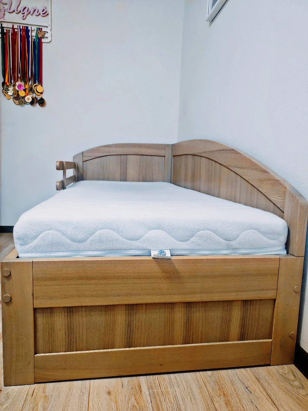 Viengulė uosio medžio masyvo lova su čiužiniu. Lova tvarkinga, be defektų.