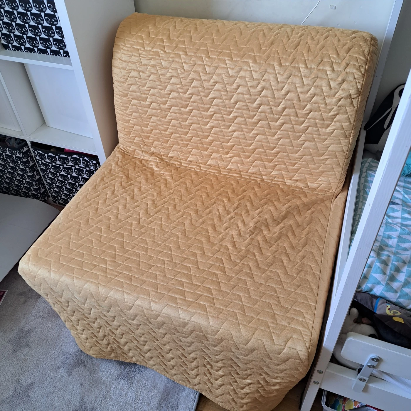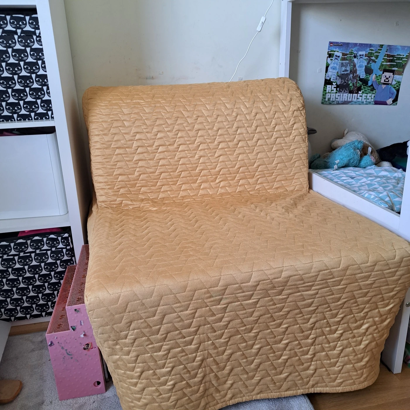 Fotelis-lova, pirkta Ikea. Sudėjus užsideda užvalkalas (kur galima keisti).