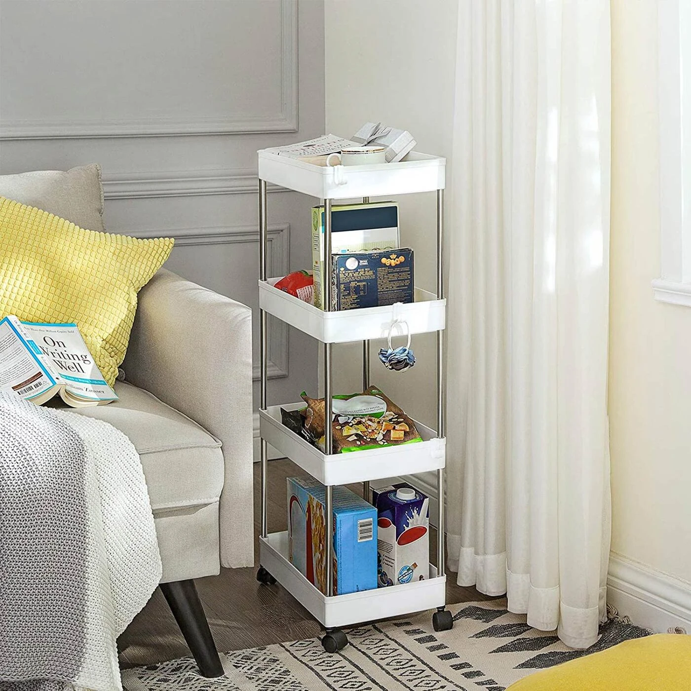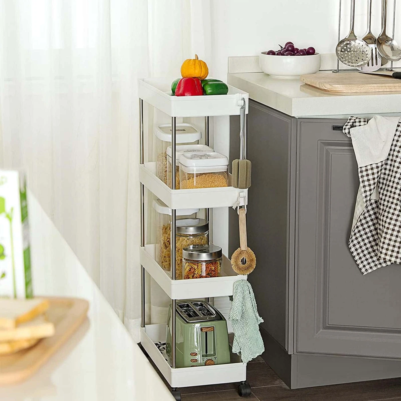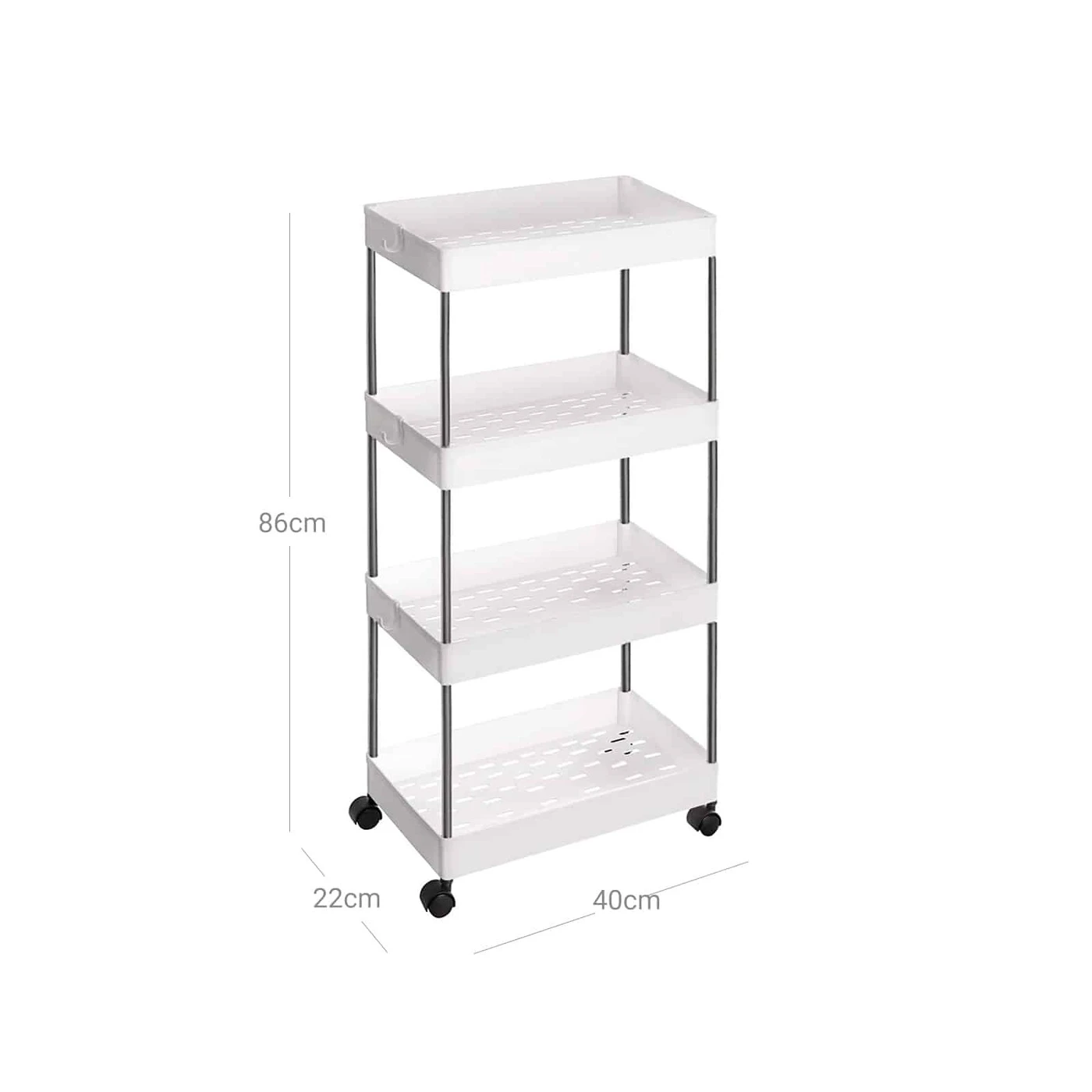 Aprašymas buvo automatiškai išverstas, gali pasitaikyti klaidų.Informacija apie gaminį: Spalva: Balta Medžiaga: PP (polipropilenas), geležiniai vamzdžiai Bendras dydis: 40 x 22 x 86 cm (P x P x A) Svoris: 1,95 kg Maks. statinė apkrova: 20 kg (5 kg vienam lygiui)Pristatymo komplektas: 1 x vežimėlis 3 x kabliukai 1 x vadovas (DE, EN, DE, FR, ES, IT) SONGMICS Pastabos: Surinkite gaminį tik taip, kaip aprašyta šiame vadove. Nenaudokite jėgos išmontuodami. Kiekviena lentyna gali būti pakrauta iki 5 kg. Ant gaminio viršaus nelaikykite sunkesnių daiktų.